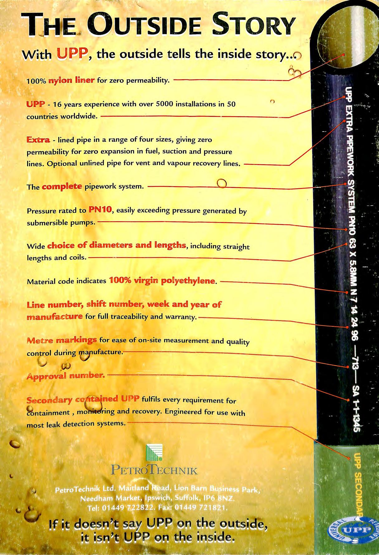 With UBB , the outside tells the inside story.. o Extra lined pipe in a range of four sizes, giving zero permeability for zero expansion in fuel, suction and pressure lines. Optional unlined pipe for vent and vapour recovery lines. =----"' Pressure rated to PN10 , easily exceeding pressure generated by submersible Wide choice of diameters and lengths , including straight lengths and coils. Material code indicates 100% virgin poByethylene . -----==-----;;:,,_Line number, s hift number, week and year of manufa,cture for full traceability and warranty. --------=..-'--------Metre mall"'kings for ease of on-site measurement and quality control during V1 ufacture .. -------------------number.-----------------Secondary ea ·ned UPP fulfils every requirement for on tainment , mo ing and recovery. Engineered for use with most leak detectio n