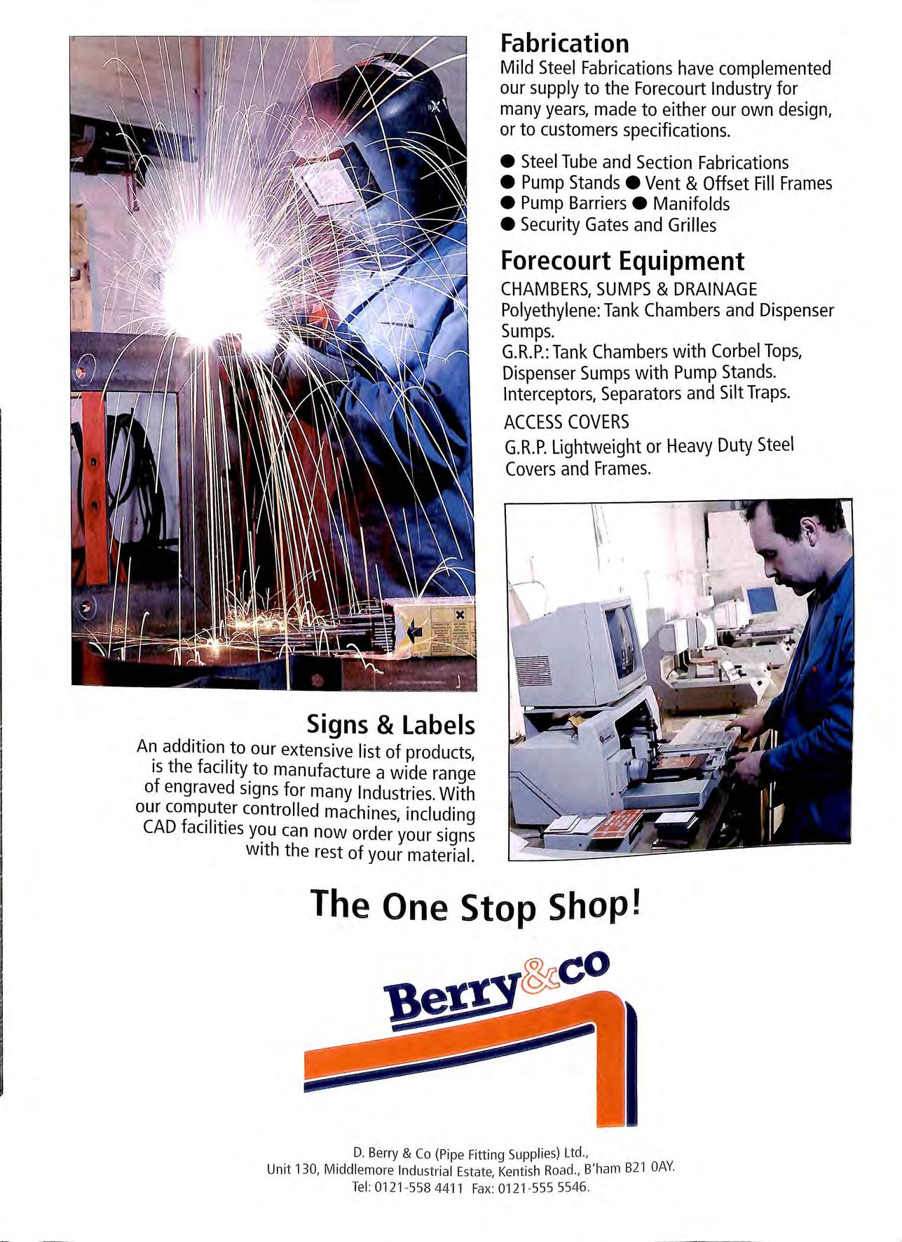 Fabrication Mild Steel Fabrications have complemented our supply to the Forecourt Industry for many years, made to either our own design, or to customers specifications. • Steel Tube and Section Fabrications • Pump Stands •Vent & Offset Fill Frames • Pump Barriers• Manifolds •Security Gates and Grilles Forecourt Equipment CHAMBERS, SUMPS & DRAINAGE Polyethylene: Tank Chambers and Dispenser Sumps. G.R.P.: Tank Chambers with Corbel Tops, Dispenser Sumps with Pump Stands Interceptors, Separators and Silt Traps. ACCESS COVERS G.R.P Lightweight or Heavy Duty Steel Covers and Frames.I\ I D. Berry & Co (Pip e Fi tti ng Supp li es) Ltd ., Uni t 130, Mi ddl emore Ind ustr ia l Estate, Kent ish Road , B' ham 821 OAY. Tel: 0121 558 44 11 Fax: 0121 555 5546