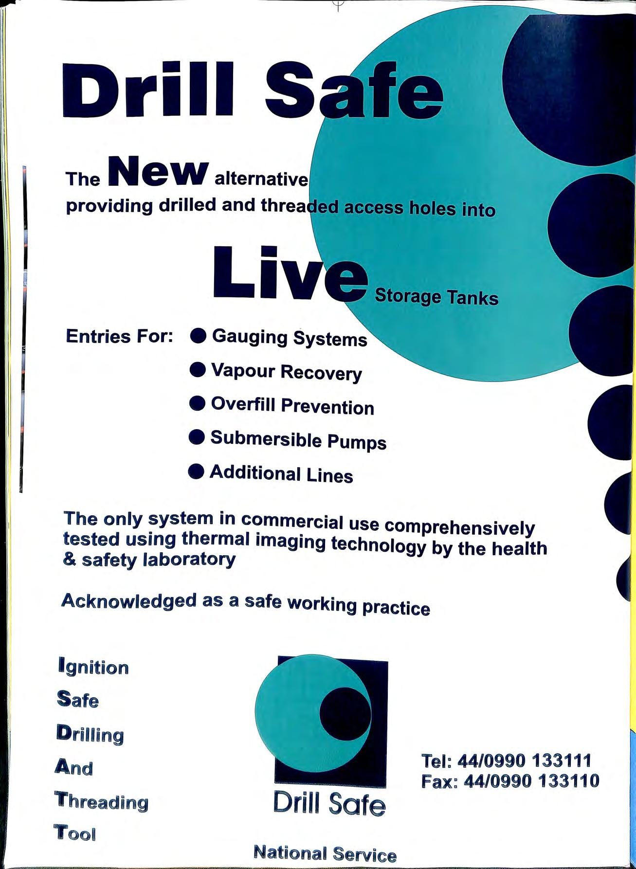 Drill S The New alternative providing drilled and threa Li Entries For: e Gauging Systems e Vapour Recovery e Overfill Prevention e Submersible Pumps e Additional Lines The on l y system in commercial use comprehensively tested using the rm a l imaging technology by the health & safety laboratory Acknowledged as a sa f e working practice Ignition Safe Drilling And Threading Tool Drill Safe National ervice Te l: 44/0990 133111 Fax: 44/0990 133110