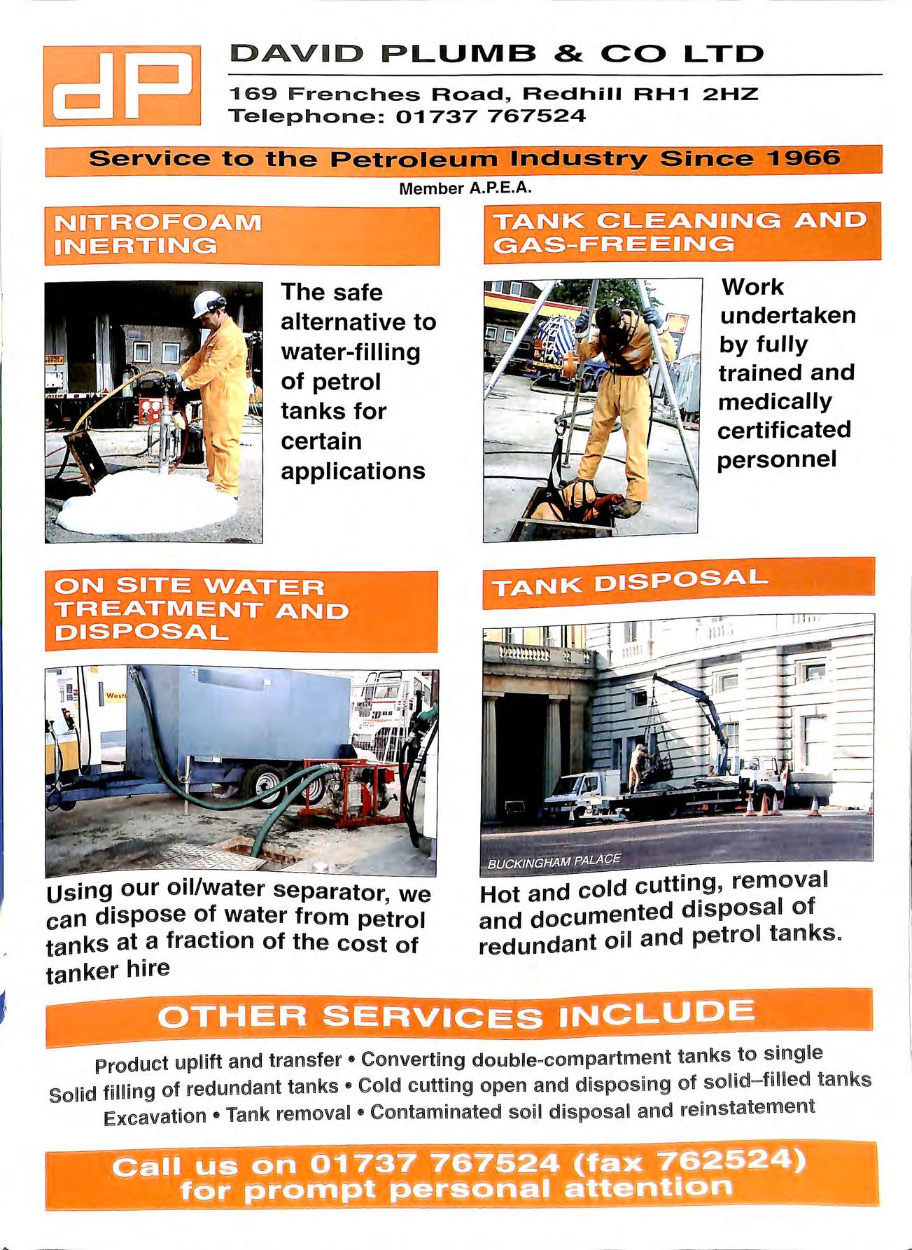 DAVID PLUMB & CC> LTD 169 Frenches Road, Redhill RH1 2HZ Telephone: 01737 767524 Service to the Petroleum Industry Si nee 196& Member A.P.E.A. The safe alternative to water-filling of petrol tanks for certain applications using our oil/water separator we can dispo s e of water from petrol tanks at a fraction of the cost of tanker hire Work undertaken by fully trained and medically certificated personnel Hot and cold c uttin g , re moval and docum e nted di s p osal of redundant oil and p e tr o l t an k s Product up lift and transfer • Converti ng double-compartme n t ta n ks to s i ngle So ii d fi lling of redundant tanks • Cold cutting open and d i spos i ng of so i id - f med ta n ks Excavatio n •Tank re mova l • Co ntam in ated so il d i sposa l a n d re i nst ateme n t