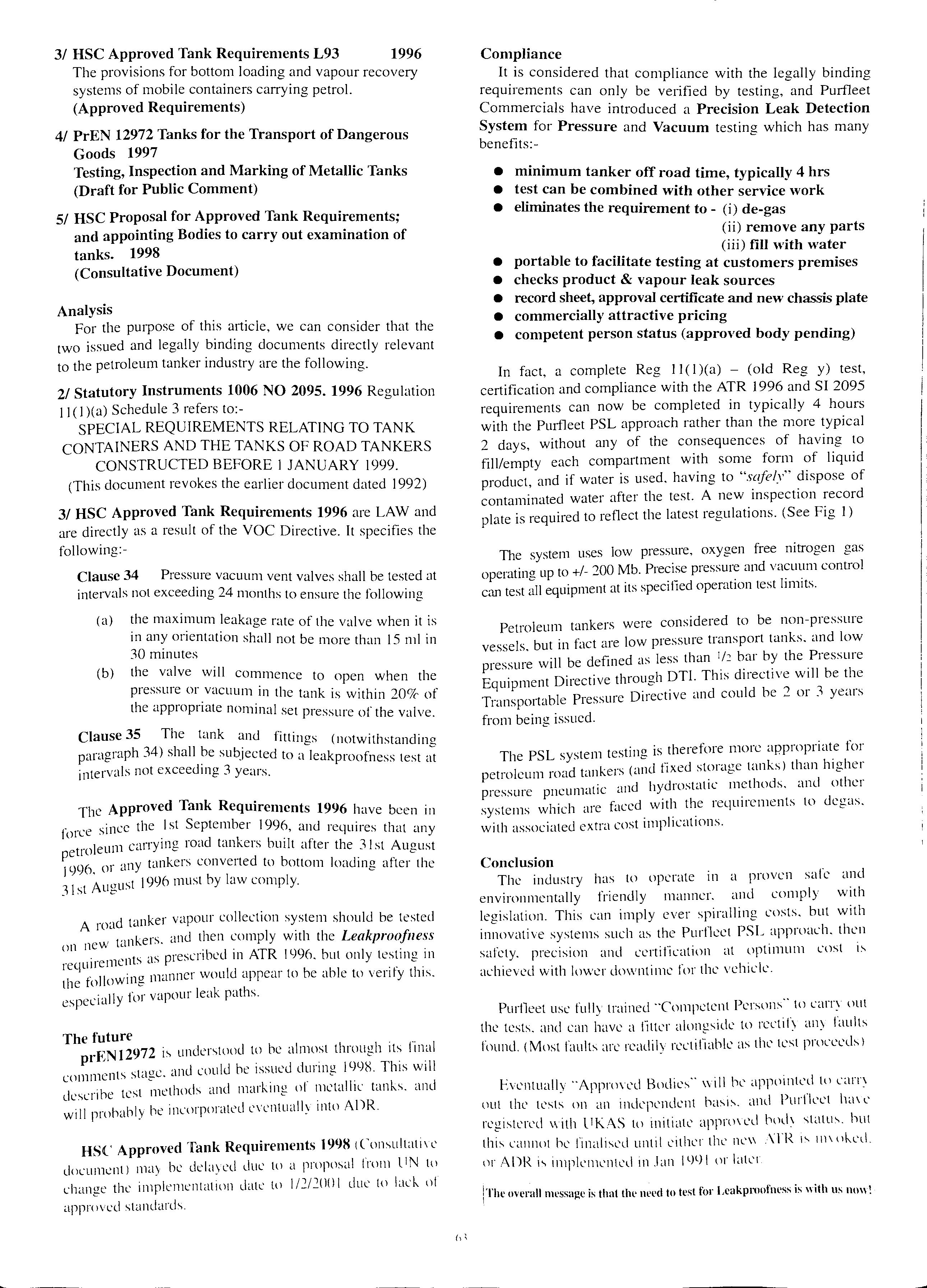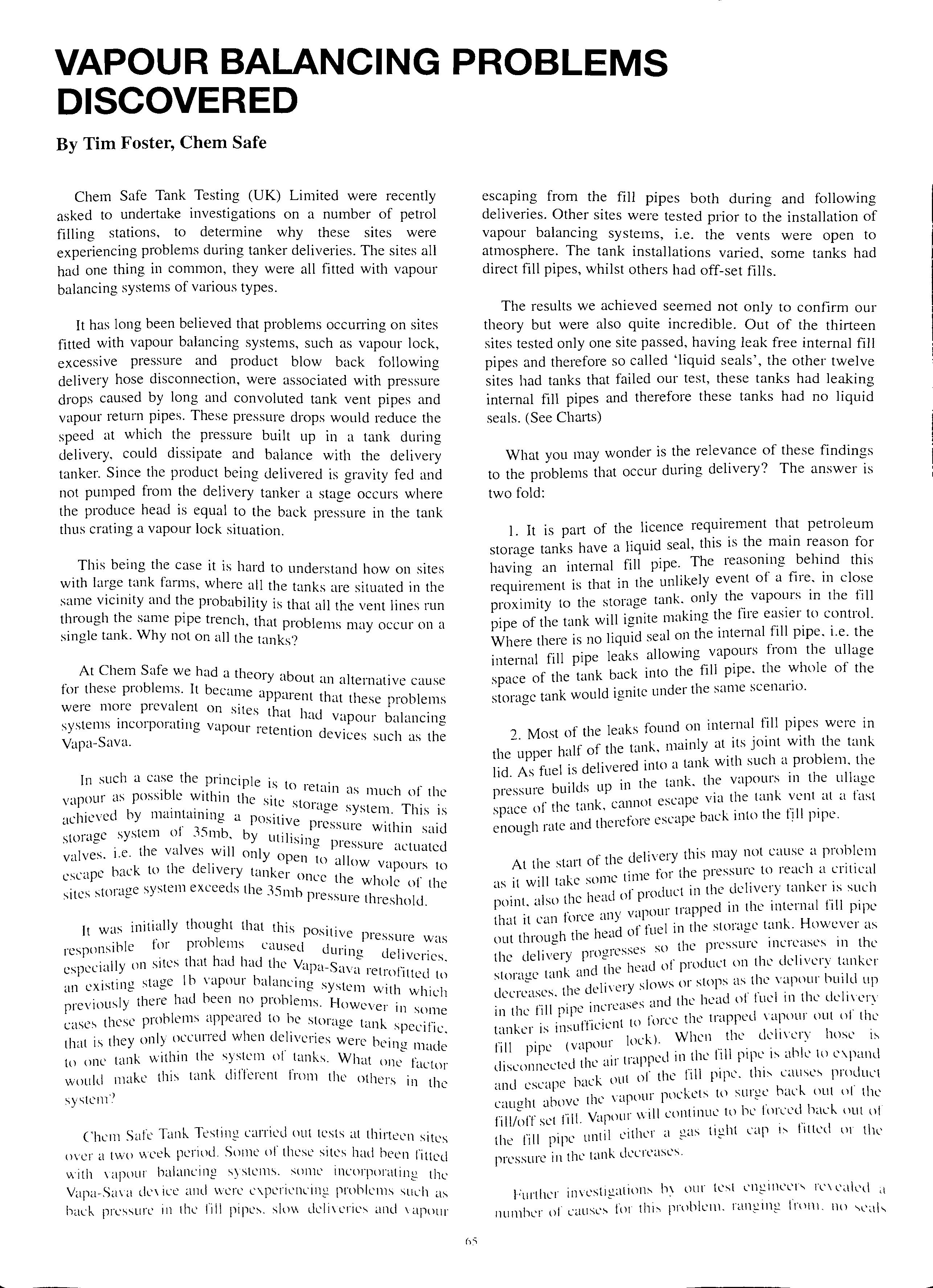 Chem Safe Tank Testing carried out tests at thirteen sites over a two week period. Some of these sites had heen rittcd with vapour balancing systems. some incorporating the Vapa-Sa\ a dl'\ ice and were experiencing problems sud1 as hack pressure in the rill pipes. sl\l\\ delinTies and \apour