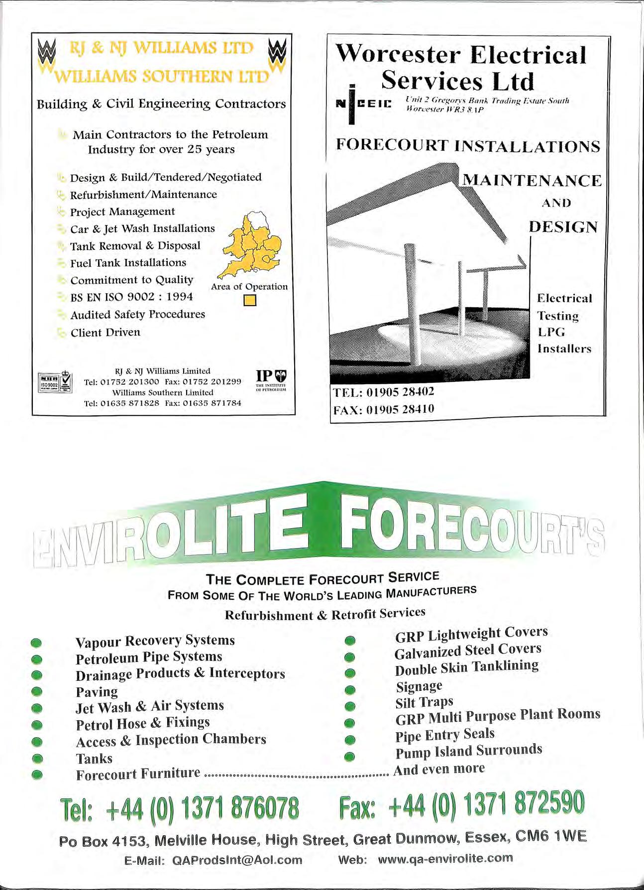 RJ & NJ WILLIAMS LTD WILLIAMS SOUTHERN LTD Worcester Electrical . Services Ltd NI C E IC: l'nit 2 Grcgon\ Bank Trading E'tate Somh Horcnter 1VR3 8. IP Building & Civil Engineering Contractors Main Contractors to the Petroleum Industry for over Z 5 years FORECOURT INSTALLATIONS Design & Build/Tendered/Negotiated Refurbishment/Maintenance Management Car & Jet Wash Installations Tank Removal & Disposal Fuel Tank Installations Commitment to Quality BS EN ISO 9002 : 1994 Area of Operation \l Audited Safety Procedures Client Driven RJ & NJ Williams Limited Tel: 01752 201300 Fax: 01752 201299 Williams Southern Limited Tel: 01635 871828 Fax: 01635 871784 D TEL: 01905 28..t02 FAX: 01905 28410 THE COMPLETE FORECOURT SERVICE FROM SOME OF THE WORLD'S LEADING MANUFACTURERS Refurbishment & Retrofit Services AND DESIGN Electrical ,,s Testing LPG Installers • Vapour Recovery Systems • GRP Lightweight Covers • Petroleum Pipe Systems • Galvanized Steel Covers • Drainage Products & Interceptors • Double Skin Tanklining • Paving • Signage • Jet Wash & Air Systems • Silt Traps • Petrol Hose & Fixings • GRP Multi Purpose Plant Rooms Access & Inspection Chambers Pipe Entry Seals • Tanks • Pump Island Surrounds Forecourt Furniture 000000 0°ooooooooooooooooooooooooooooooooooooo•oooooo And even more +44 1371 1 01a +44 ( ) 1 71 1 E- Mall! : Web : www.qa e81lvernm:e .co m