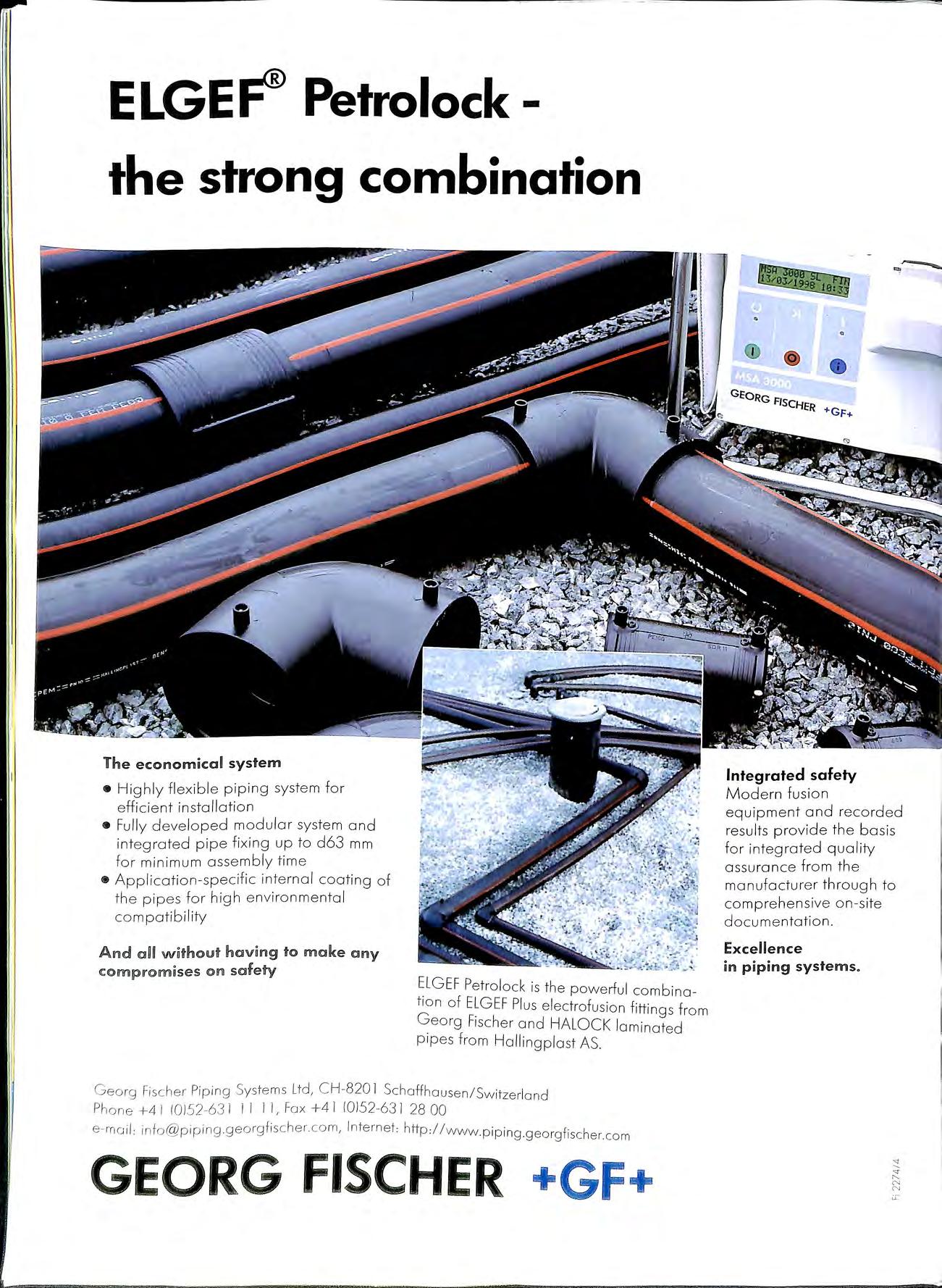 E LGE F® Petrolockthe strong combination The economical system • Highly f lexibl e pipin g sys t e m for e ffi c ient installation • Ful ly d evel o ped mo du lar sys tem and integ ra ted pipe fi x ing up t o d63 mm for minimum a sse mbl y tim e • Ap pli c ation-sp ec if ic in t e rn a l co ating of th e pip e s for high e nv iro nmental co mpatibility And aii with o ut lhiavong to make any co mpro mises 01111 safety EL G EF Pe tr o lo ck is the po we rful co mbinatio n of EL G EF Plu s e lectro f us io n fittin gs fr o m Geo rg Fi sc he r a nd HA LO C K lamin a ted p ipes fr om H a llingplast AS G eo rg Fischer Pip ing Syste ms Ltd, C H-820 l Schaffhousen/Sw itze rl an d Phone + 4 ] 10152-631 l l I l, Fax +4 l 10 152-63 1 28 00 e mail: info@p ipi ng georgf isc her· corn, Internet http:! /wvvw.p ip in g geo rglischer. co m GEORG FISCHER +GF+