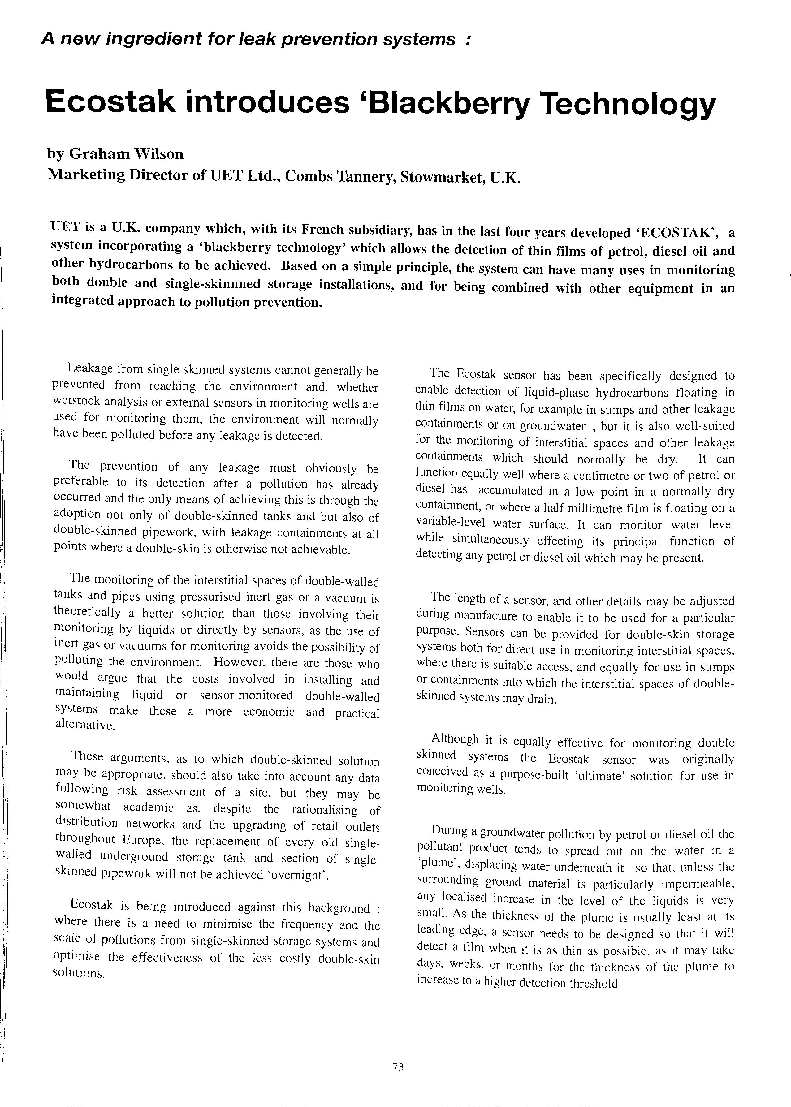UET is a U.K. company which, with its French subsidiary, has in the last four years developed 'ECOSTAK', a system incorporating a 'blackberry technology' which allows the detection of thin films of petrol, diesel oil and other hydrocarbons to be achieved. Based on a simple principle, the system can have many uses in monitoring both double and single-skinnned storage installations, and for being combined with other equipment in an integrated approach to pollution prevention.