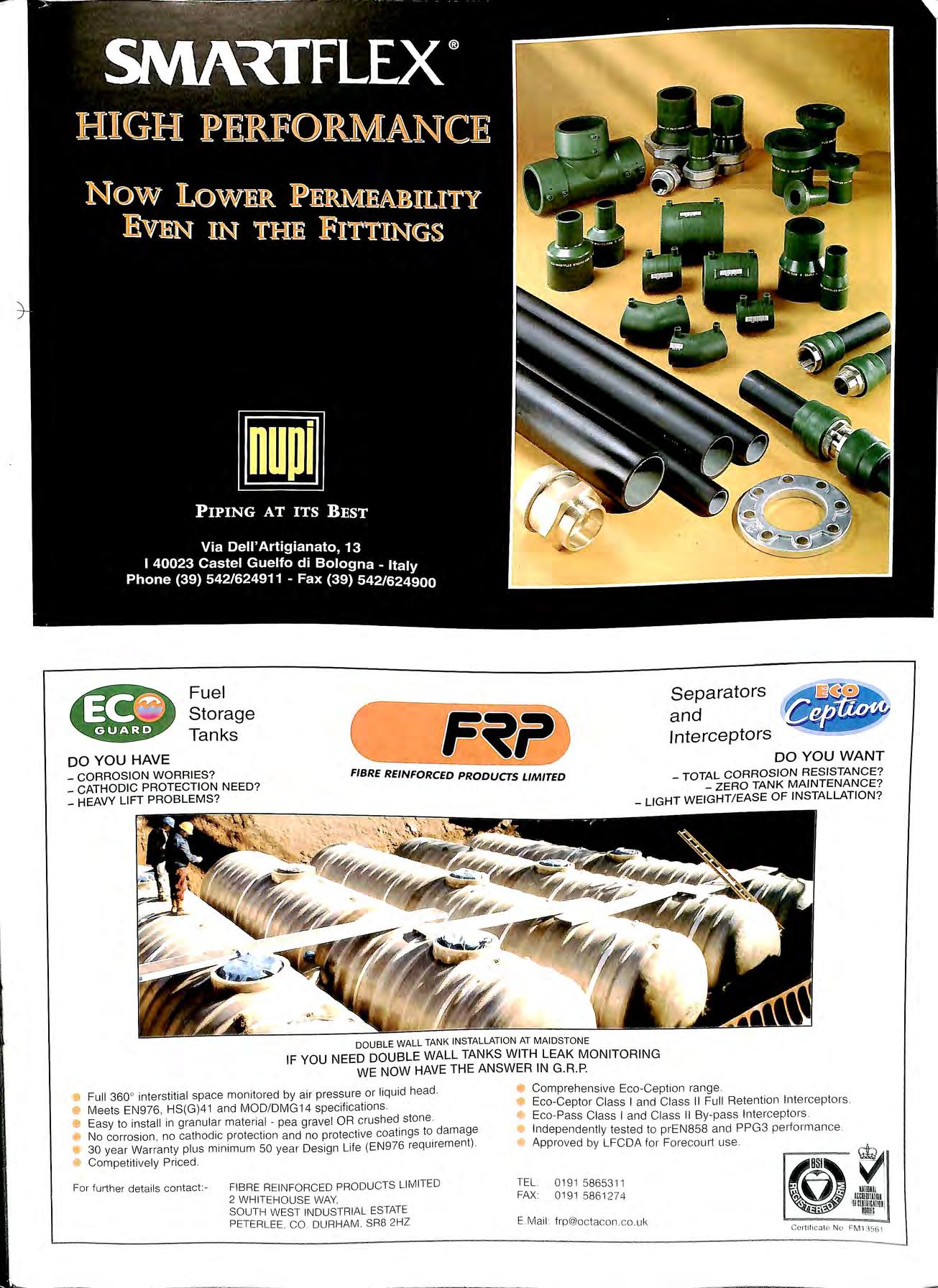 A number of major oil companies are re-examining their policy on storage tank construction and are once again looking at GRP tanks as an option for their tank replacement programme. This change has come about mainly by improvements in GRP technology. which has enabled a more cost-effective construction for double skin tanks to be utilised. This in tum has enabled double skin GRP tanks to be as competitive as double skin steel.