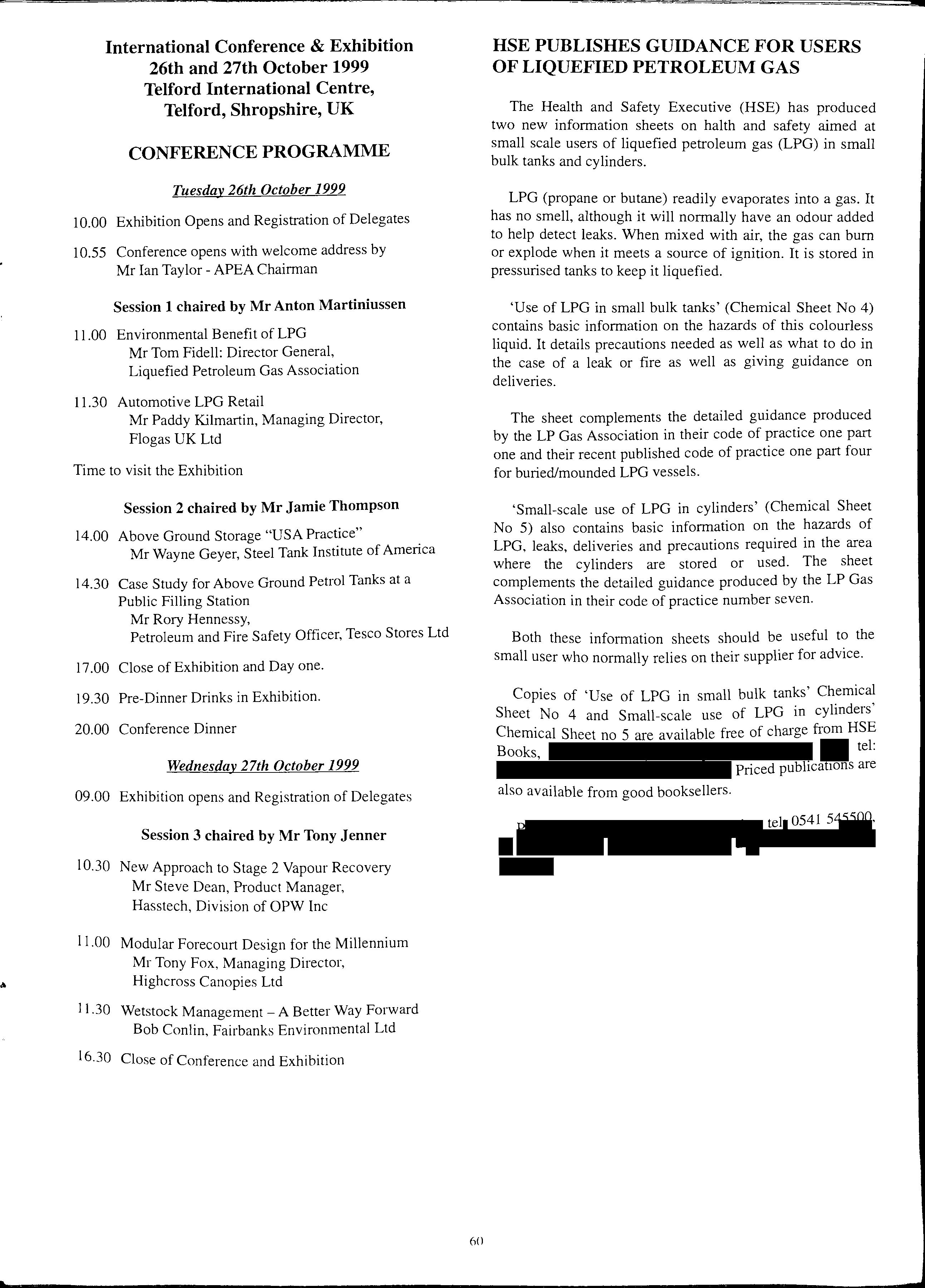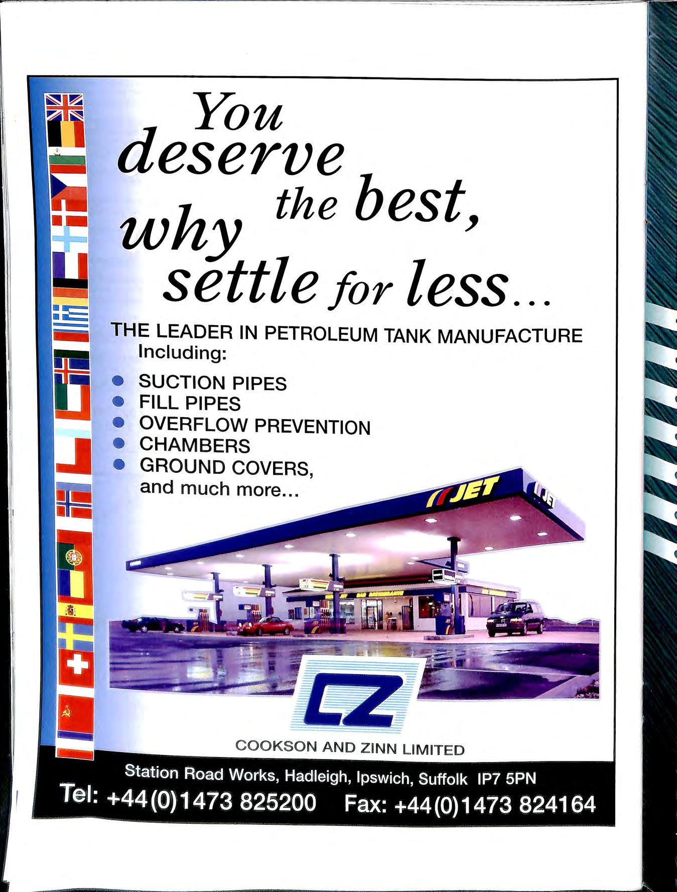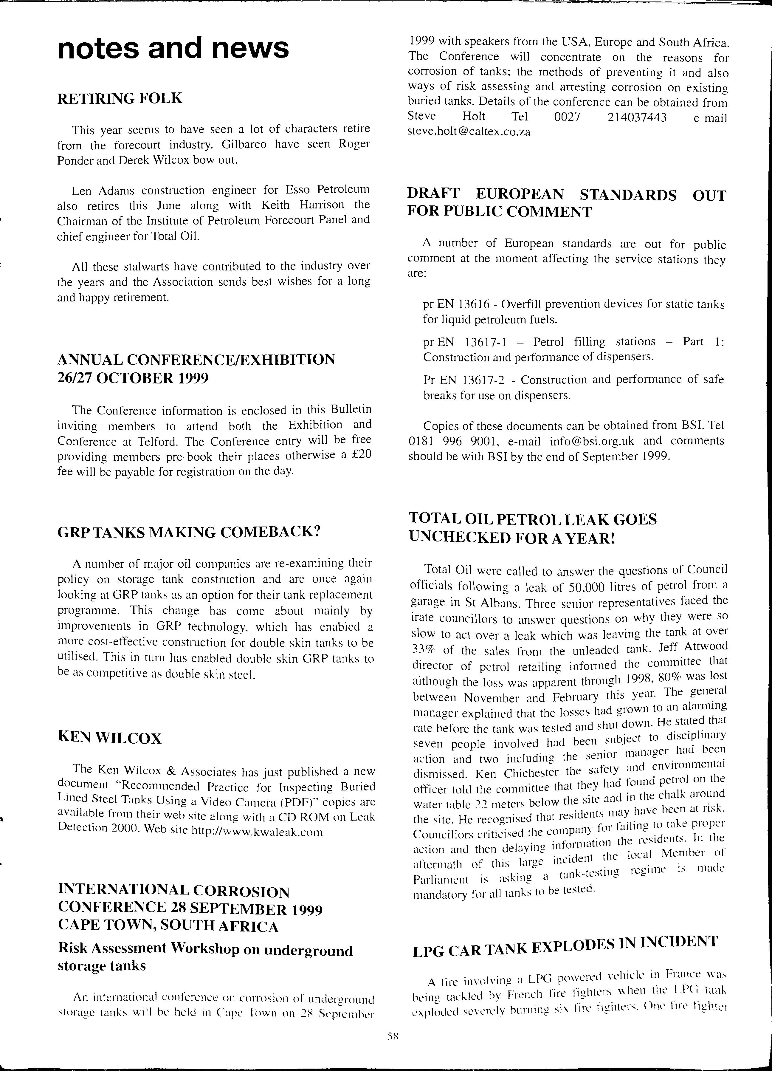 1999 with speakers from the USA, Europe and South Africa. The Conference will concentrate on the reasons for corrosion of tanks; the methods of preventing it and also ways of risk assessing and arresting corrosion on existing buried tanks. Details of the conference can be obtained from Steve Holt Tel 0027 214037443 e-mail steve.holt@caltex.co.za