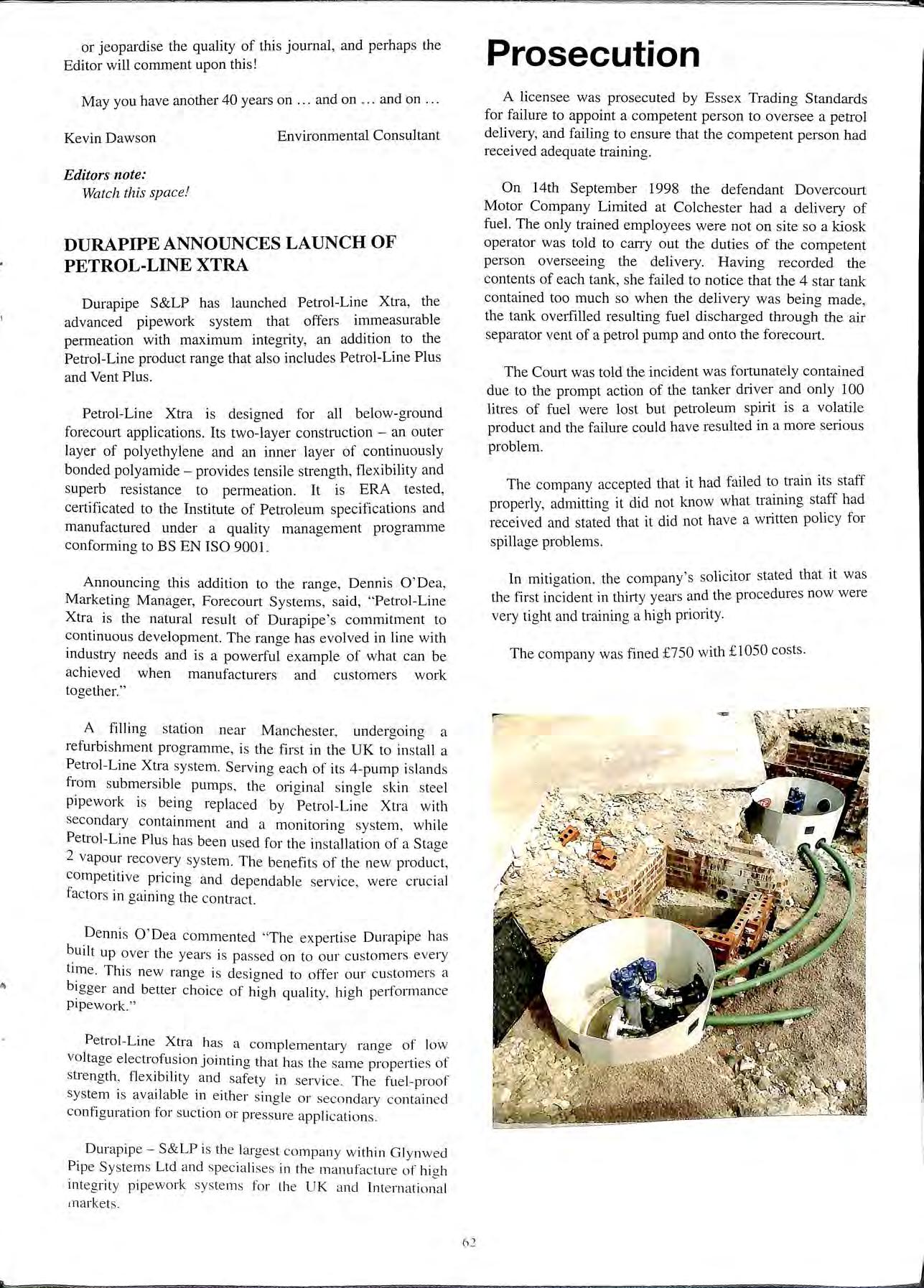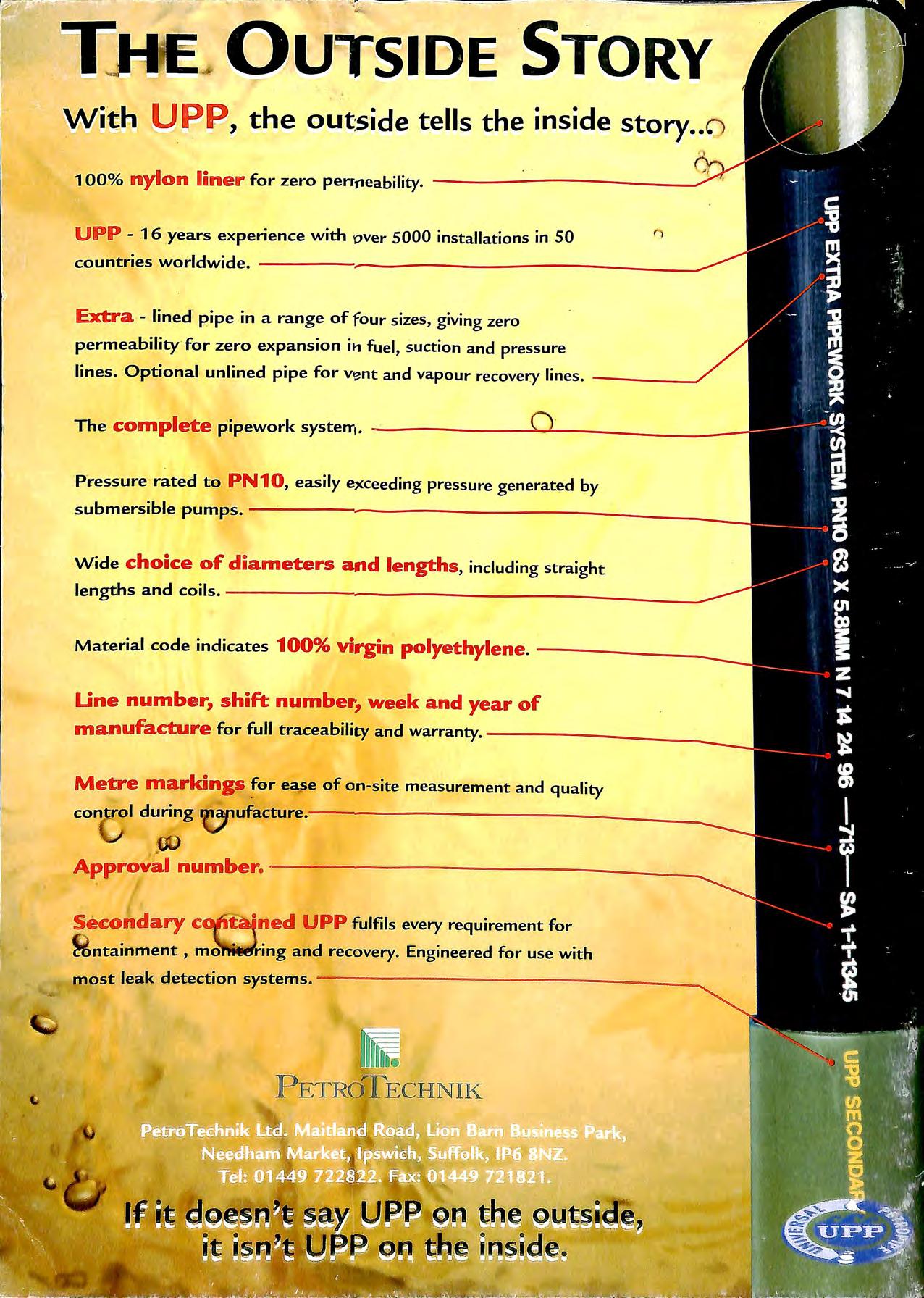These arguments, as to which double-skinned solution may be appropriate, should also take into account any data following risk assessment of a site, but they may be somewhat academic as, despite the rationalising of distribution networks and the upgrading of retail outlets throughout Europe, the replacement of every old singlewal Jed underground storage tank and section of singleskinned pipework will not be achieved 'overnight'.