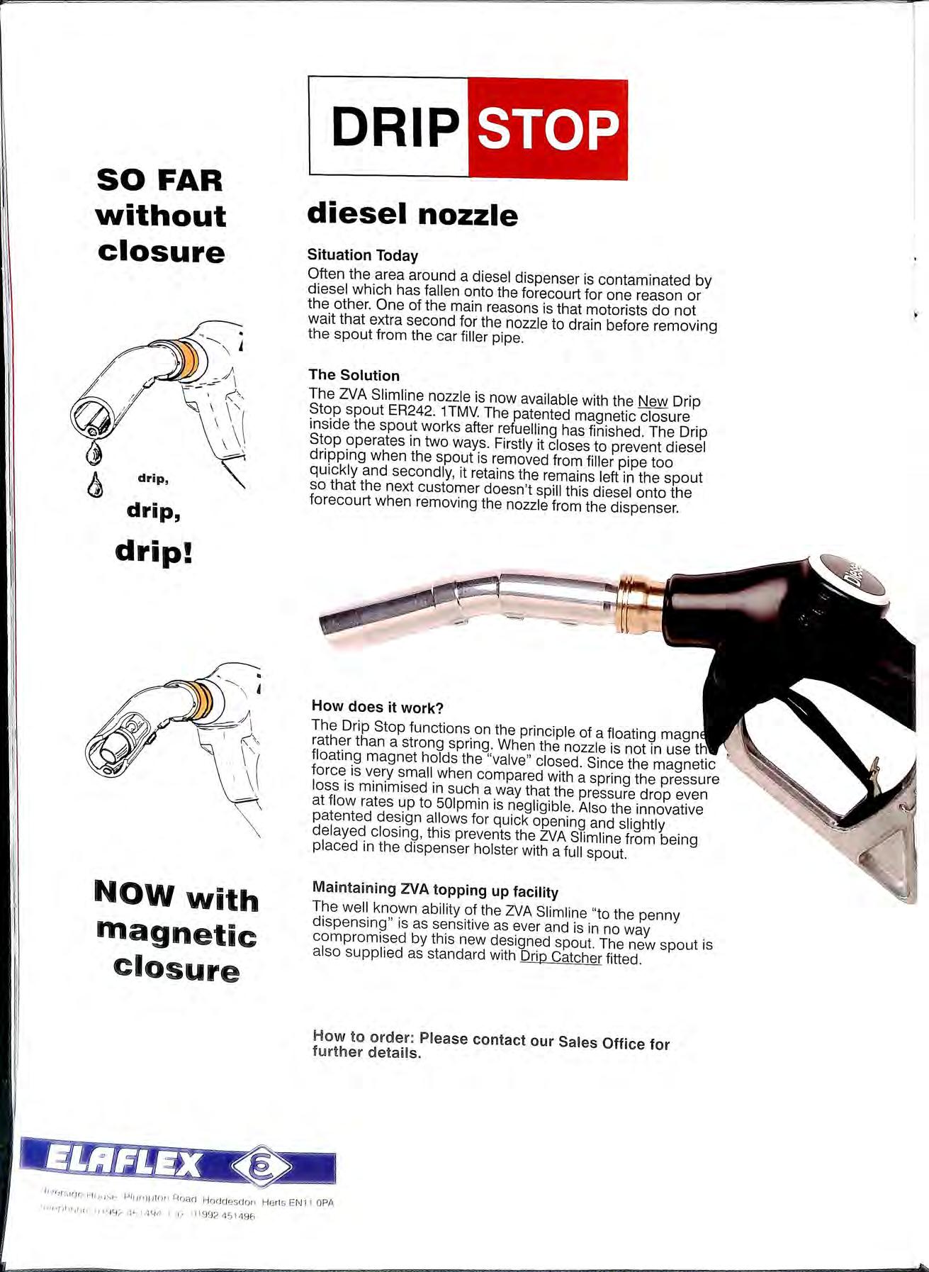 The Z.VA Slimline nozzle is now available with the New Drip Stop spout ER242 1TMV. The patented magnetic closure inside the spout works after refuelling has finished. The Dnp Stop operates in two ways. Firstly it closes to prevent diesel dripping when the spout is removed from filler pipe too quickly and secondly, it retains the remains left in the spout so that the next customer doesn 't spill this diesel onto the forecourt when removing the nozzle from the dispenser.