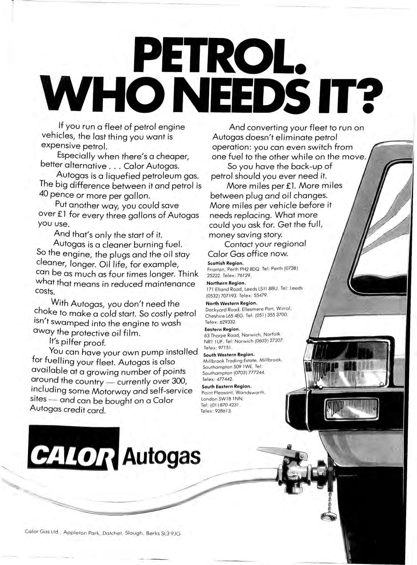 With Autogas, you don't need the choke to make a cold start. So costly petrol isn't swamped into the engine to wash away the protective oil film. It's pilfer proof. You can have your own pump installed for fuelling your fleet. Autogas is also available at a growing number of points ?round the country - currently over 300, inclUding some Motorway and self-service