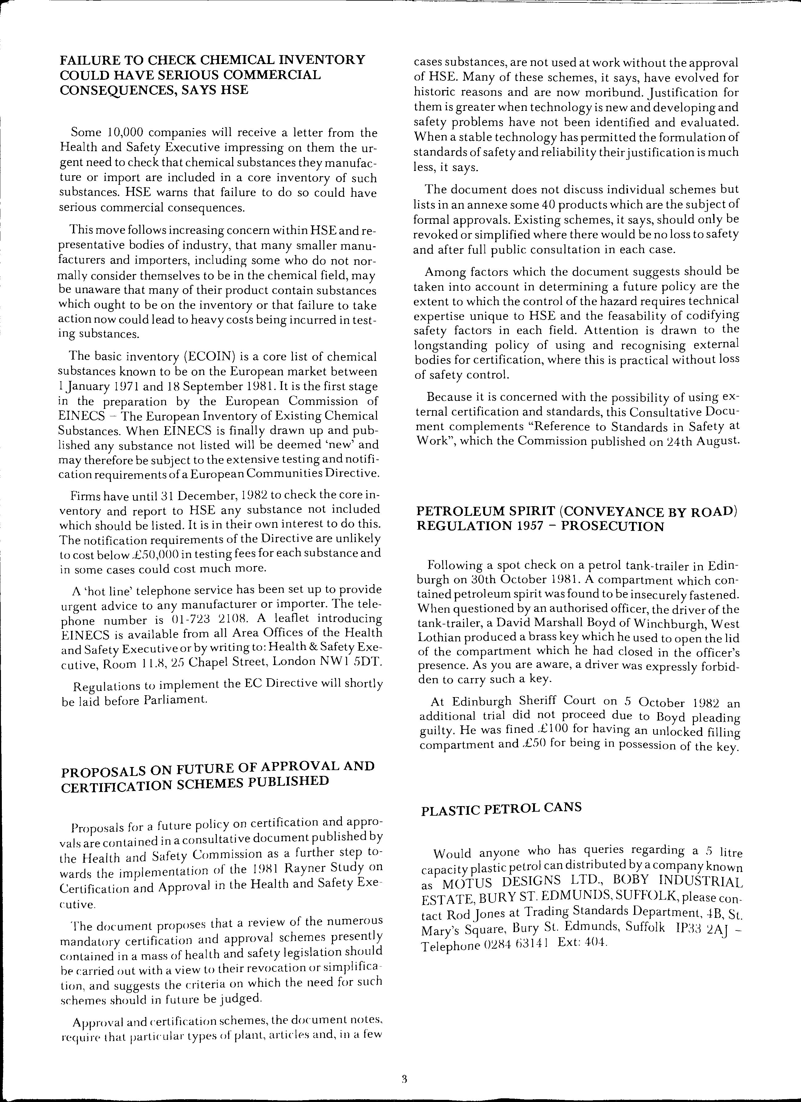 This move follows increasing concern wi thin HSE and representative bodies of industry, that many smaller manufacturers and importers, includin?; some who do not normally consider themselves to be in the chemical field, may be unaware that many of their product contain substances which ought to be on the inventory or that failure to take action now could lead to heavy costs being incurred in testing substances.