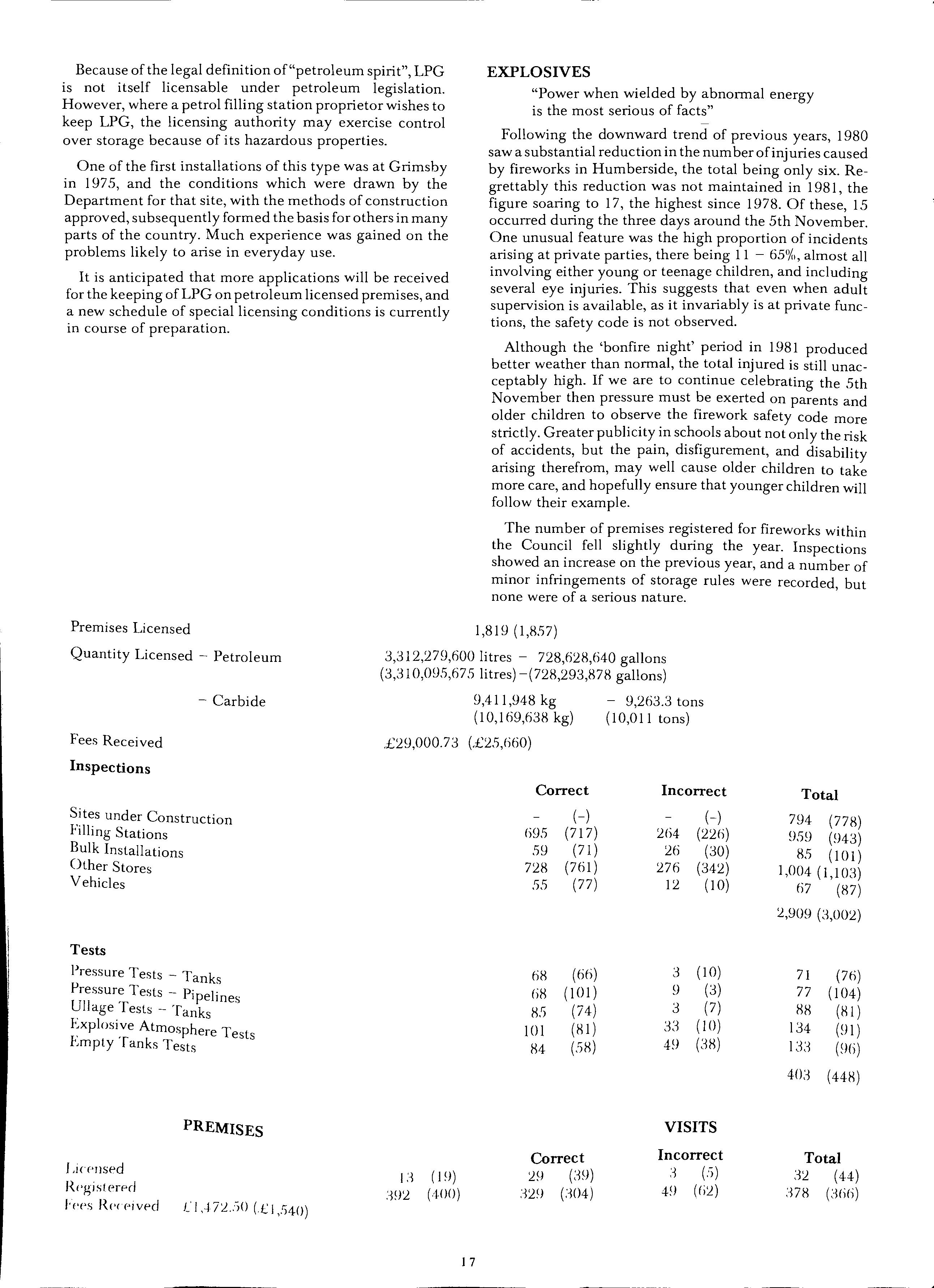 The number of petroleum licences again fell during the year, with the closure of uneconomic petrol filling stations. This was offset slightly by an increase in paint spraying services. All too often these were discovered, unlicensed, by officers and then had to undertake alterations to confonn with safety requirements. In most cases it would have been cheaper, as well as safer, and not illegal, for advice to be given prior to initial construction.