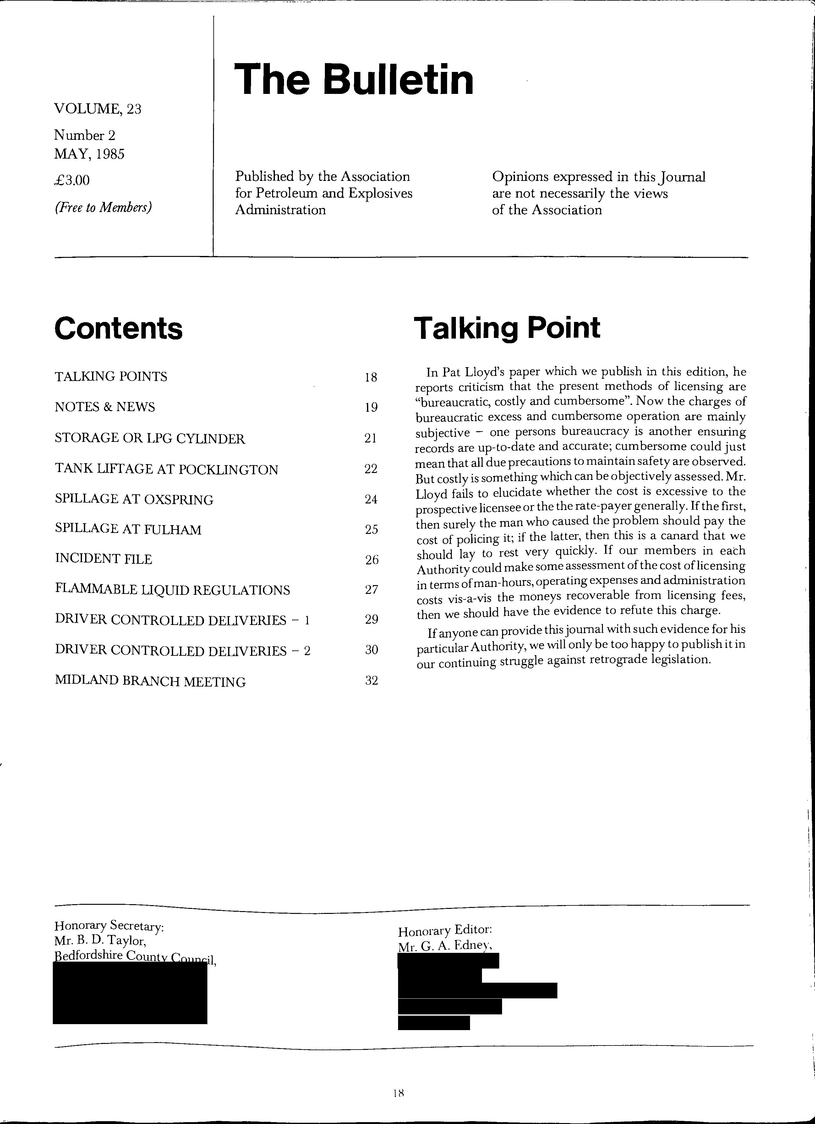 In Pat Lloyd's paper which we publish in this edition, he reports criticism that the present methods of licensing are "bureaucratic, costly and cumbersome". Now the charges of bureaucratic excess and cumbersome operation are mainly subjective one persons bureaucracy is another ensuring records are up-to-date and accurate; cumbersome could just mean that all due precautions to maintain safety are 0 bserved. But costly is something which can be objectively assessed. Mr. Lloyd fails to elucidate whether the cost is excessive to the prospective licensee or the the rate-payer generally. If the first, then surely the man who caused the problem should pay the cost of policing it; if the latter, then this is a canard that we should lay to rest very quickly. If our members in each Authority could make some assessment of the cost oflicensing in terms of man hours, operating expenses and administration costs vis-a-vis the moneys recoverable from licensing fees, then we should have the evidence to refute this charge.
