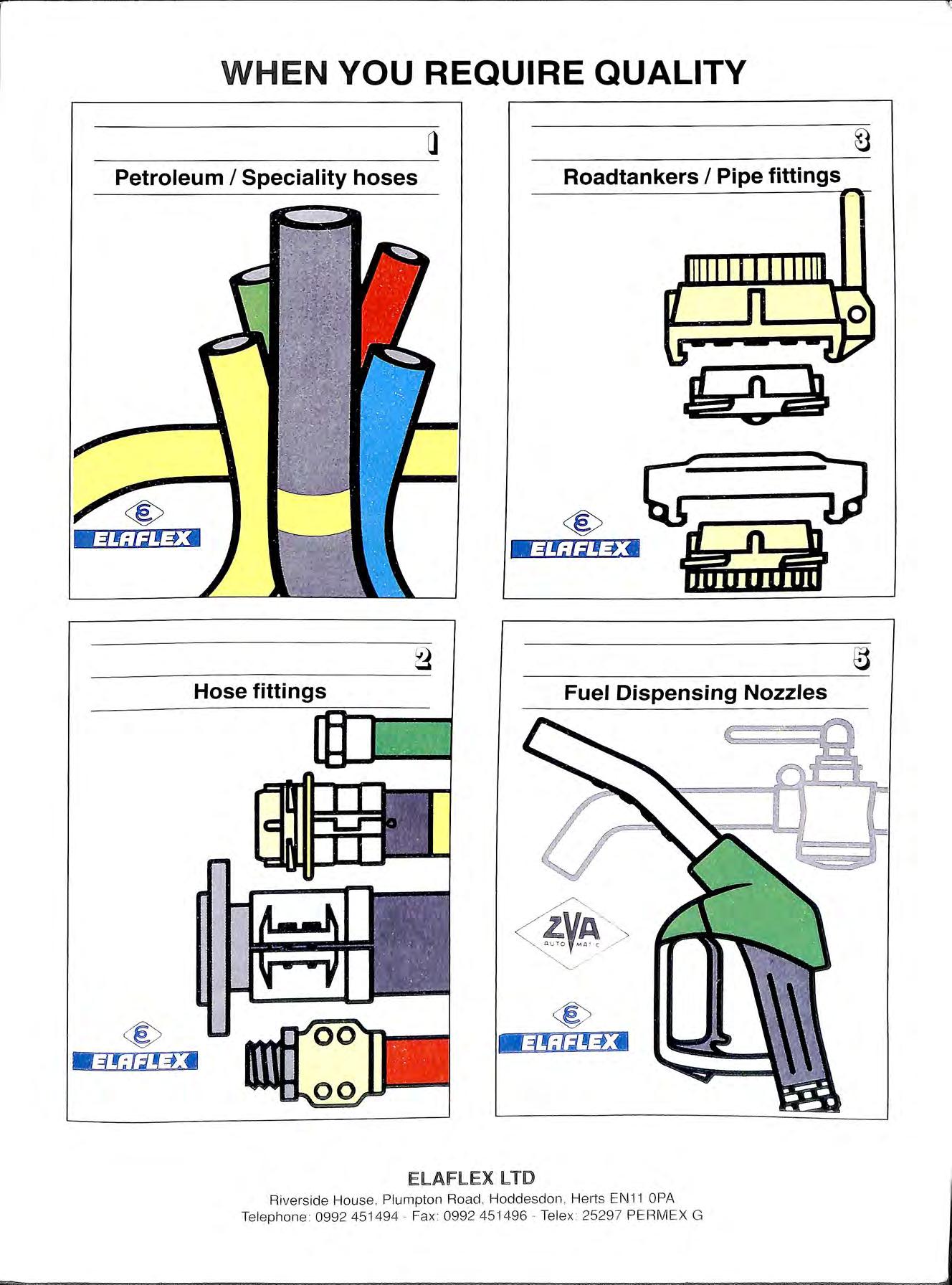 WHE N YOU REQUIRE QUALITY Petroleum I Speciality hoses Roadtankers I Pipe fittings Hose fittings Fuel Dispensing Nozzles 00 ® 00 ElAFLEX LTD Riverside House , Plumpton Road , Hoddesdon , Herts EN11 OPA Te lephone 0992 451494 Fax 0992 451496 Te lex 2529 7 PERMEX G