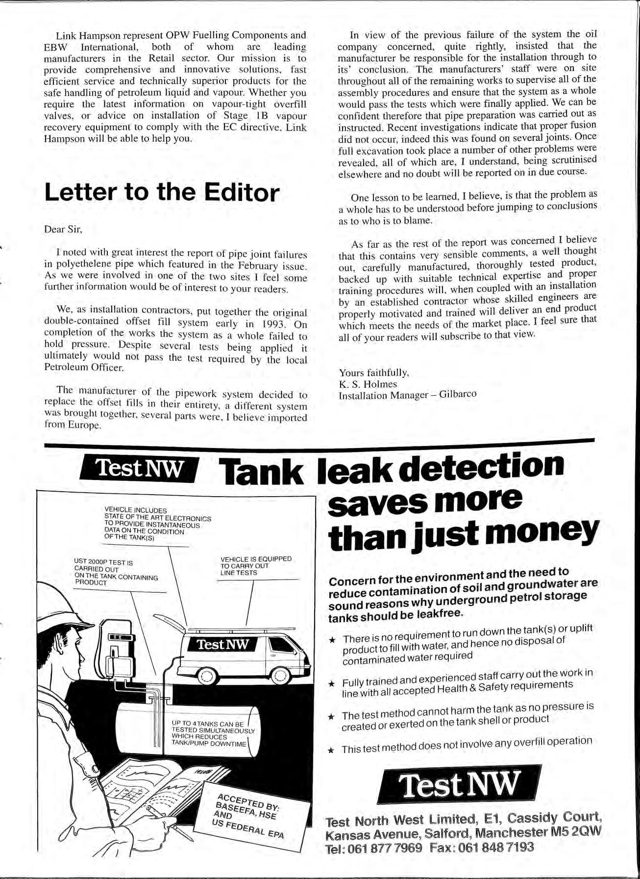 BUILDING AND CIVIL ENGINEERING CONTRACTORS TO THE OIL COMPANIES FOR 24 YEARS C.R. RICHARDSON (CONTRACTORS) LTD DESIGN & BUILD COMPLETE REDEVELOPMENTS MAINTENANCE & REPAIRS Anerley Court, Half Moon Lane , Tel: 01732 838608 Hildenborough , Kent TN11 9HU Fax: 01732 838064 RIETBERG DOUBLE WALLED SAFETY CONTAINERS Ri etberg Containers for Hazardous Liquids r-- --, Suitable to feed or Haza rdous liquids Conta iner collect, store and transport infla mmable and other water polluting liqu i d s • Double walled steel conslruclion • Inside and out side hol d ip gaivon ised • leak age indicator • Explosion blast proof o Volumes from 80 I up lo 7500 I 0 Perm ission for fran sportali on on roods (ADR) an d rail (R ID) 0 Var ious desi gns to meet your demands o O ptions: complete stain less steel co nstruction , acid proof inside coa ti ng 0 Models available Fuel Con taine r th e mobile petrol slotion Ch emical s Conta iner for fresh C hemica ls !Hazardou s liqu ids Conta in er for waste oil ond o:her wa ter polluting liq uids Pleose co n1oct us for f urth er info r ma tr on RIETBE RG WERKE G M BH l CO KG SEPPELER GRUPPE IRHIElf_!llERtrO _ BAHNHO FSrR 55 D 333 9 7 RIETBERG fEl (0 52 44} 9 8 3 0 FAX (0 5 2 44} 9 83 2 01 TRAINING IN-COMPANY SHORT COURSES Flexible arrangements to meet your requirements at competitive rates • Electrical requirements for Petrol l'illing Station s (New HSE code HS(G) 41) • I6th EDITION IEE WIRING REGULATIONS • Electricity at Work Regulations 1989 • Inspection and Testing of Electrical Installation s f'resc11/a _· TERRY HEDGELAND BA , FI E IE MIOA Origin al author of the highly !ucccssful IEE ISth Edition 2-day short course Phone: 0737 553328 PETROL FILLING STATIONS: e CERTIFICATES OF ELECTRICAL INSPECTION & TESTING to HS(G) 41 & LACOTS requ i rem ents EMERGENCY LIGHTING: e COMPLETION CERTIFICA TES based on model in BS 5266: Part l : 198 8 e PERIODIC INSPECTION AND TEST CERT/FICATES ba sed on model in BS 5266 : Part l : 1988 FIRE ALARM SYSTEMS: e INSTALLATION & COMMISSIONING CERTIFICATES based on model in BS 5839: Part l: 1988 e CERTIFICATES OF TESTING based on model in BS 5839: Part l: 1988 £9.87 [ £8 40 ]+VAT per pod e PRACTICAL GUIDE TO ELECTRICAL INSTALLATION TESTING £16.i}S Prices include p&p Order w ith cheque paya ble!;; UNEEDA PUBLICATIONS, 5 HIGHWOLD, CHIPSTEAD, SURREY CR5 JLG Compl ete the coupon and we 'll int ro duce you lo th e mos t advanced , eff ective techniques fo r comba ti ng subsu rface co nt aminat io n With a uniqu e range of processes in clud ing German and Ameri ca n te chn olog ies , Mi lle r Environmen tal specia lise rn the investi ga ti on and re mova l of pollutants such as petro leu m pro ducls solven ls an d chemic al contamrnatron. Our me thods are fast cosl effective , safe and desig ned not to interrupt your business Miller En vironm ental Miller House Whitwood Enterpris e Park Whitwood Lane Whitwood , Ca st lefo rd W Yorks WF10 5P X Telephon e: (0977) 555427 Fax : (0977 )555684 MILLER MI LLER GRO UP C I VIL ENG I NEE RI N G -CONSTRUCTION D EV E LO PMENTS EN V l RON M EN T A L HOM E S MIN I N G Title _ Company _____ Add ress Tel