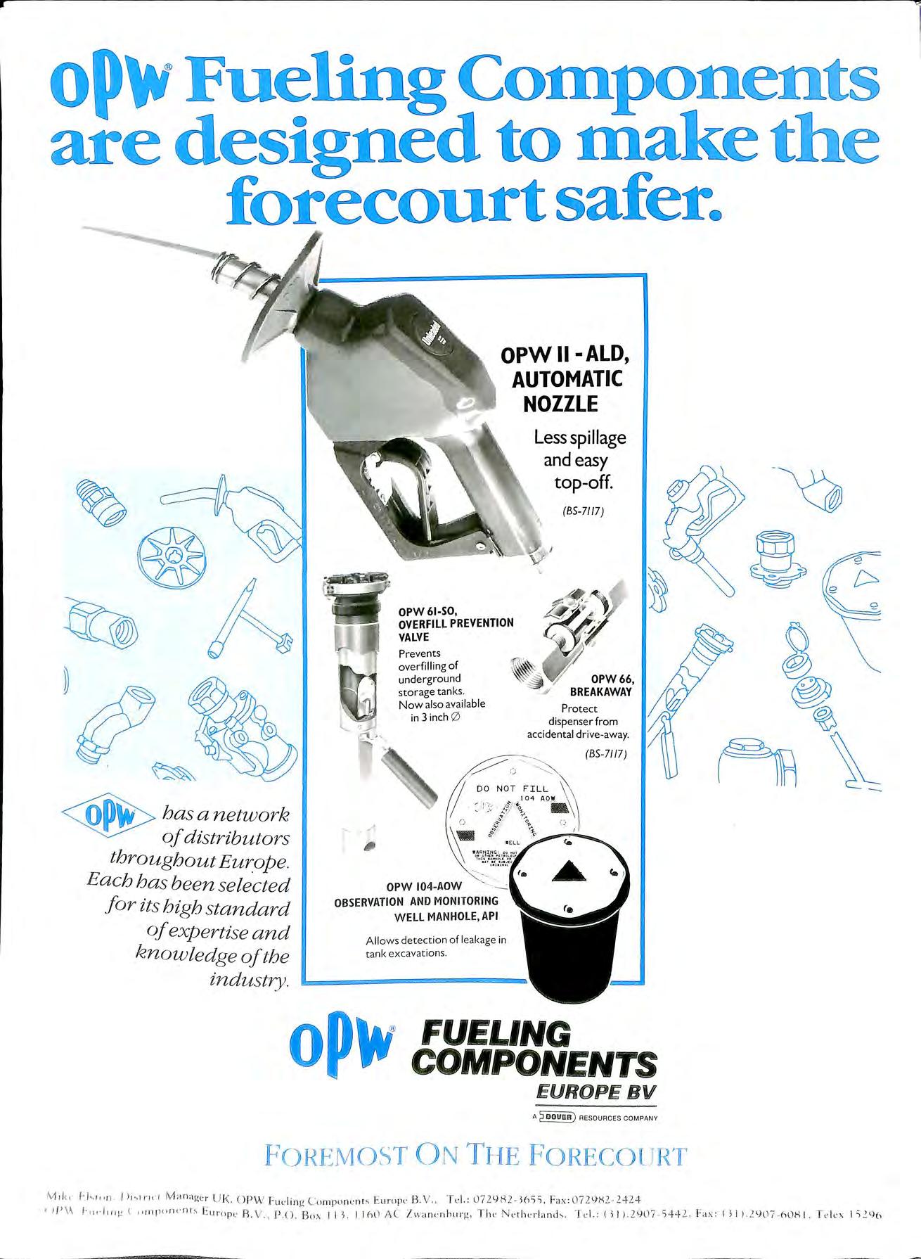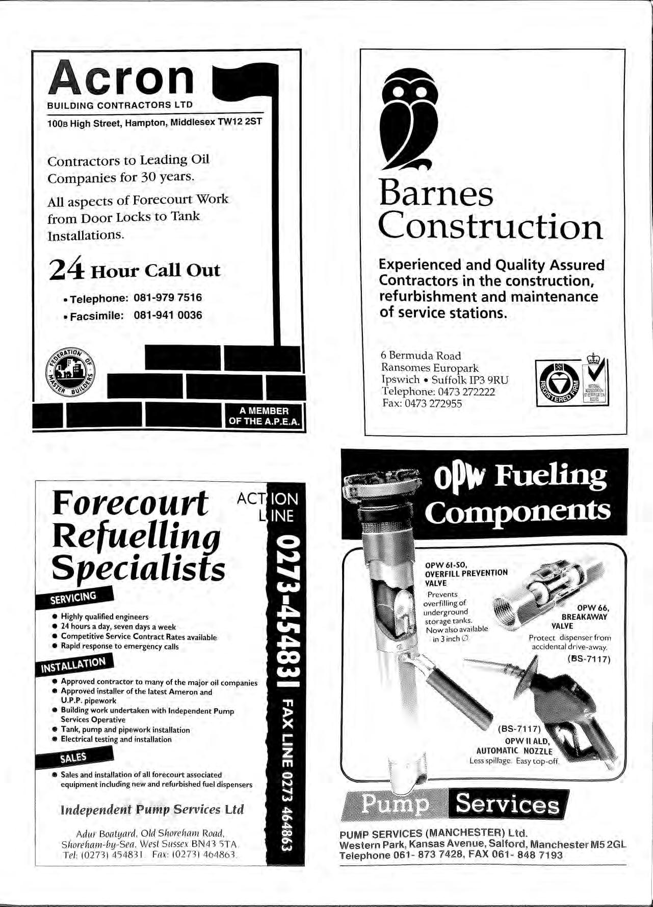 Acron BUILDING CONTRACTORS LTD 100s High Street, Hampton, Middlesex TW12 2ST Contractors to Leading Oil Companies for 30 years. All aspects of Forecourt Work from Door Locks to Tank Installations. 24 Hour Call Out •Telephone: 081-979 7516 •Facsimile: 081-941 0036 A MEMBER OF THE A.P.E.A. Forecourt Refuelling Specialists SER'l\C\NG • Highly qualified engineers • 24 hours a day, seven days a week • Competitive Service Contract Rates available • Rapid response to emergency calls l • Approved contractor to many of the major oil companies • Approved installer of the latest Ameron and U.P.P. pipework • Building work undertaken with Independent Pump Services Operative • Tank, pump and pipework installation • Electrical testing and installation SA.LES • Sales and installation of all forecourt associated equipment including new and refurbished fuel dispensers Independent Pu mp Servic es Ltd Adur Boatyard, Old Shoreham Road, Shoreham-by-S ea, West Susse x BN4 3 STA Tel (027 3 ) 45 48 3 1 Fax (0 2 7 3 ) 464 8 63 ION INE 0 ....... IAI I "' co IAI.,, )> >< r z m 0 t-.J ..... w .. co °" w Barnes Construction Experienced and Quality Assured Contractors in the construction, refurbishment and maintenance of service stations. 6 Bermuda Road Ransornes Europark Ipswich • Suffolk IP3 9RU Telephone: 0473 272222 Fax: 0473 272955 OPW61-SO, OVERFILL PREVENTION VALVE Prevents overfilling of underground scornge tanks. Now also available in 3 inch 0 Protect dispenser· from accidental drive-aw ay. (19S- 7117) OPWllALD, ' AUTOMATIC NOZZLE Less spillage Easy top-off. PUM P SERVICES (MAN CHEST ER ) Ltd. Western Pa r k, Kan sa s Avenue, Sa lford, Manch este r M5 2GL Tele p hon e 061 8 73 7 428 , FA X 061 8 4 8 7193