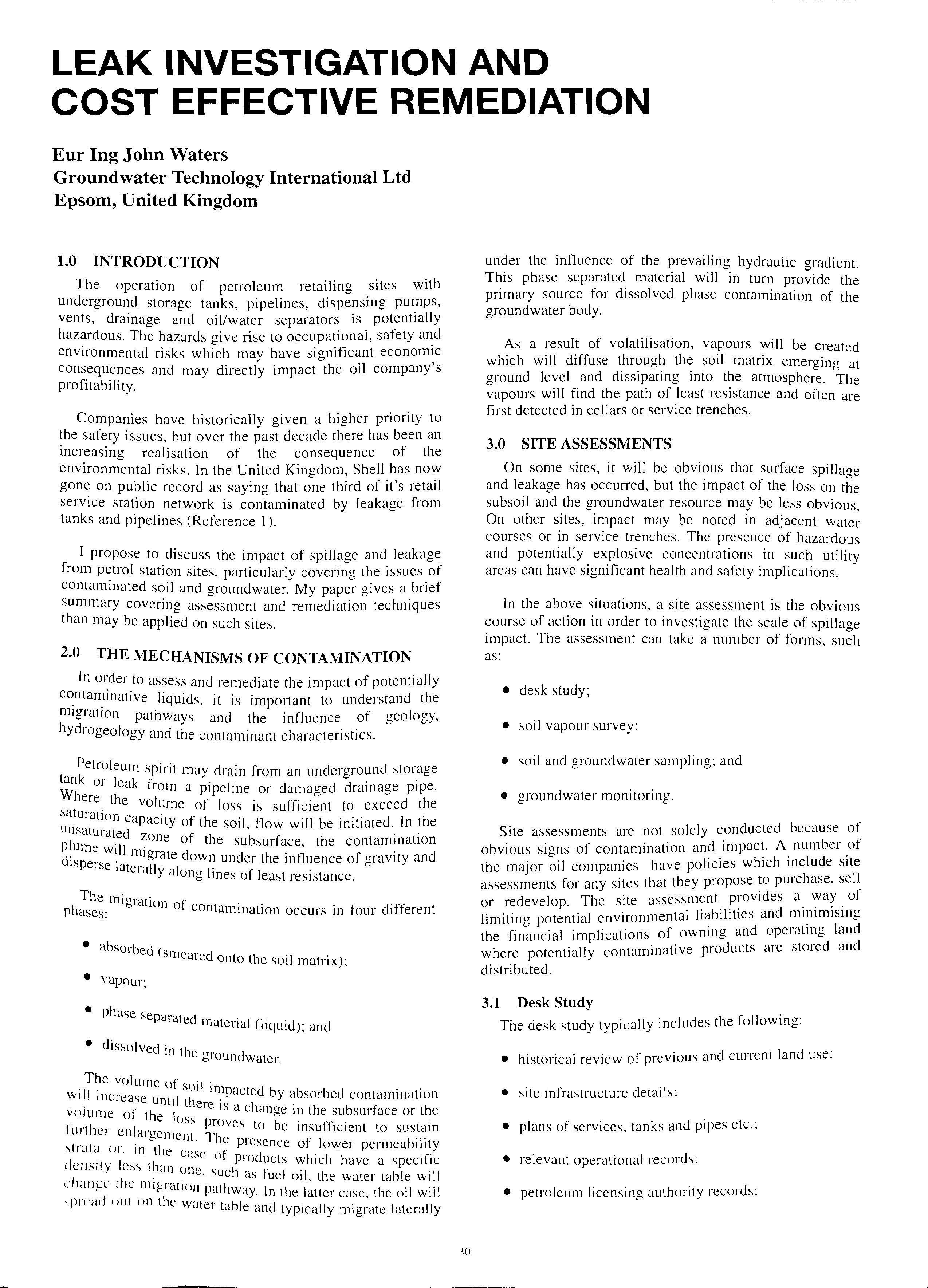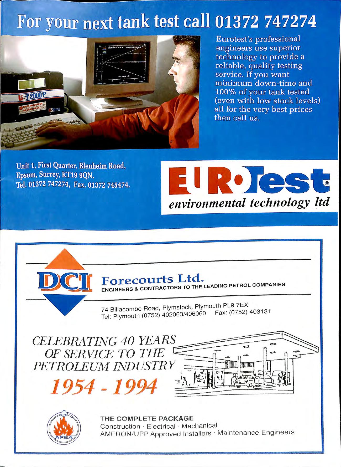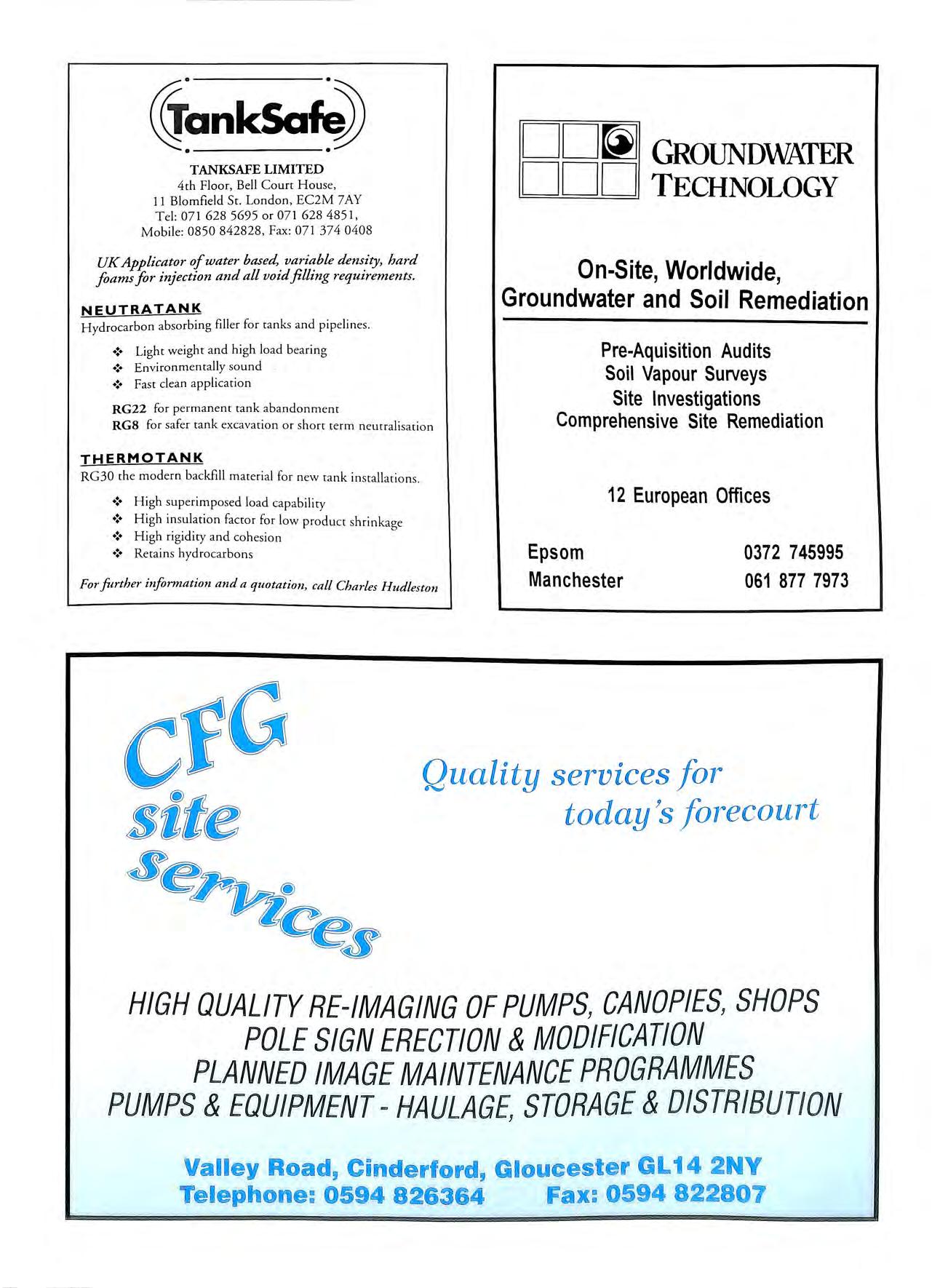 . . TANKSAFE LIMITED 4th Floor, Bell Court House, 11 Blomfield St. London, EC2M 7AY Tel: 071 628 5695 or 071 628 4851, Mobile: 0850 842828, Fax: 071 374 0408 UKApplicator ofwater based, variable density, hard foams for injection and all voidfilling requirements. NEUTRATANK Hydrocarbon absorbing filler for tanks and pipelines. •:• Light weight and high load bearing •:• Environmentally sound •:• Fast clean application RG22 for permanent tank abandonment RGB for safer tank excavation or short term neutralisation THERMOTANK RG30 the modern backfill material for new tank installations. •:• High superimposed load capability •:• High insulation factor for low product shrinkage •:• High rigidity and cohesion •:• Retains hydrocarbons For further infonnation and a quotation, call Charles Hudleston GROUNDWATER ODD TECHNOLOGY On-Site, Worldwide, Groundwater and Soil Remediation Pre-Aquisition Audits Soil Vapour Surveys Site Investigations Comprehensive Site Remediation 12 European Offices Epsom 0372 745995 Manchester 061 877 7973 cf G site &e v Qitality services for today Js f orecoitrt '"Cea HIGH QUALITY RE-IMAGING OF PUMPS, CANOPIES, SHOPS POLE SIGN ERECTION &MODIFICATION PLANNED IMAGE MAINTENANCE PROGRAMMES PUMPS & EQUIPMENT - HAULAGE, STORAGE &DISTRIBUTION Valley Road, Cinderford, Gloucester GL 14 2NY Telephone: 0594 826364 Fax: 0594 822807