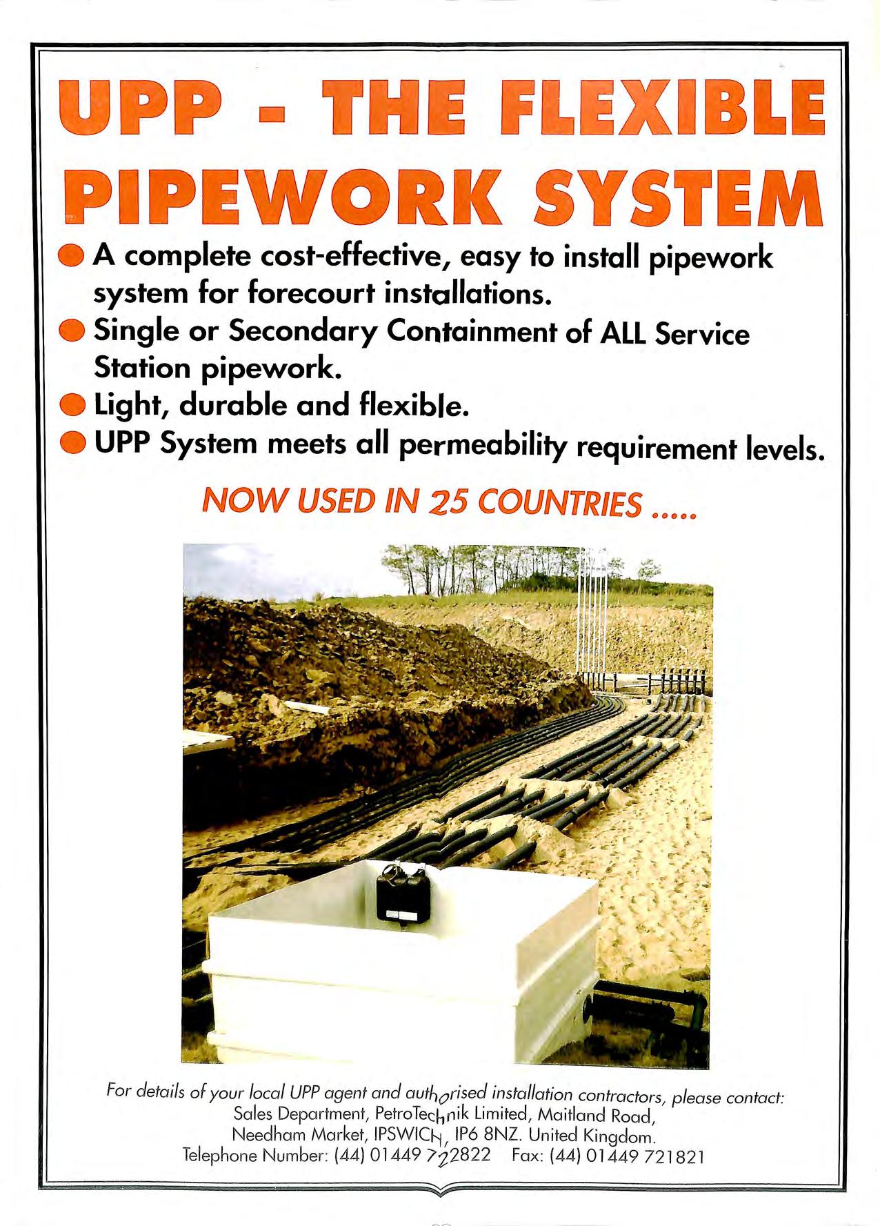 A complete cost-effective, easy to install pipework system for forecourt installations. Single or Secondary Containment of ALL Service Station pipework. Light, durable and flexible. UPP System meets all permeability requirement levels. NOW USED IN 25 COUNTRIES .a For deta ils of your local UPP agent and authorised installation contractors, please contact: Sales Department, PetroTec:hriik Limited, Maitland Road, Needham Market, IPSWICl·-j , IP6 8NZ. United Kingdom Telephone Nu mbe r : (44) 01449 /22822 Fax : (44) 01449 721821