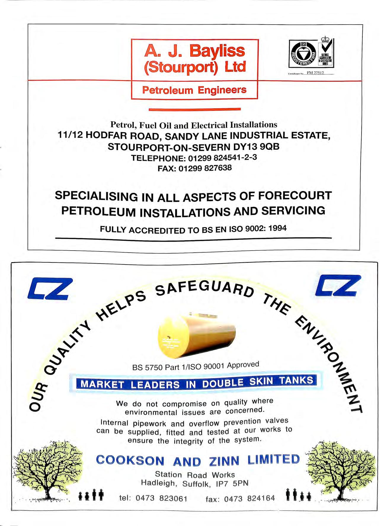Bayliss urport) Ltd etroleum Engineers Petrol, Fuel Oil and Electrical Installations . • 11/12 HODFAR ROAD, SANDY LANE INDUSTRIAL ESTATE, STOURPORT-ON-SEVERN DY13 9QB TELEPHONE: 01299 824541-2-3 FAX: 01299 827638 SPECIALISING IN ALL ASPECTS OF FORECOURT PETROLEUM INSTALLATIONS AND SERVICING FULLY ACCREDITED TO BS EN ISO 9002: 1994 LZ S 51\FEGUARD · £7 f...4. v 0 BS 5750 Part 1/ISO 90001 Approved !§ 0 We do not compromise on quality where environmental issues are concerned. -"' Internal pipework and ove rflow prevention val v es can be su p plied, fitted and tested at o ur w o rk s t o ensu re the integrity of the syst e m. C OK ON AN ZINN LIMI S t ation Road Works Hadleigh , Suffo l k, IP? 5PN . .. 11 i + tel: 04 73 823061 fax : 04 73 8241 64 I I i f