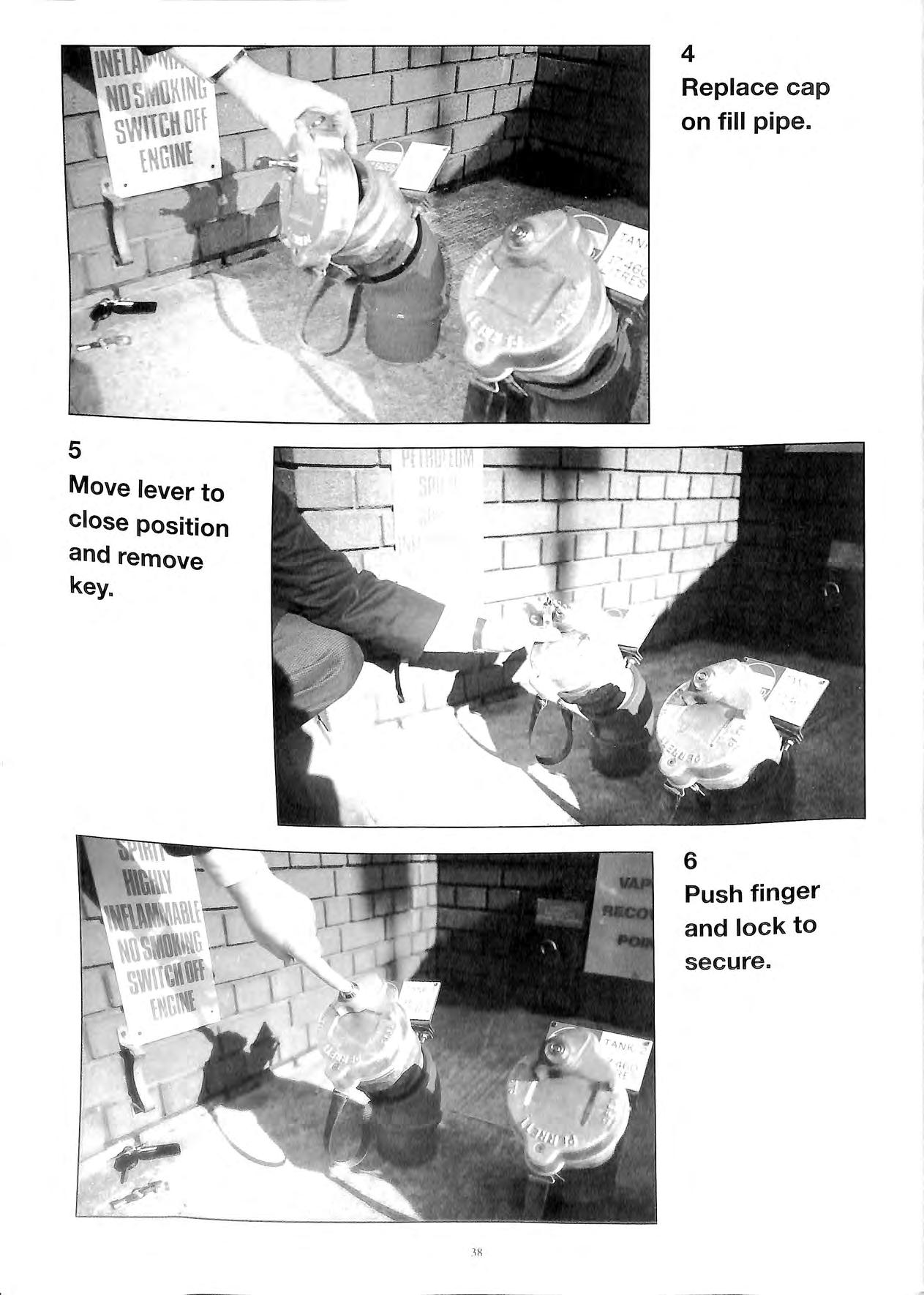 5 Move lever to close position and remove key. 4 Replace cap on fill pipe. 6 Push finger and lock to secure.