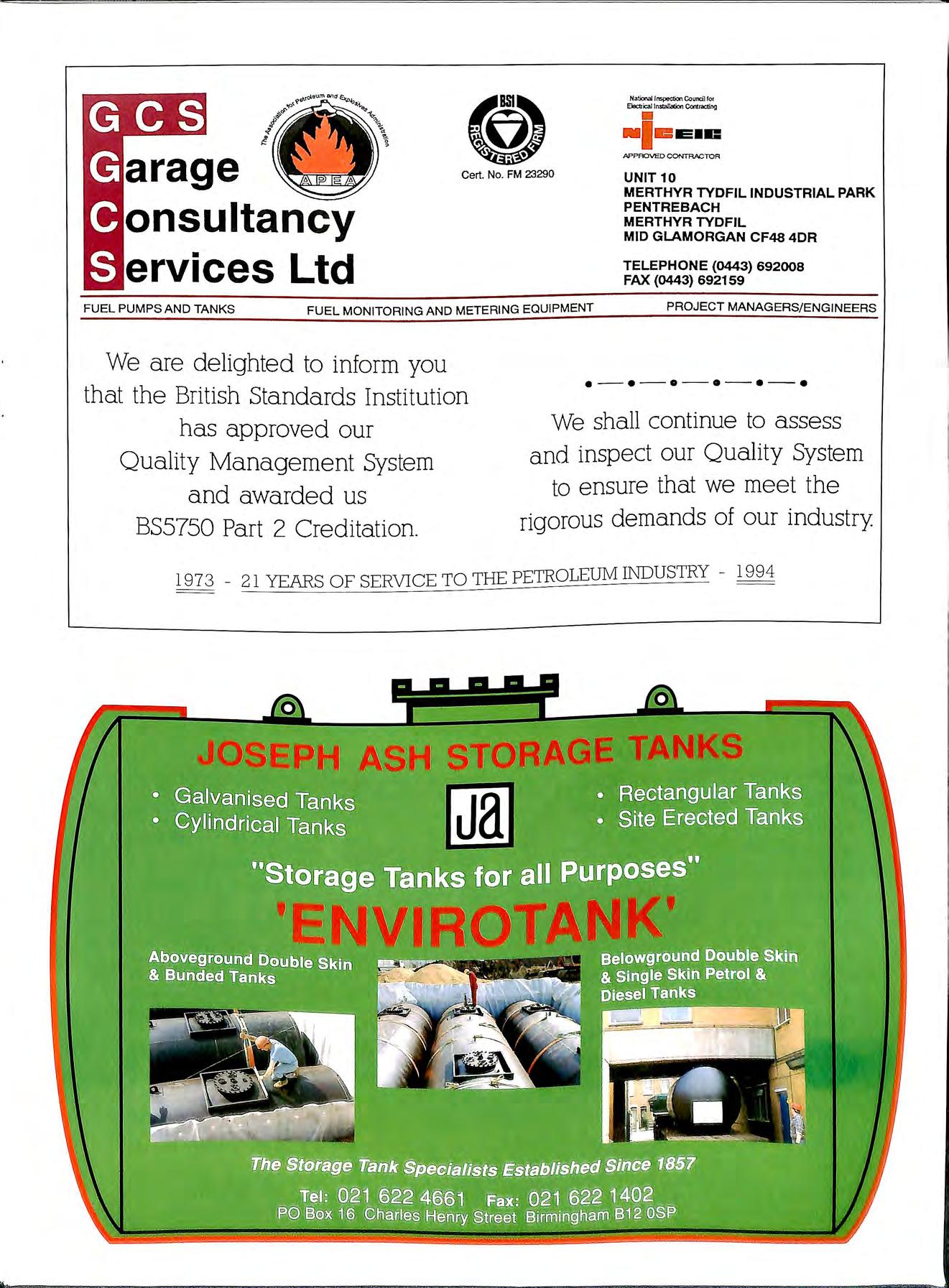 GCS G c s a rage onsultancy ervices Ltd Cert. No. FM 23290 Nafur.al Inspection Coun:::il for ElectricallnstallationConl:racting UNIT 10 MERTHYR TYDFIL INDUSTRIAL PARK PENTREBACH MERTHYR TYDFIL MID GLAMORGAN CF48 4DR TELEPHONE (0443) 692008 FAX (0443) 692159 FUEL PUMPS AND TANKS FUEL MONITORING AND METERING EQUIPMENT PROJECT MANAGERS/ENGINEERS We a.re delighted to inform you tha.t the British Sta.nda.rds Institution ha.s approved our Quality Management System a.nd a.warded us BS5750 Part 2 Credita.tion. ·-·-·-·-·-· We shall continue to assess and inspect our Quality System to ensure that we meet the rigorous demands of our industry 1973 21 YEARS OF SERVICE TO THE PETROLEUM INDUSTRY 1994