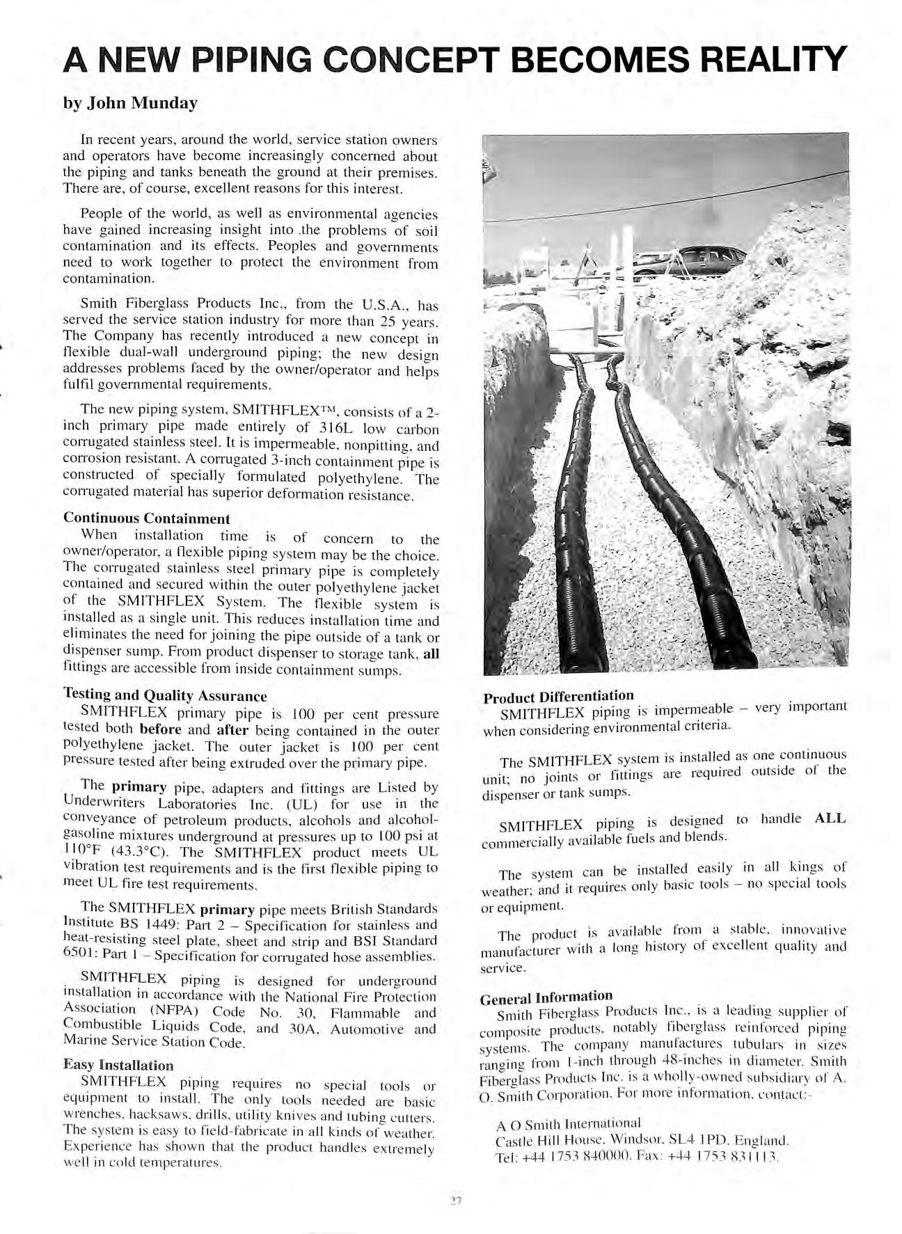 Check out the new standard in flexible underground piping the UL Listed SMITHFLEX dualwall system. SMITHFLEX piping is designed to handle all