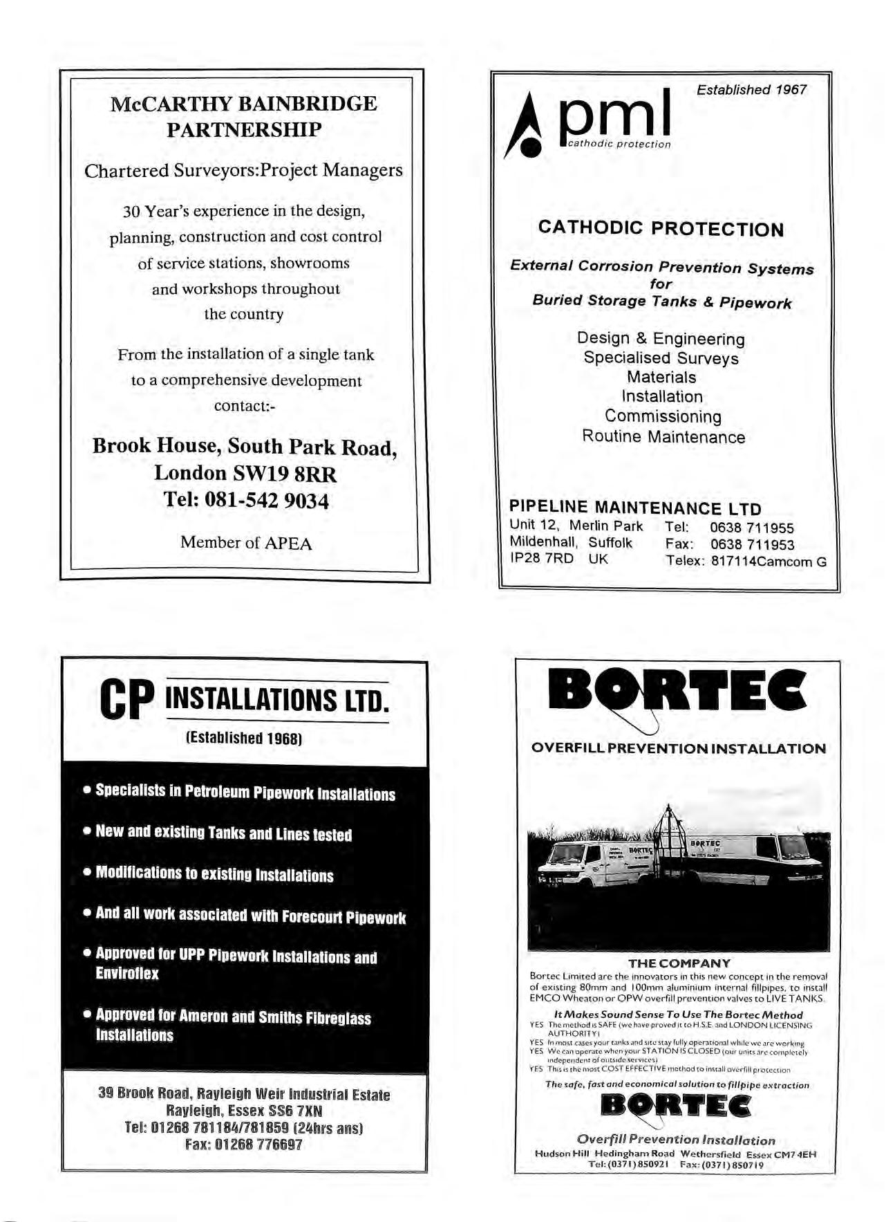McCARTHY BAINBRIDGE PARTNERSHIP Chartered Surveyors:Project Managers 30 Year's experience in the design, planning, construction and cost control of service stations, showrooms and workshops throughout the country From the installation of a single tank to a comprehensive development contact:Brook House, South Park Road, London SW19 8RR Tel: 081-542 9034 Member of APEA Cp INSTALLATIONS LTD. (Established 1968) • Specialists in Petroleum Pipework lnstallalions • New and existing Tanks and Lines tested • Modifications to existing Installations • And all work associated with Forecoun Pipework • Approved for UPP Pipework Installations and Envirollex • Approved for Ameron and Smiths Fibreglass Installations 39 Brnok Road, Rayleigh Weir imhllstroa! Estate Rayiengh, Essex SS6 7X N 268 781184n8 1859 [24hrs 3H11S) fax: 01268 176691 Established 1967 CATHODIC PROTECTION External Corrosion Prevention Systems for Buried Storage Tanks & Pipework Design & Engineering Specialised Surveys Materials Installation Commissioning Routine Maintenance PIPELINE MAINTENANCE LTD Unit 12, Merlin Park Mildenhall, Suffolk IP28 7RD UK Tel: 0638 711955 Fax : 0638 711953 Telex: 817114Camcom G OVERFILL PREVENTION INSTALLATION THE COMPANY Bartee Limited are the innovators in this new conc ept in the removal of existing BOmm and I OOmm aluminium interna l fill pipes. to install EMCO Wheaton or OPW overfill prevention valves to LIVE TANKS It Makes Sound Sense To Use The Bartee Method YES The method is SAFE (we have proved it to H.S E :ind LO ND O N LI CENS IN G AU TH O RITY ) YES In most cases you r canks site stay fully operational whi le we :ire working YES We can operate when your STATION IS CLOSED (o ur units :ire comple te ly indepe ndent of outside services) YES Tim is the most COST EFFE CTIVE me thod to install overfill protection The safe, fast and economical solution to (ii/ pipe extraction B"'TEC Overfill Prevention Installation Hudson Hi ll Hedingh am Road Wethe rsfie ld CM7 4EH Te l: (0371 )85 09 21 faJ<: (03 71) 8507 19
