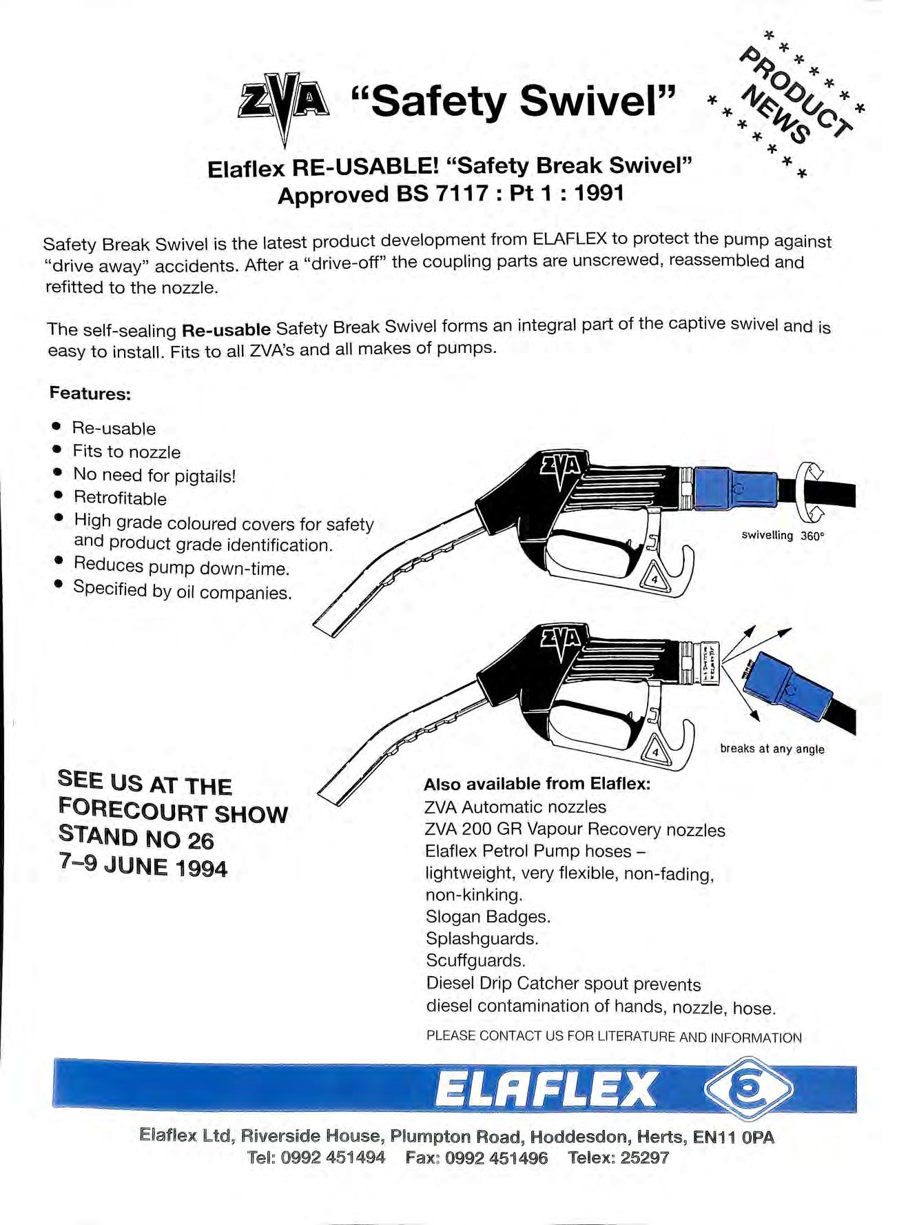 zy1A "Safety Swivel" Elaflex RE-USABLE! "Safety Break Swivel" Approved BS 7117 : Pt 1 : 1991 Safety Break Swivel is the latest product development from ELAFLEX to protect the pump against " drive away" accidents. After a "drive off" the coupling parts are unscrewed, reassembled and refitted to the nozzle. The self-sealing Re-usable Safety Break Swivel forms an integral part of the captive swivel and is easy to install. Fits to all ZVA's and all makes of pumps. Features: • Re-usable • Fits to nozzle • No need for pigtails! • Retrofitable • High grade coloured covers for safety and product grade identification. • Reduces pump down-time. • Specified by oil companies. SEE US AT THE FOREC OURT S HOW STAN D NO 26 7-9 JUNE 1994 br eaks at any angle Also available from Elaflex : ZVA Automatic nozzles ZVA 200 GR Vapour Recovery nozzles Elaflex Petrol Pump hoses lightweight, very flexible, non-fading, non-kinking Slogan Badges Splashguards Scuffguards Diesel Drip Catcher spout prevents diesel contaminat ion of hands , nozzle , hose PL EAS E CONTAC T US FO R LITERATURE AN D INFORMAT IO N ltdi Riveirs ode H o 1UJ sei Ro adi H oddesdoni Herts i EN11 OPA 0992 45 1494 Faix: 0992 45 1496 Telex : 25297