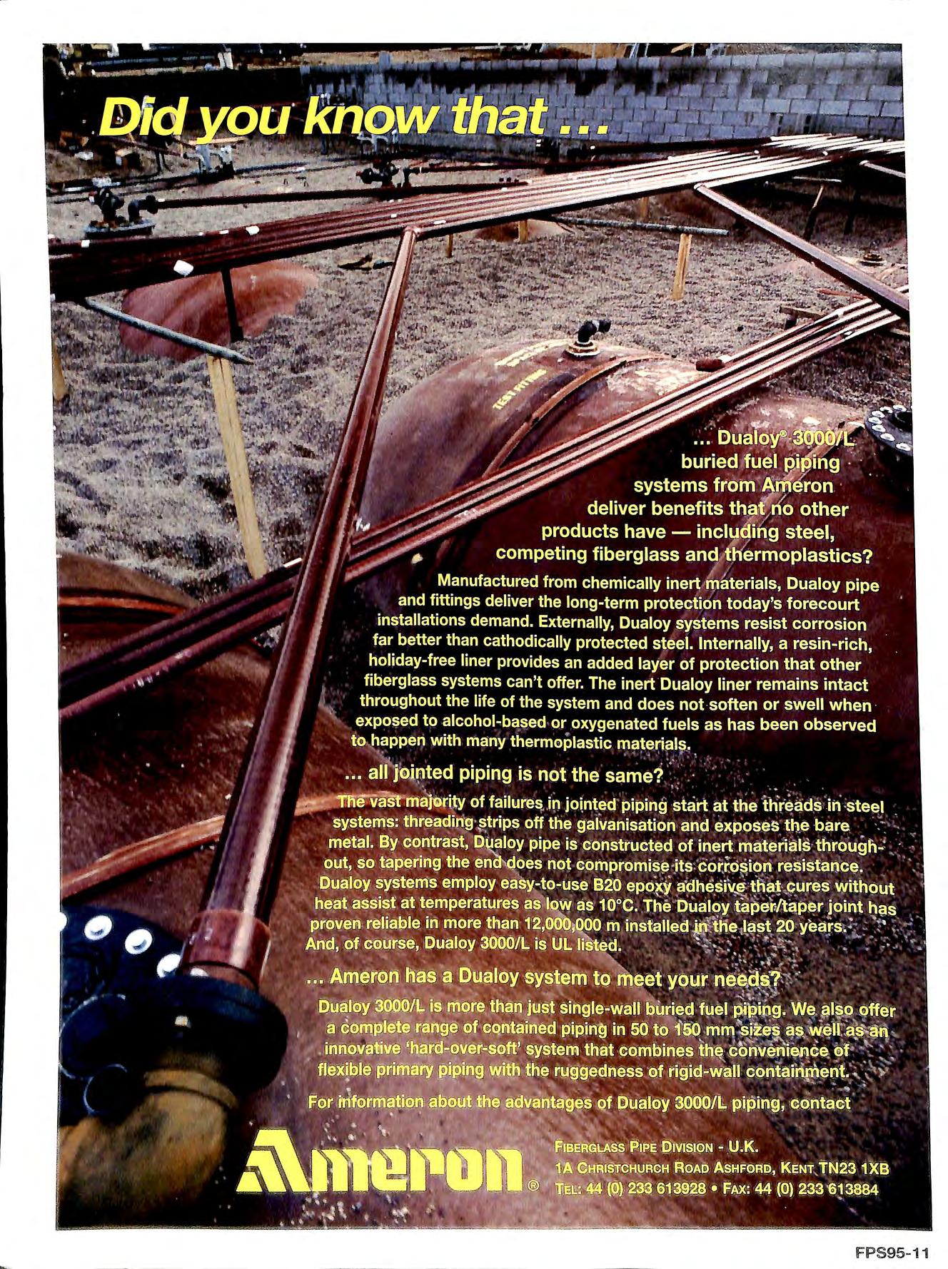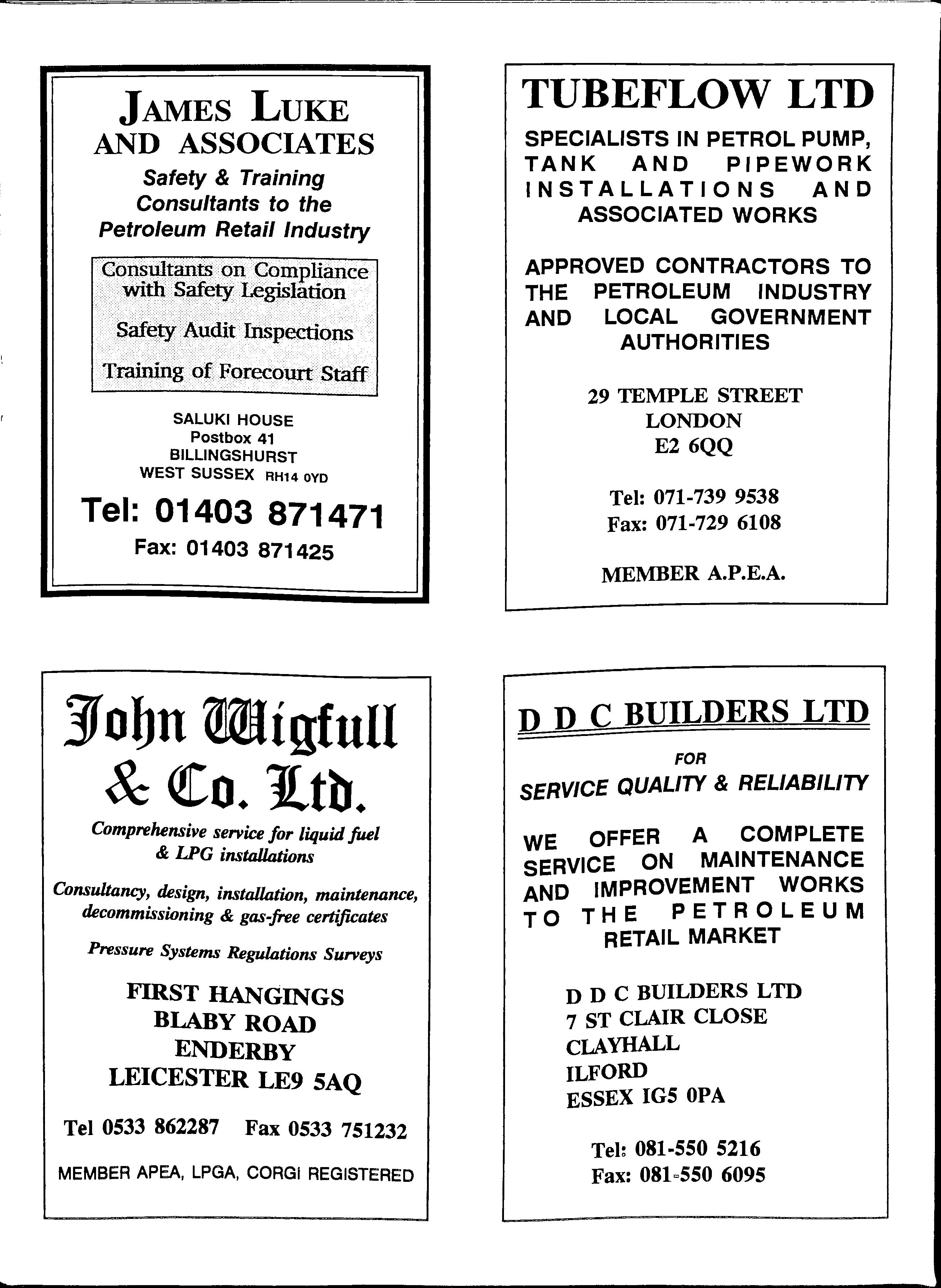 JAMES LUKE AND ASSOCIATES Safety & Training Consultants to the Petroleum Retail Industry SALUKI HOUSE Postbox 41 BILLINGSHURST WEST SUSSEX RH14 ova Tel: 01403 871471 Fax: 01403 871425 1 obn ull & 1Ltb. Comprehensive service for liquid fuel & LPG installations Consultancy, design, installation, maintenance, decommissioning & gas-free certificates Pressure Systems &gulations Surveys FIRST HANGINGS BLABYROAD ENDERBY LEICESTER LE9 SAQ Tel 0533 862287 Fax 0533 751232 MEMBER APEA, LPGA, CORGI REGISTERED TUBEFLOW LTD SPECIALISTS IN PETROL PUMP, TANK AND PIPEWORK INSTALLATIONS AND ASSOCIATED WORKS APPROVED CONTRACTORS TO THE PETROLEUM INDUSTRY AND LOCAL GOVERNMENT AUTHORITIES 29 TEMPLE STREET LONDON E2 6QQ Tel: 071-739 9538 Fax: 071-729 6108 MEMBER A.P.E.A. D D C BUILDERS LTD FOR SERVICE QUALITY & RELIABILITY WE OFFER A COMPLETE SERVICE ON MAINTENANCE AND IMPROVEMENT WORKS TO THE PETROLEUM RETAIL MARKET D D C BUILDERS LTD 7 ST CLAIR CLOSE cLAYHALL ILFORD ESSEX IG5 OPA Tel: 081-550 5216 Fax: 081.,550 6095