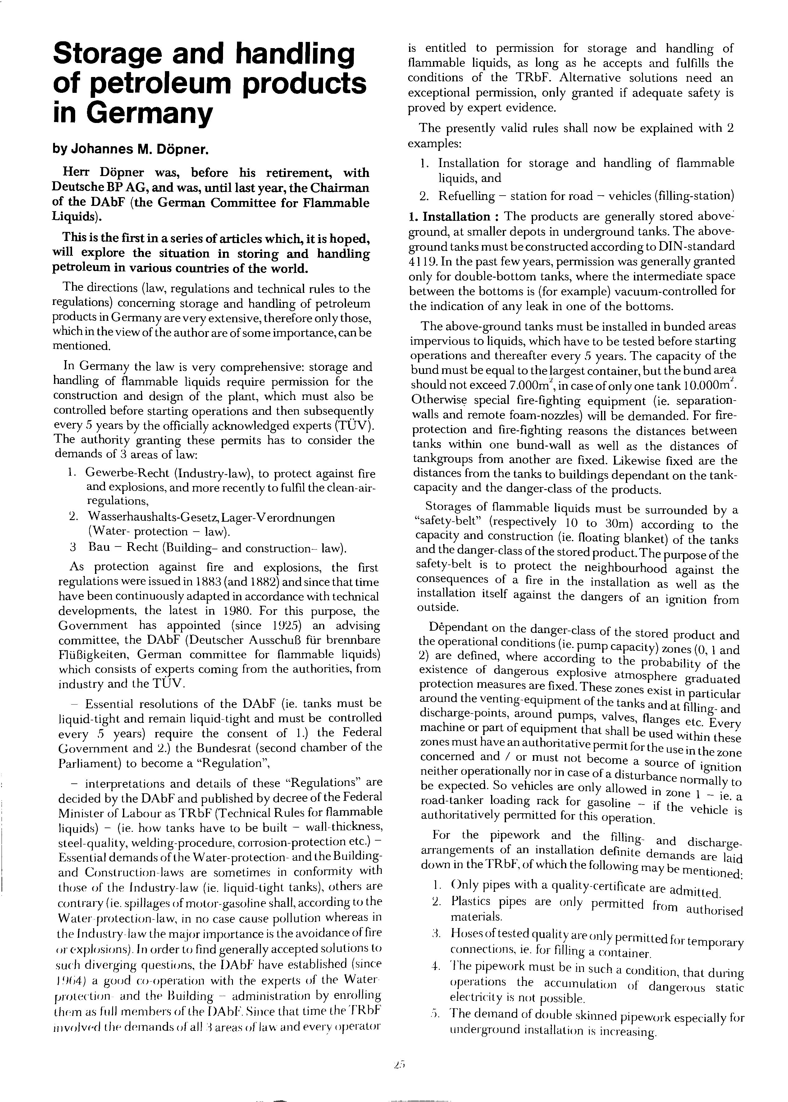 The directions (law, regulations and technical rules to the regulations) concerning storage and handling of petroleum products in Germany are very extensive, therefore only those, which in the view of the author are of some importance, can be mentioned.