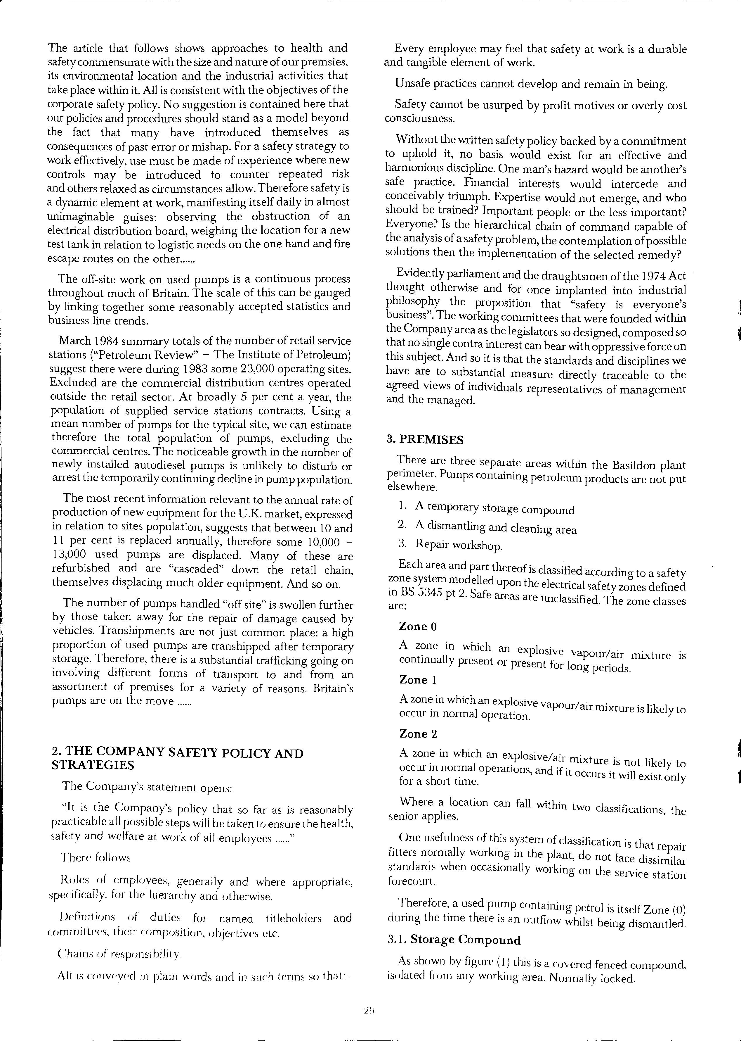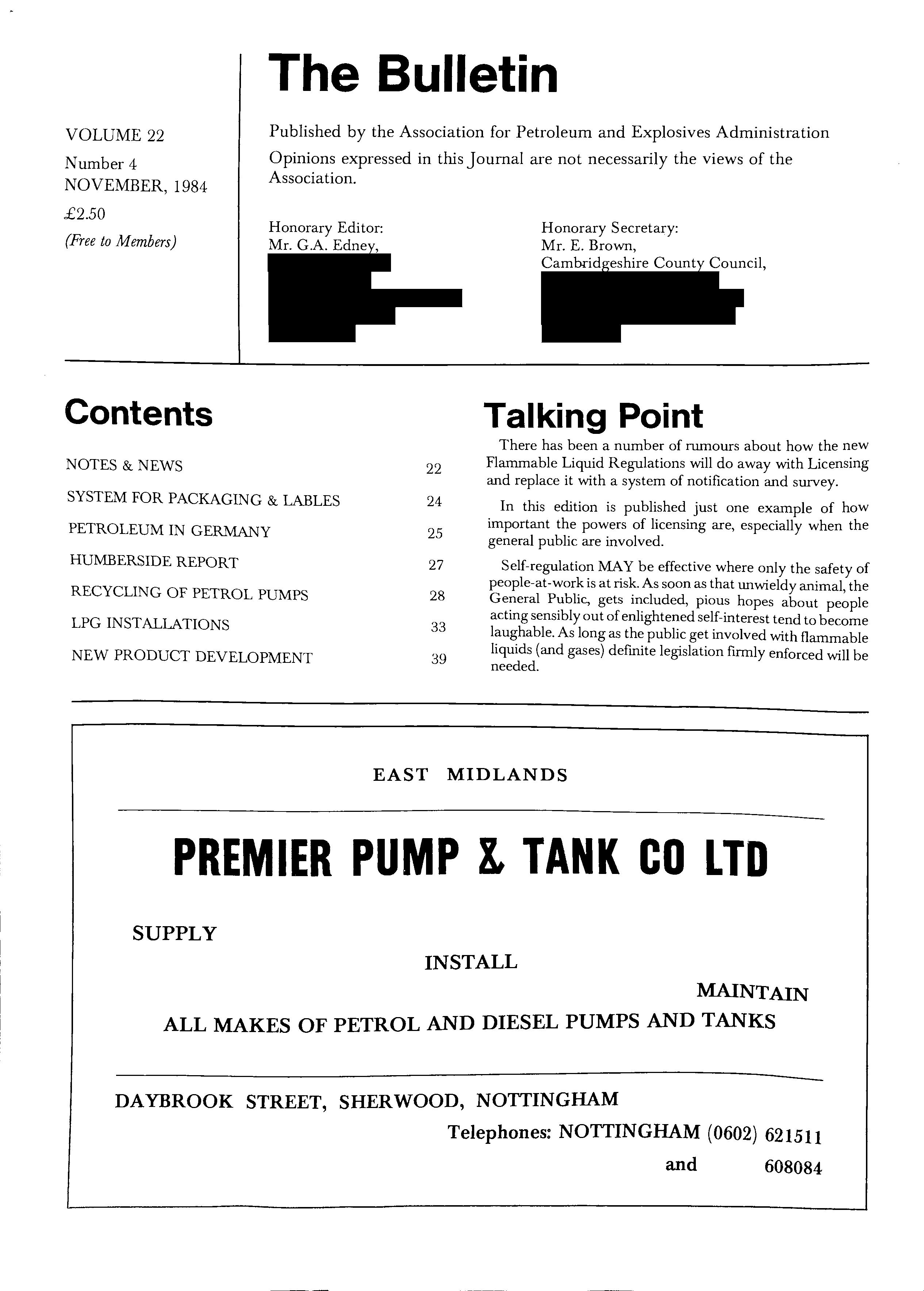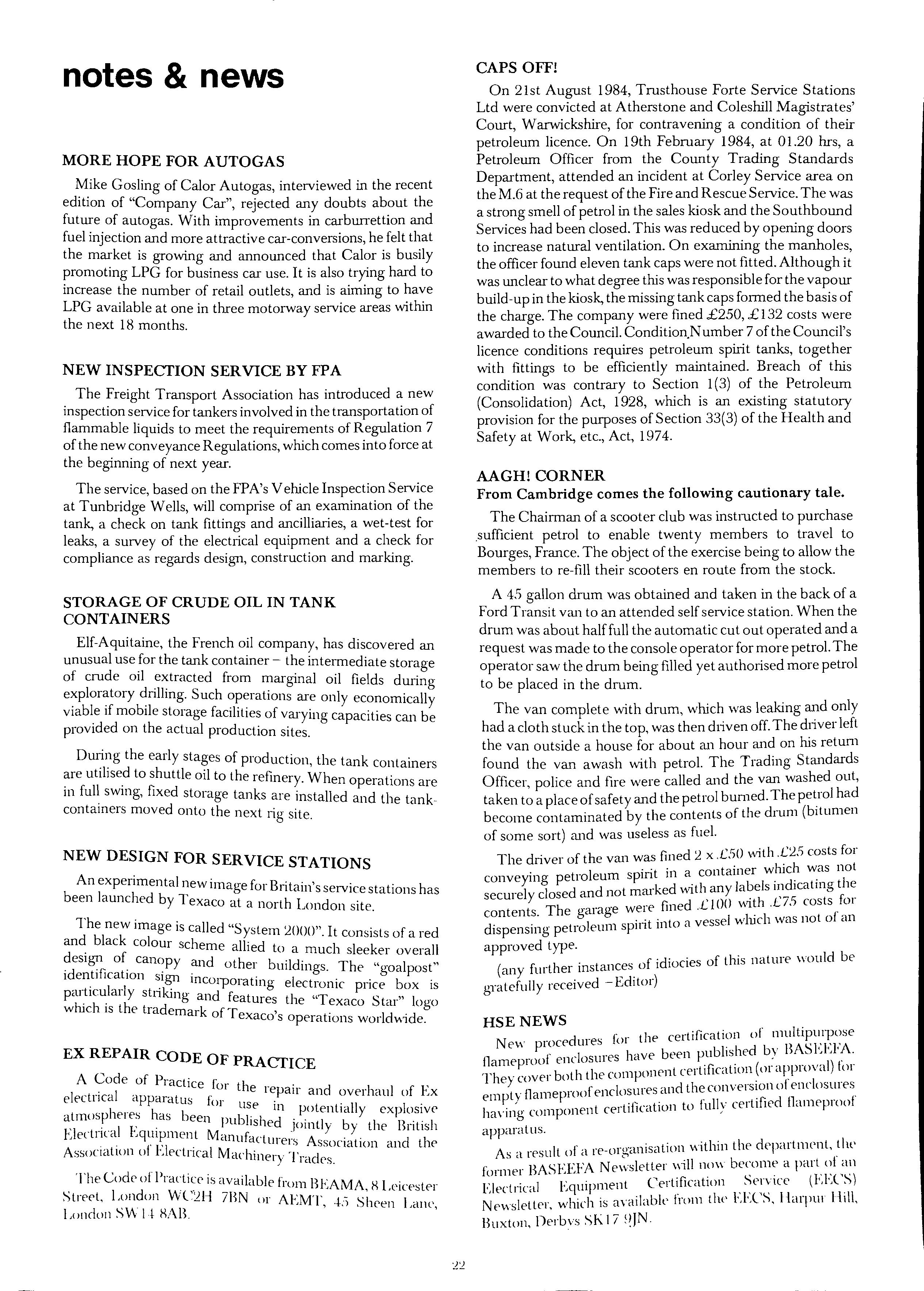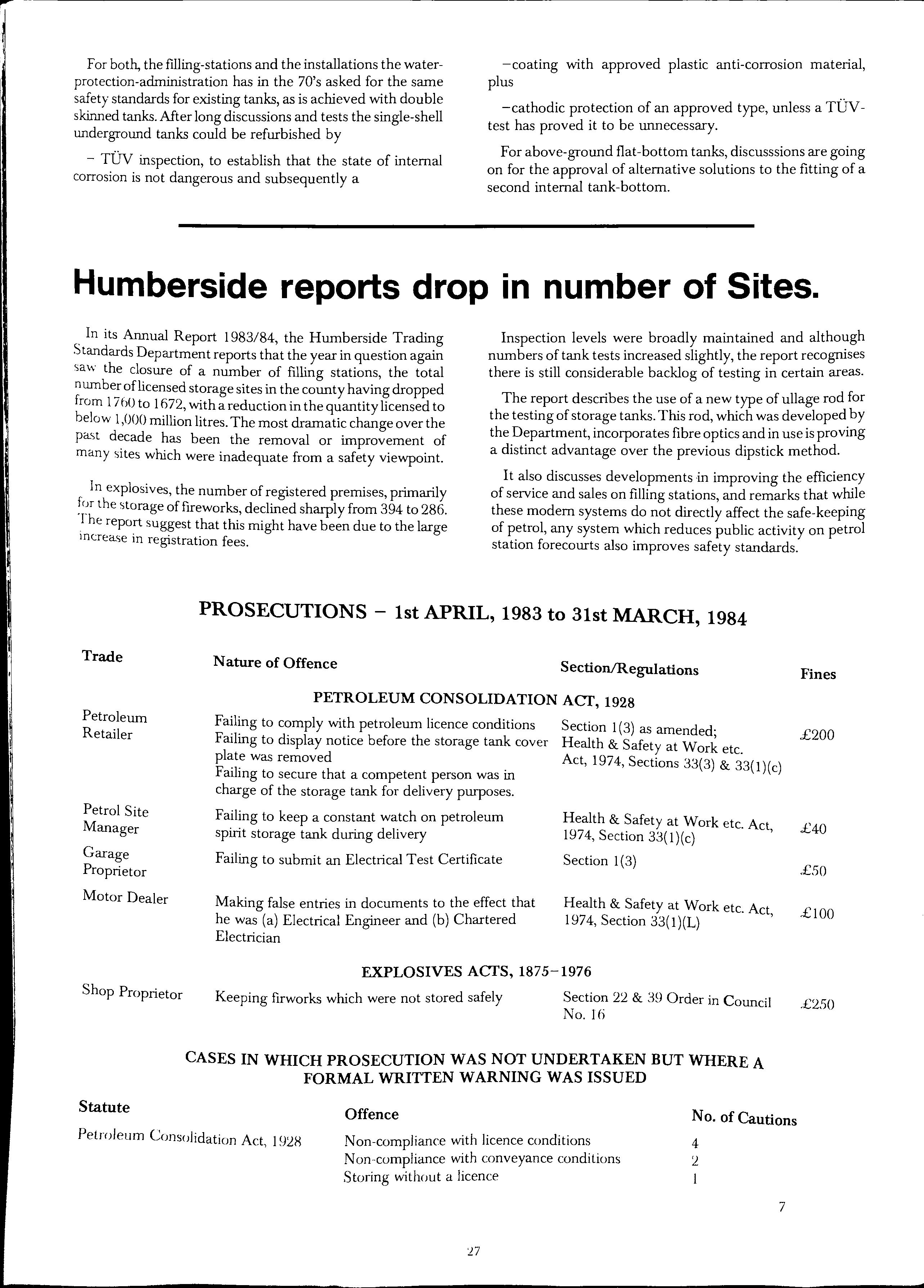 In its Annual Report 1983/84, the Humberside Trading Standards Department reports that the year in question again saw the closme of a number of filling stations, the total number of licensed storage sites in the county having dropped from 17b!) to 1672, with a reduction in the quantity licensed to below 1,000 million litres. The most dramatic change over the decade has been the removal or improvement of many sites which were inadequate from a safety viewpoint.