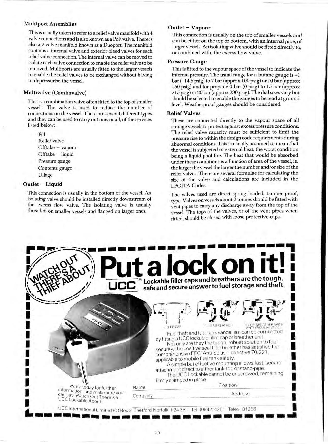 LPG is delivered by road tanker and transferred to the vessel using a vehicle mounted transfer pump. antistatic hose on the tanker is connected to a fill couplmg, either on the vessel or on an extended fill line. The hose/fill coupling thread sizes are gradually becoming standardised. The most common thread for butane is 31/'1" ACME and for porpane 1%" ACME. The fIll coupling should be protected from the vessel pressure by an isolating valve and a check valve. The latter is to prevent loss of vessel contents m the event of a hose burst. The internal fill pipework usually ends in the vapour space of the vessel. This causes the liquid to expand when entering, giving a cooling effect and helps to reduce the rate of pressure rise.