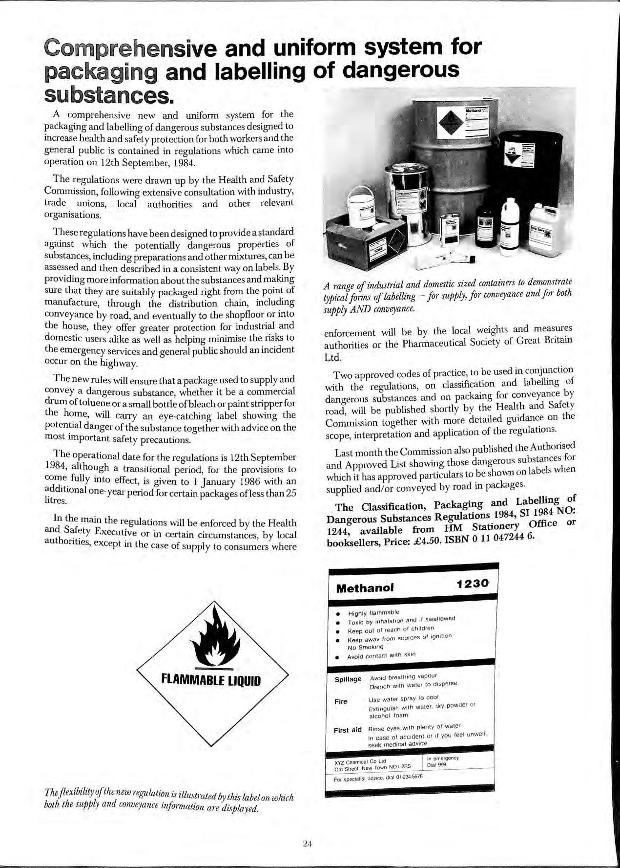 A comp h ' re enslve new and uniform system for the packaging and labelling of dangerous substances designed to mcrease health and safety protection for both workers and the general bl"' " pu IC IS contamed m regulations which came into operation on 12th September, 1984,