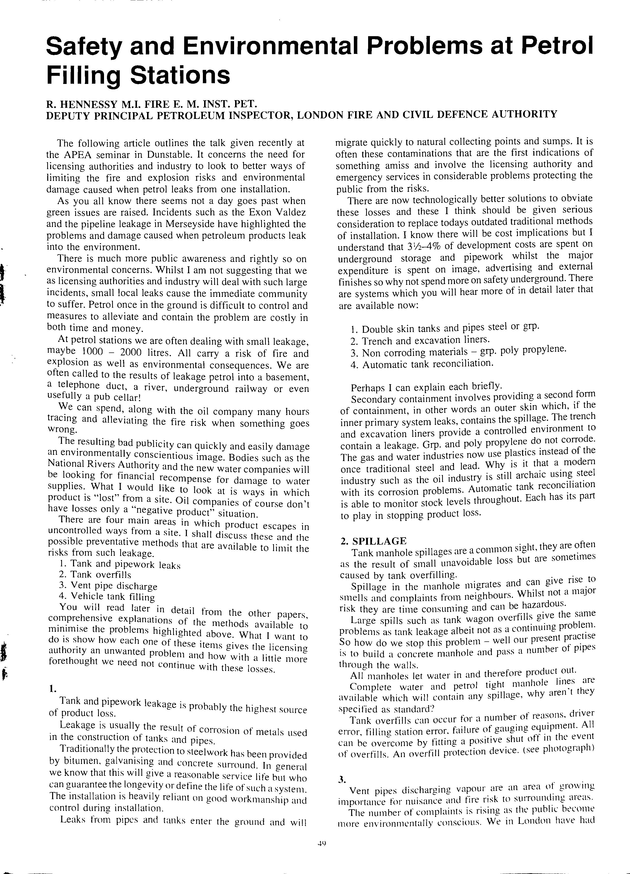 To conclude I would say that the fire and explosion risk together with damage to the environment is always present with petrol leakage. It gives the licensing authority, industry and the community problems when it occurs. There are ways available now to stop all petrol leaks and I would like to see these adopted to take us into the l 990 's .