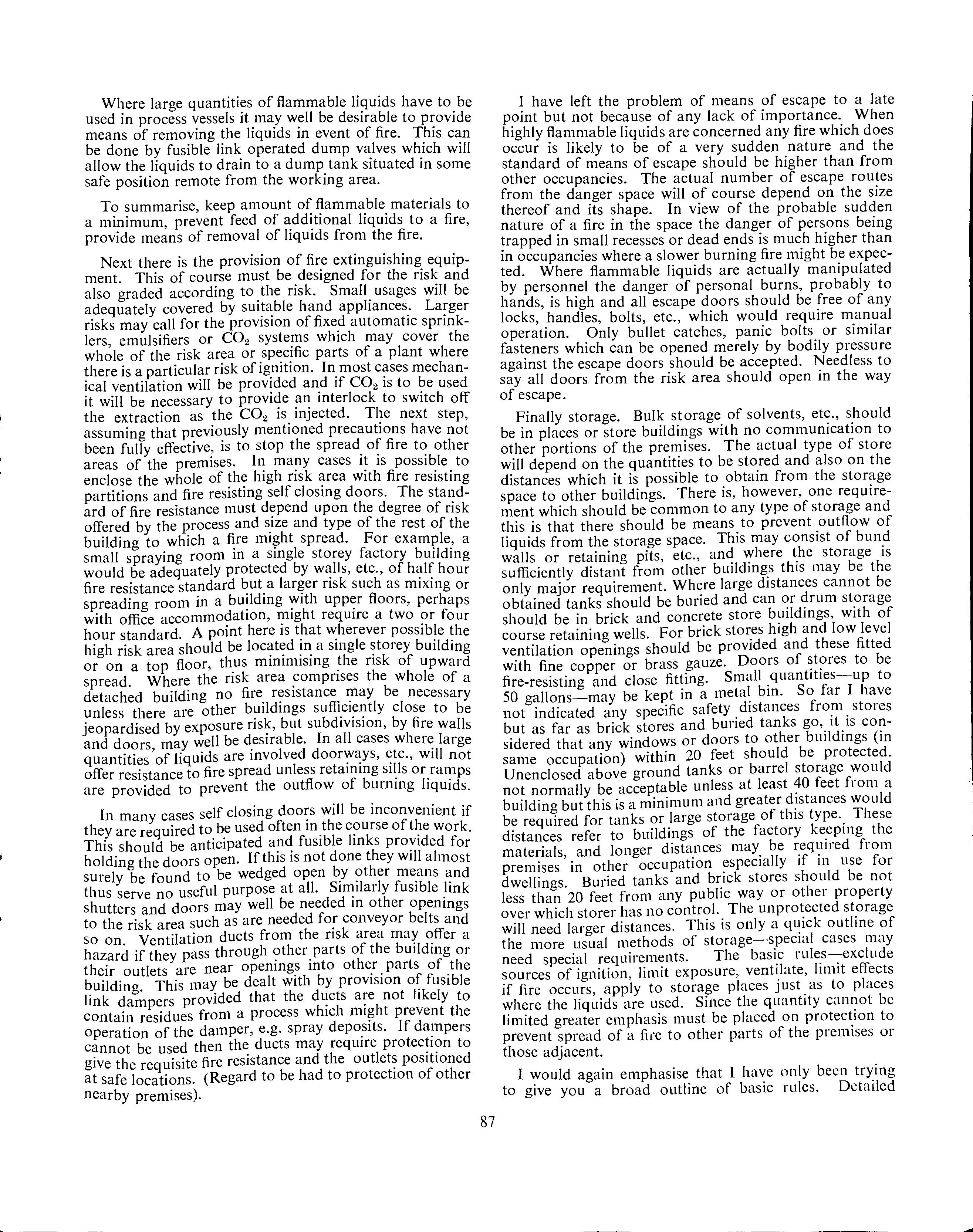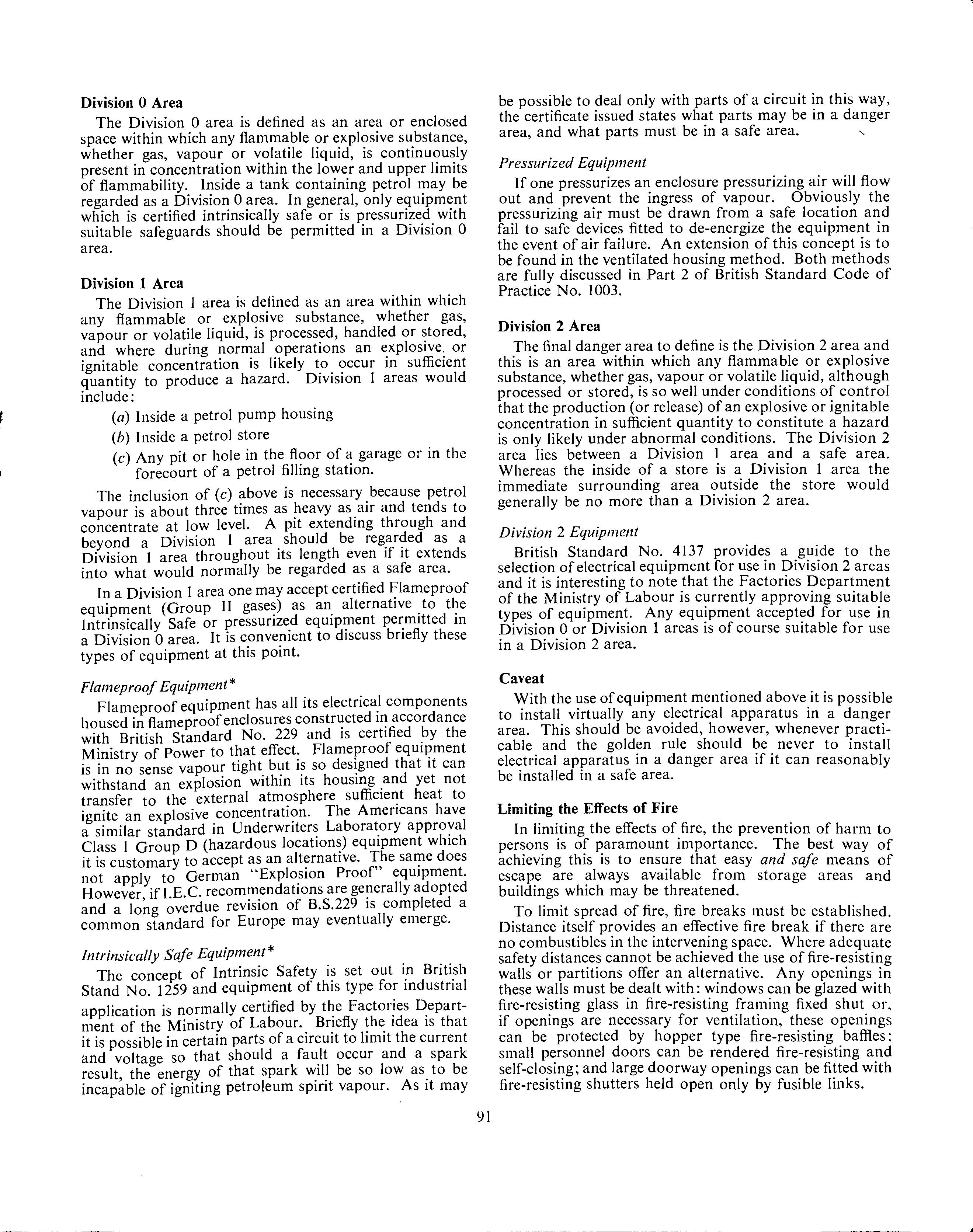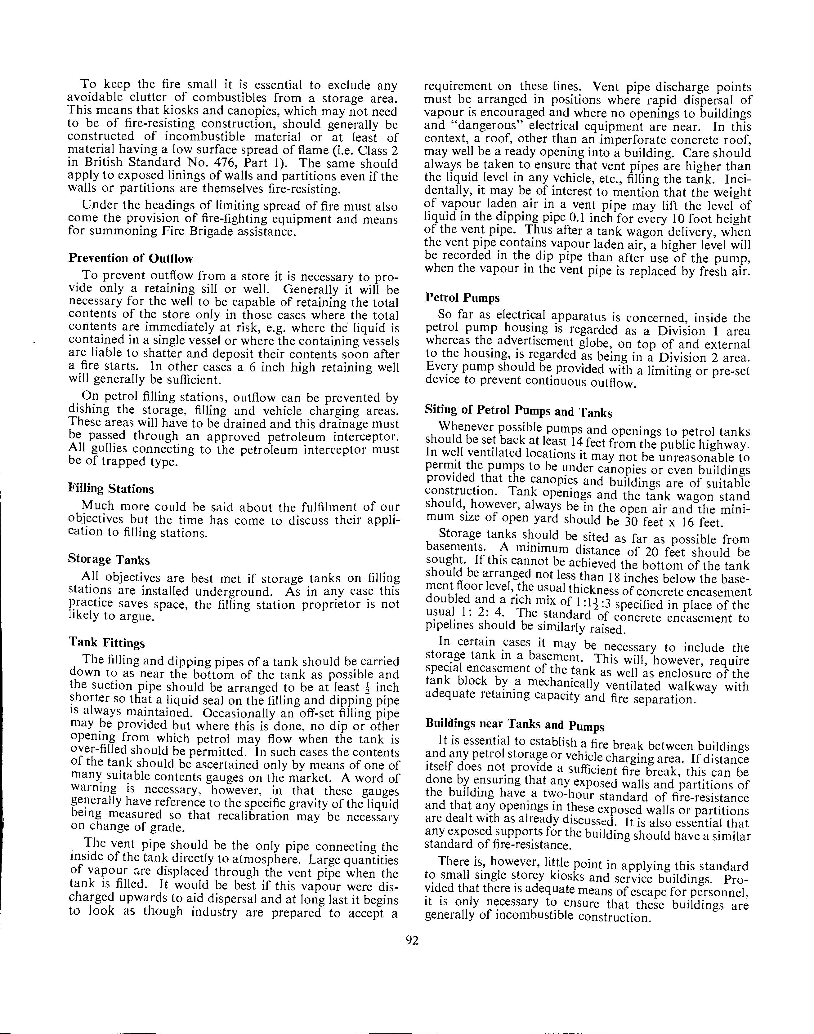 Without entering any argument as to whethe.r i.s necessary on brick store vents and tank vents, 1t is perti- nent to observe that gauzes as currently fixed should effectively prevent flame penetration of the store and tank from outside. So far as tank wagons are concerned the gauze covered holes of internal pipes are more than 23 inches and sometimes more than 44 mches from the open end. One might therefore be permitted some doubt as to the efficacy of the relevant prov1s10ns of the Conveyance Regulations. Maybe this is a point on which the Standing Advisory Committee on Dangerous Substances should sit !
