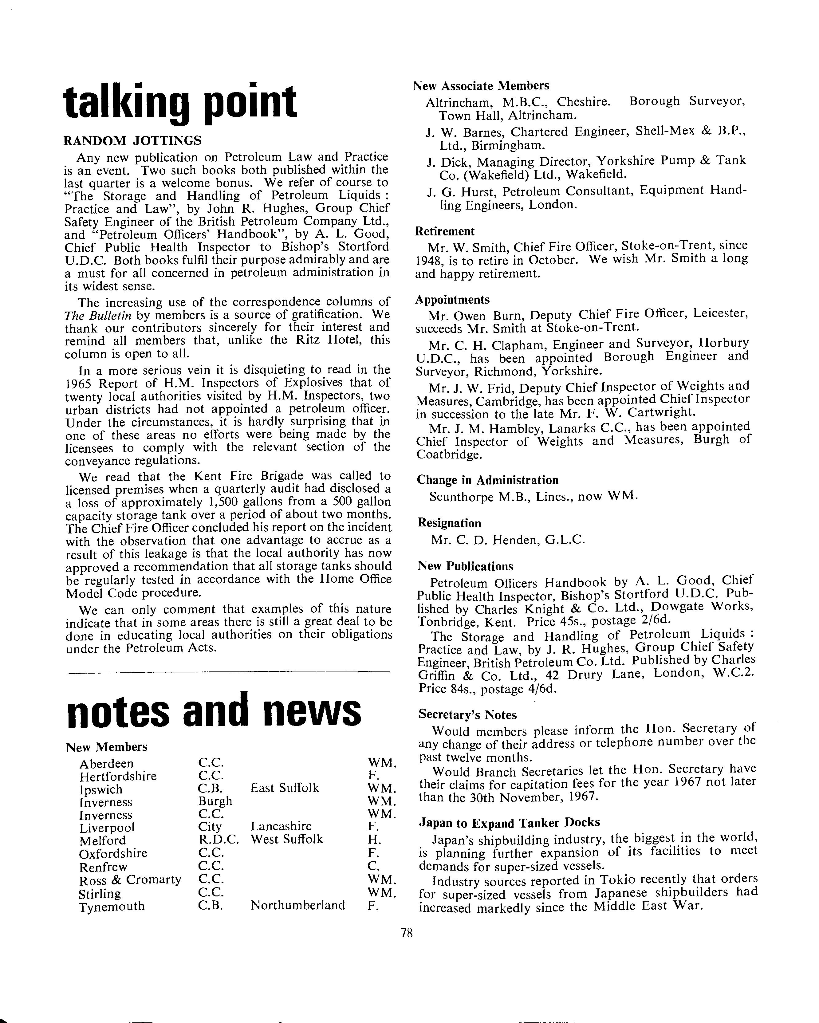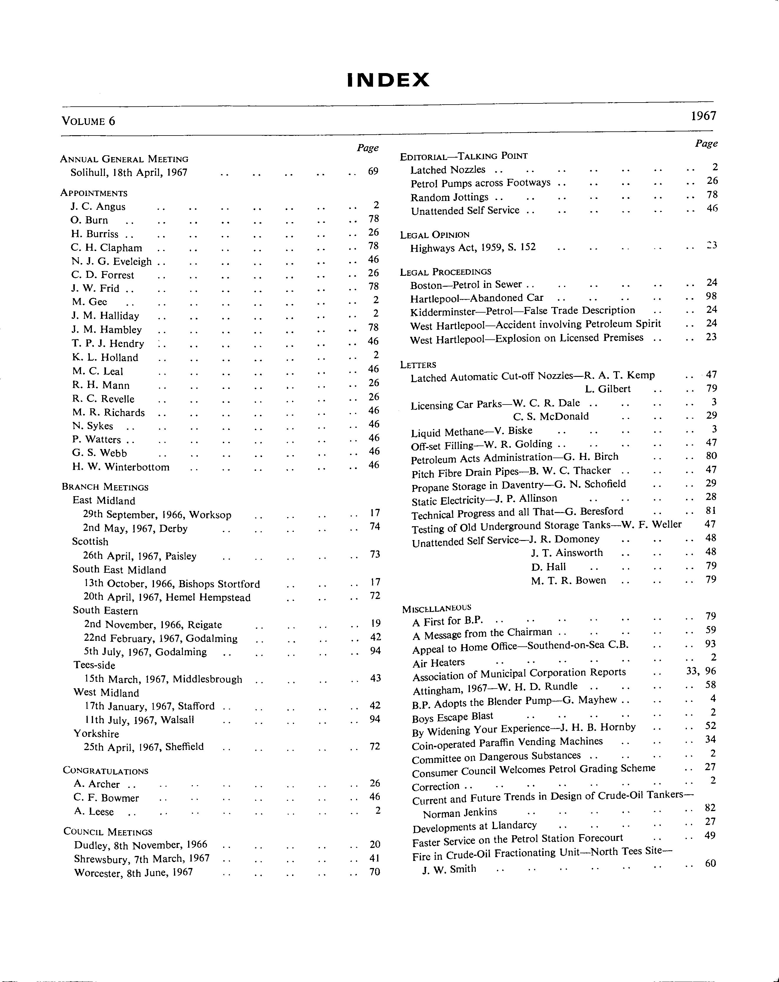 Liquid Methane-V. Biske 3 Off-set Filling-W. R. Golding 47 Petroleum Acts Administration-G. H. Birch 80 Pitch Fibre Drain Pipes-B. W. C. Thacker 47 Propane Storage in Daventry-G. N. Schofield 29 Static Electricity-J. P. Allinson 28 Technical Progress and all That-G. Beresford 81 Testing of Old Underground Storage Tanks-W. F. Weller 47 Unattended Self Service-J. R. Domoney 48 J. T. Ainsworth 48