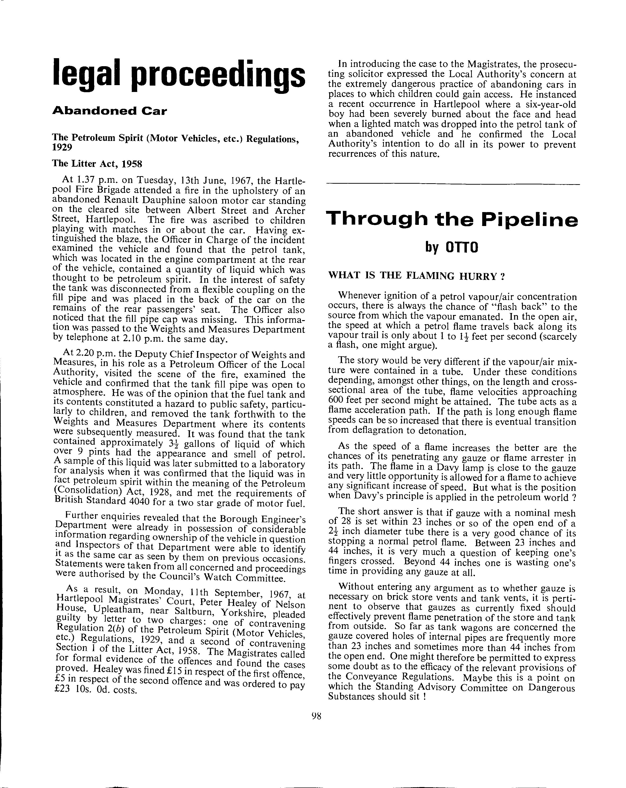 As a result, on Monday, llth September, 1967, at Hartlepool Magistrates' Court, Peter Healey of Nelson Upleatham, near Saltburn, Yorkshire, pleaded gutlty letter to two charges: one of contravening Regulat10n of the Petroleum Spirit (Motor Vehicles, etc.). Regulations,. 1929, and a second of contravening Sect10n I of the Litter Act, 1958. The Magistrates called for formal evidence of the offences and found the cases proved. Healey was fined £15 in respect of the first offence £5 in respect of the second offence and was ordered to pay £23 IOs. Od. costs.