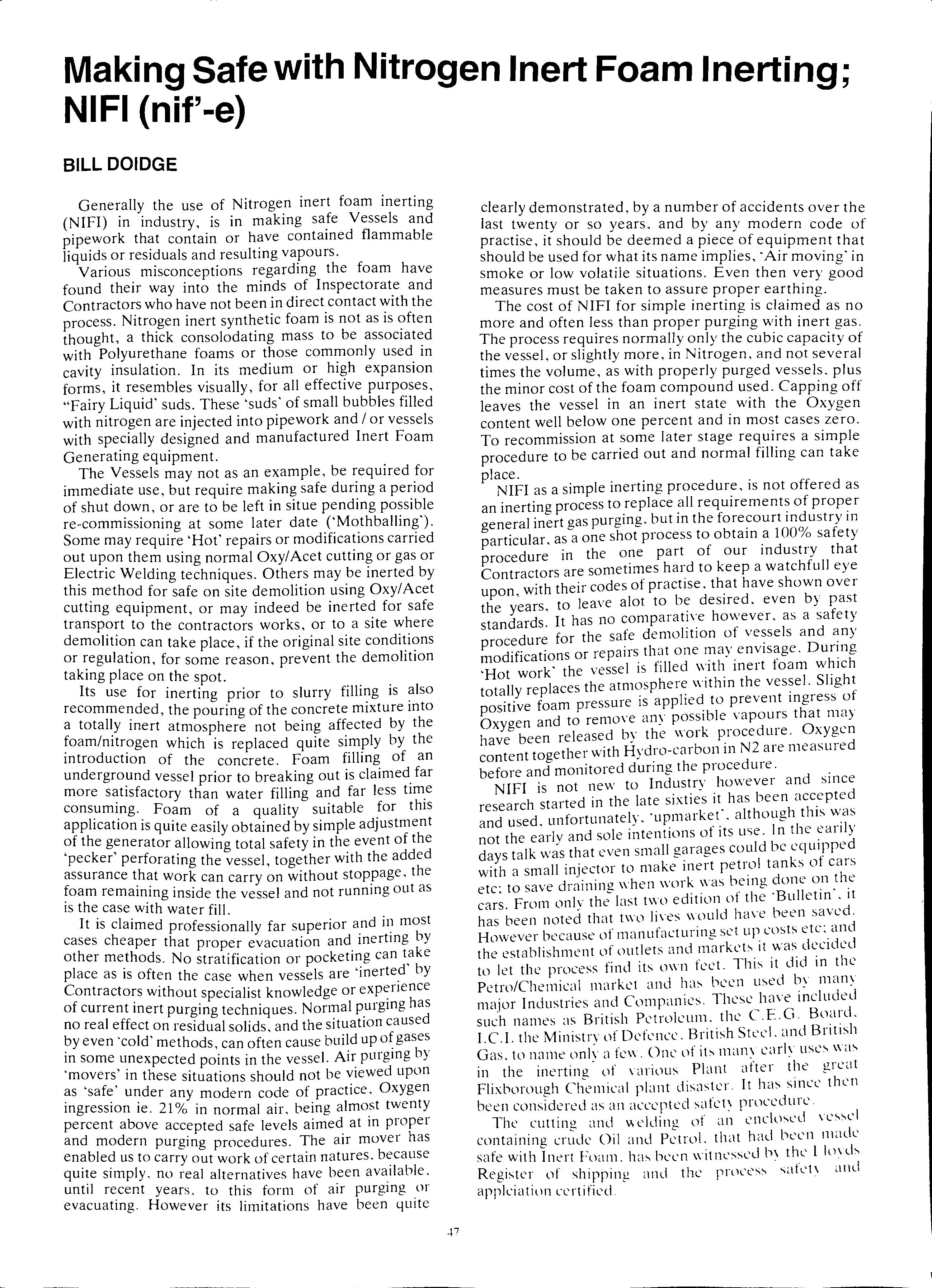 NIFI is not new to Industry however and smce research started in the late sixties it has been acc.epted and used, unfortunately, 'upmarket', although thIS w.as not the early and sole intentions of its u'Se. In the days talk was that even small garages could be eqUIpped with a small injector to make inert petrol tanks at cars etc' to save draining when work was being done on the From only th; last two edition of the 'Bulletin', it has been noted that two lives would have been saved. However because of manufacturing set up costs ete: and the establishment of outlets and markeb it was decided to let the process find its own feet. This it did in the Petm/Chemical market and been used by many major Industries and Companies. These have included such names as British Petroleum. the e.E.G. Board. 1.e.1. the Ministry of Defence. British Steel. and British Gas, to name a few. Onc of its many earl\" was in the inerting of \"arious Plant at-ter the great Flixborough Chemical plant disaster. It has since then been considered as an accepted procedure.