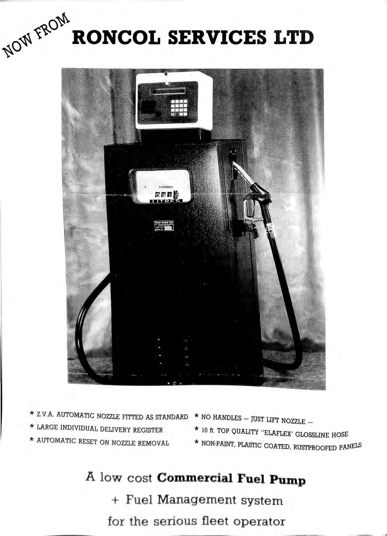 RONCOL SERVICE S LTD * Z.V A AUTOMATIC NOZZLE F1TTED AS STANDARD * NO HANDLES JUST LIFT NOZZLE _ * LARGE INDIVIDUAL DELIVERY REGISTER * AUTOMATIC RESET ON NOZZLE REMOVAL * 10 ft. TOP QUALITY "ELAFLEX' GLOSSLINE HOSE * NON PAINT, PLASTIc COATED, RUS1'PROOFED A low cost Commercial Fuel Pump + Fuel Management system for th e serious fleet operator