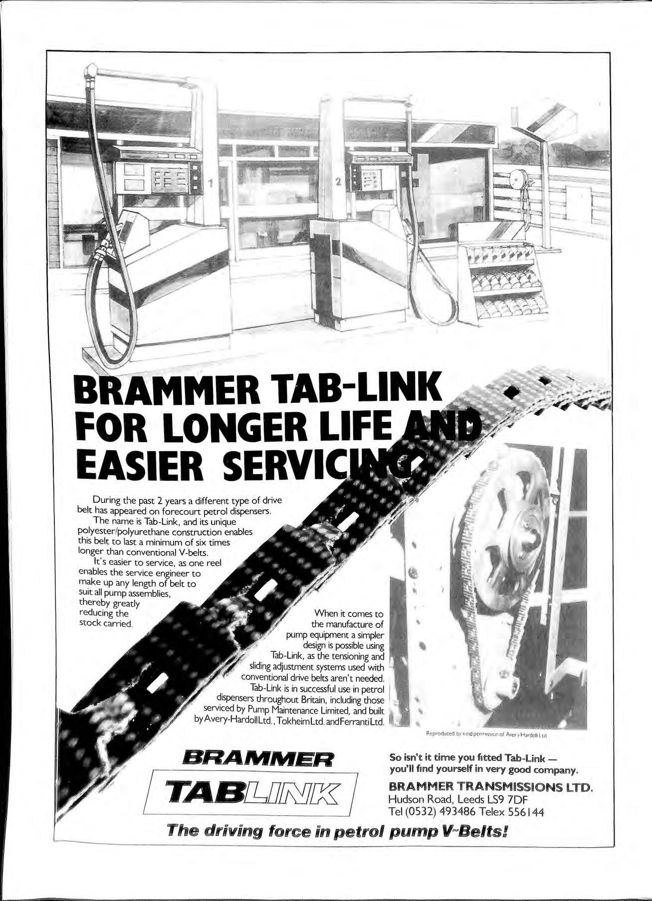 I BRANlNlER So isn't it time you fotted Tab-link _ you'll fund yourself in very good company BRAMMER TRANSMISSIONS LTD. Hudson Road, Lee ds LS9 7DF Te l (0532) 493486 Telex 556144 The driving forGe in petrol pump V=Belts!