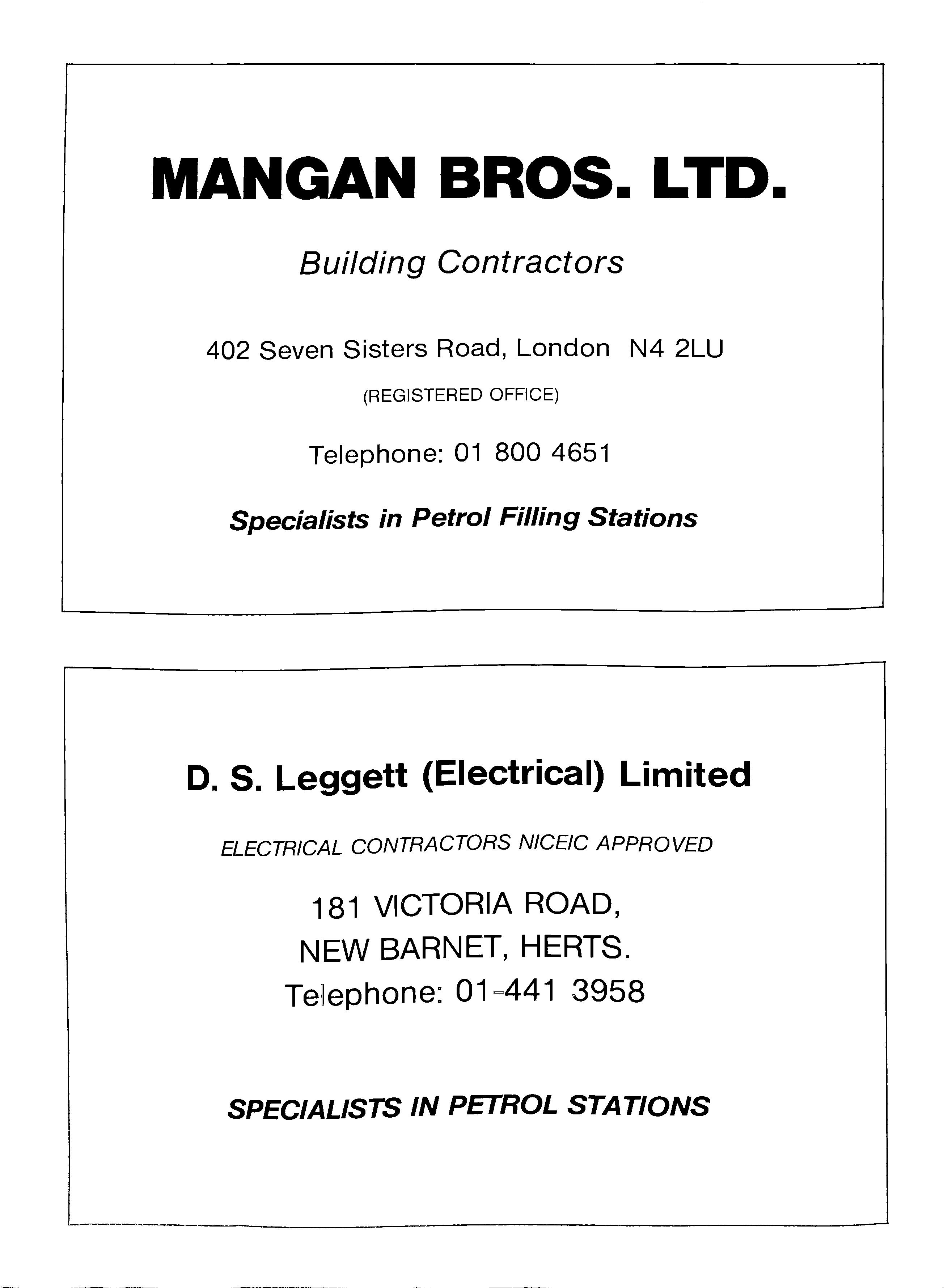 MANGAN BROS. LTD. Building Contractors 402 Seven Sisters Road, London N4 2LU (REGISTERED OFFICE) Telephone: 01 800 4651 Specialists in Petrol Filling Stations D. S. Leggett (Electrical) Limited ELECTRICAL CONTRACTORS NICEIC APPROVED 181 VICTORIA ROAD, NEW BARNET, HERTS. 01 =441 3958 SPECIALISTS IN PETROL STATIONS