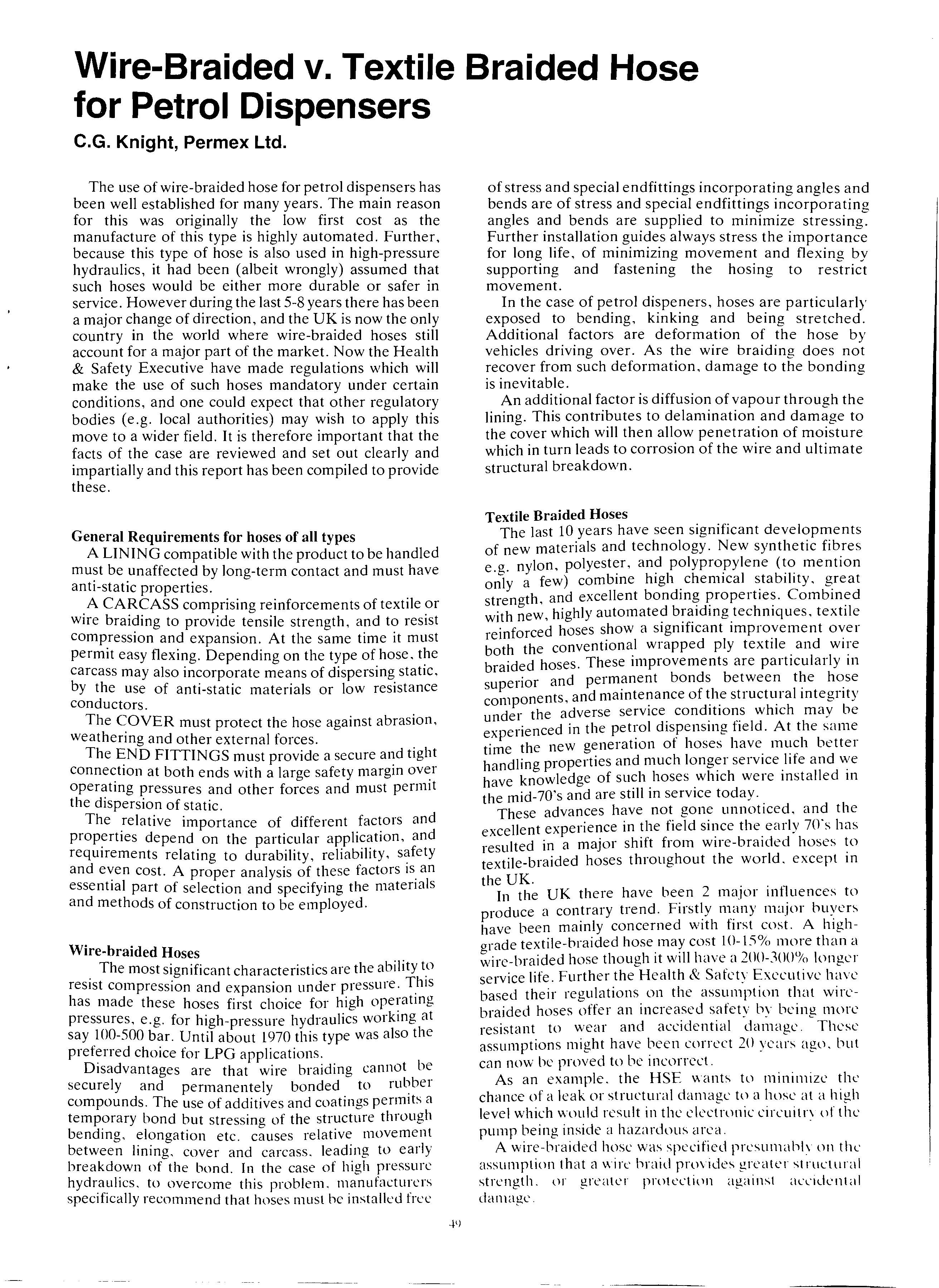 In the UK there have been 2 major influences to produce a con.trary trend. major have been mall1ly concerned With hrst cost. A hlghgrade textile-braided hose.may cost 10-15% more than a wire-braided hose though It wdl have a 20()-300% longer service life. Further the Health & Safety Executive have based their regulations on the assumption that wirebraided hoses offer an increased safety by being more resistant to wear and accidential damage. These assumptions might have been correct 2() years ago. but can now be proved to be incorrect.