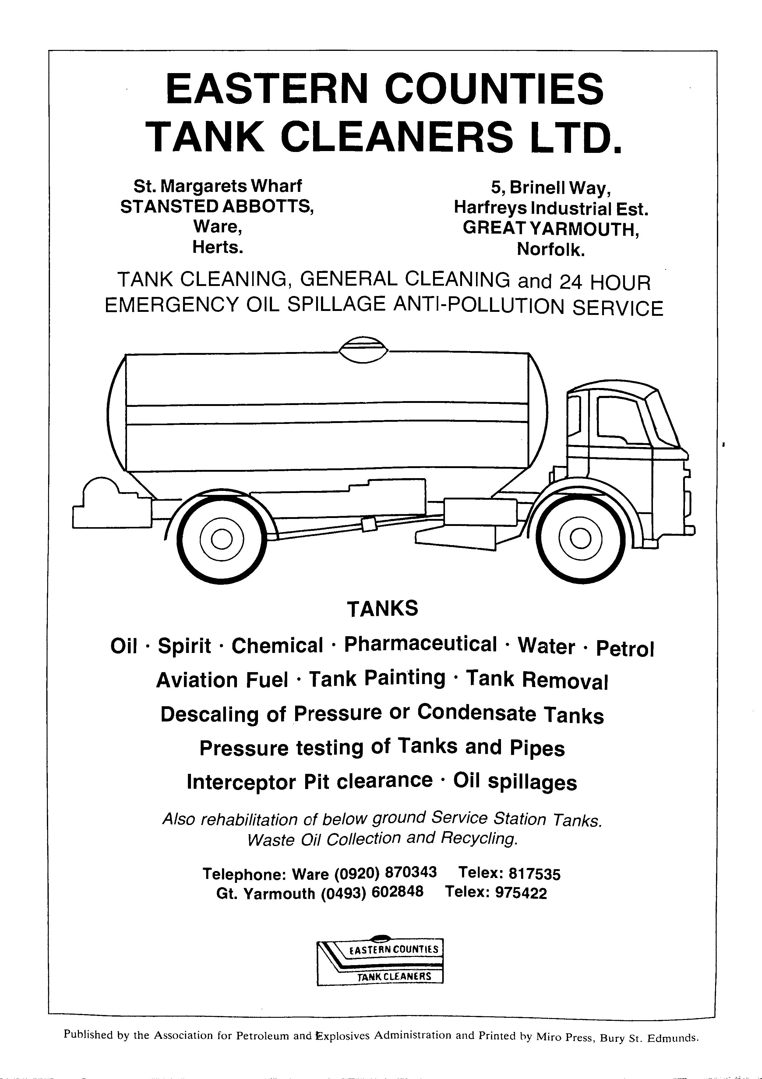 EASTERN COUNTIES TANK CLEANERS LTD. St. Margarets Wharf STANSTED AB BOTTS, Ware, Herts. 5, Brinell Way, Harfreys Industrial Est. GREAT YARMOUTH, Norfolk. TANK CLEANING, GENERAL CLEANING and 24 HOUR EMERGENCY OIL SPILLAGE ANTI-POLLUTION SERVICE TANKS Oil . Spirit· Chemical . Pharmaceutical . Water · Petrol Aviation Fuel· Tank Painting · Tank Removal Descaling of Pressure or Condensate Tanks Pressure testing of Tanks and Pipes Interceptor Pit clearance · Oil spillages Also rehabilitation of below ground Service Station Tanks. Waste Oil Collection and Recycling. Telephone: Ware (0920) 870343 Telex: 817535 Gt. Yarmouth (0493) 602848 Telex: 975422 EASTE RN COUNTIES mNKCL£ANERS Published by the Association for Petroleum and Explosives Administration and Printed hy Miro Press, Bury St. Edmunds.