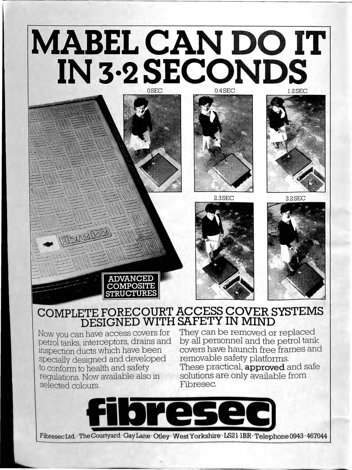 MABEL CAN DO IT IN 3-2 SECONDS OSEC 0.4 SEC 1.2 SEC .,........,,=-"""" 2.3SEC COMPLETE FORECOURT ACCESS COVER SYSTEMS DESIGNED WITH SAFETY IN MIND Now you can have access cov:ers for petrol tanks interceptors, draIns and mspectlOn.'ducts WhICh have been specially designed and developed to conform to health and Elafety regulations. Now available also in selected colours. They can be removed or replaced by all personnel and the petrol tank covers have haunch free frames and removable safety platforms. These practical, approved and safe solutions are only available from Fibresec. Fibresec Ltd .. The CourtYard . Gay Lane ' Otley ' West Yorkshire' LS211BR· Telephone 0943' 467044 L· rW