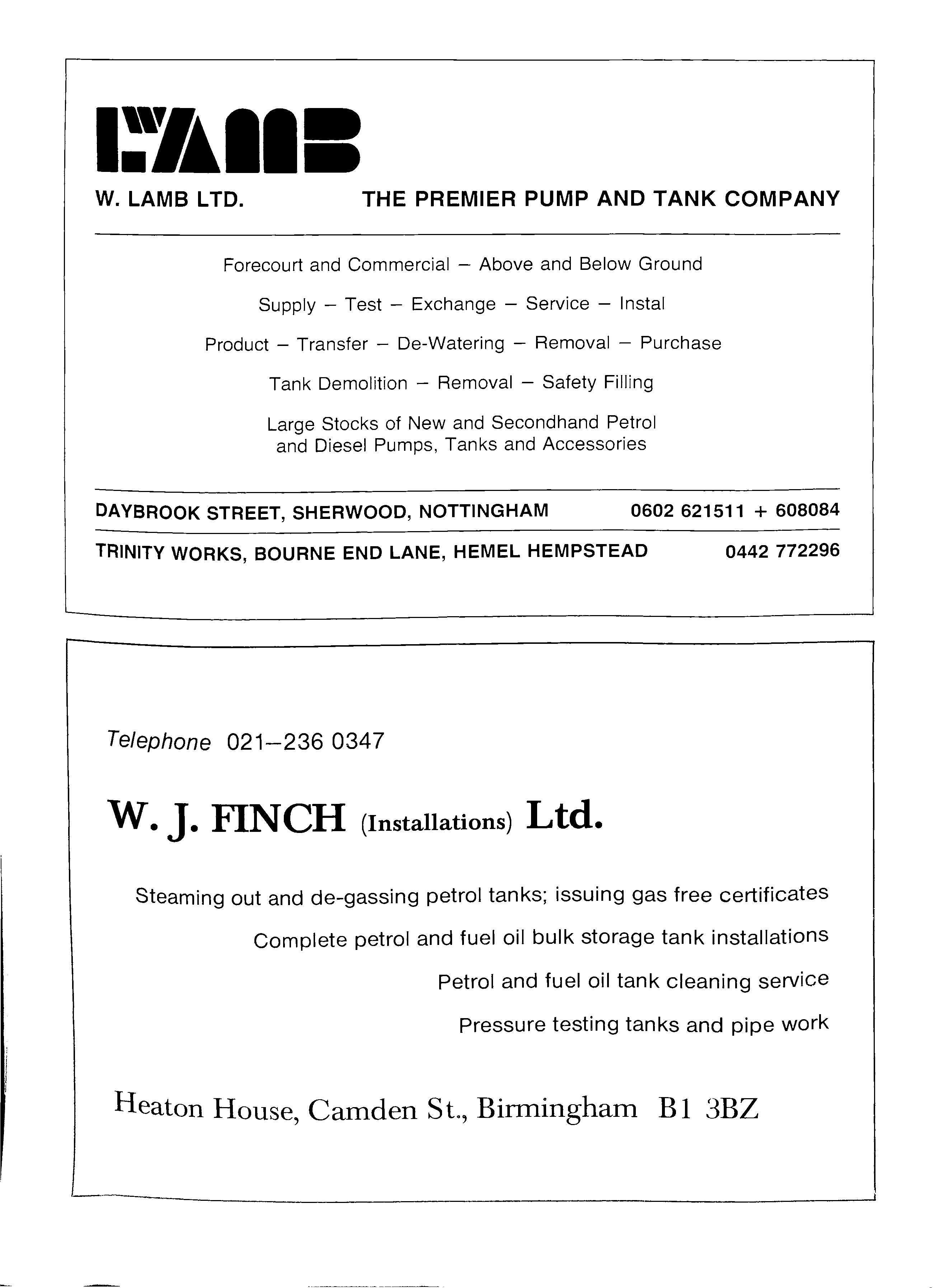 W. LAMB LTD. THE PREMIER PUMP AND TANK COMPANY Forecourt and Commercial Above and Below Ground Supply - Test - Exchange - Service - Instal Product Transfer De-Watering Removal Purchase Tank Demolition Removal Safety Filling Large Stocks of New and Secondhand Petrol and Diesel Pumps, Tanks and Accessories DAYBROOK STREET, SHERWOOD, NOTTINGHAM 0602 621511 + 608084 TRINITY WORKS, BOURNE END LANE, HEMEL HEMPSTEAD 0442772296 Telephone 021-236 0347 w. J. FINCH (Installations) Ltd. Steaming out and de-gassing petrol tanks; issuing gas free certificates Complete petrol and fuel oil bulk storage tank installations Petrol and fuel oil tank cleaning service Pressure testing tanks and pipe work Heaton House, Camden St., Birmingham BI 3BZ
