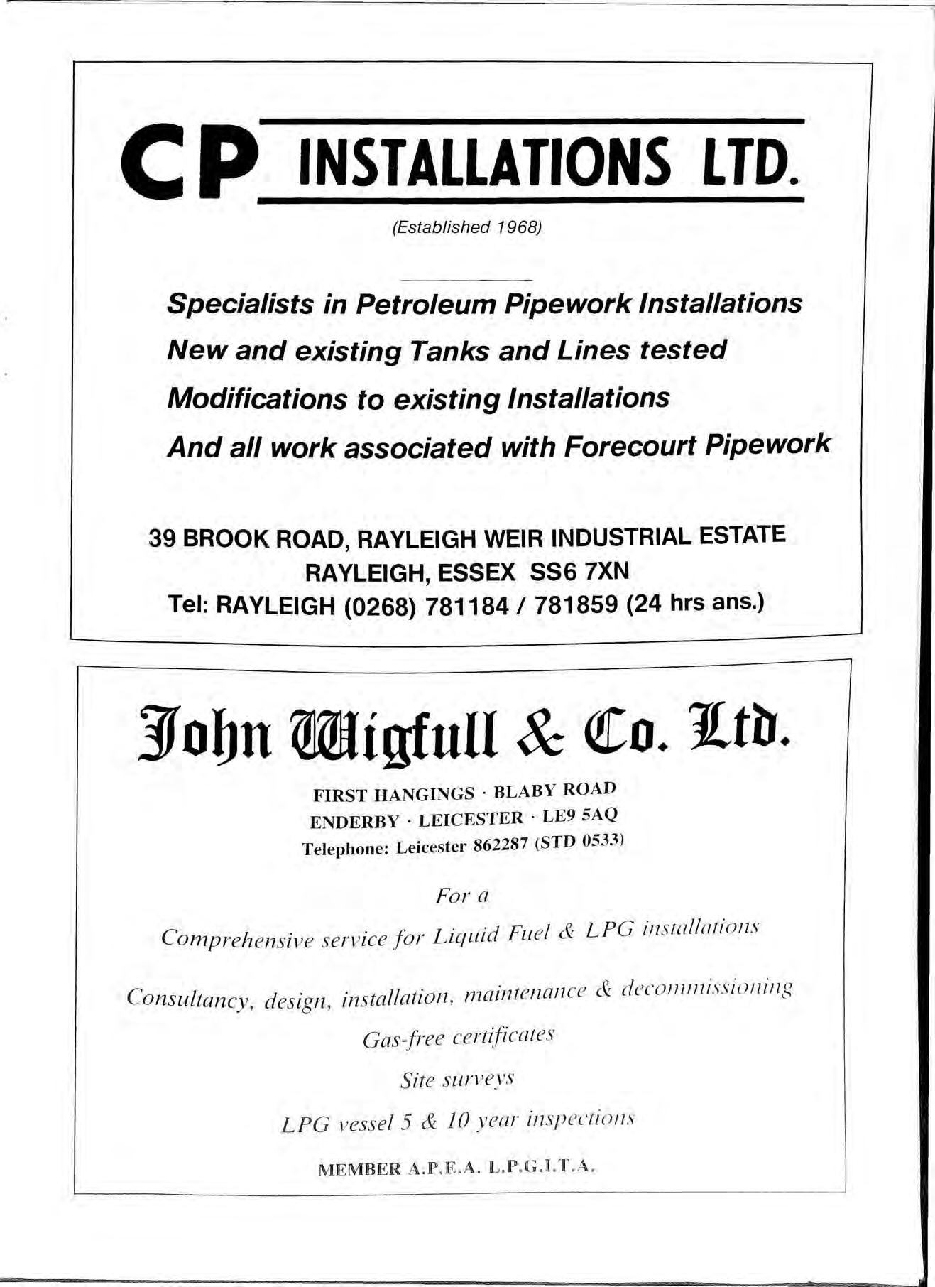 c P INSTALLATIONS LTD. (Established 1968) Specialists in Petroleum Pipework Installations New and existing Tanks and Lines tested Modifications to existing Installations And all work associated with Forecourt Pipework 39 BROOK ROAD, RAYLEIGH WEIR INDUSTRIAL ESTATE RAYLEIGH, ESSEX SS67XN Tel: RAYLEIGH (0268) 781184 / 781859 (24 hrs ans.) }obn & ([0. l£tb. FIRST HANGINGS· BLABY ROAD ENDERBY . LEICESTER . LE9 sAQ Telephone: Leicester 862287 (STD 0533) For a Comprehensive service for Liquid Fuel & LPG insW//ntion s Consultancy, design , installation , lnaint enance & d eco lJlll1issiolling Gas-free certificates Site survevs -' LPG vesse l 5 & 10 year insp ec tions