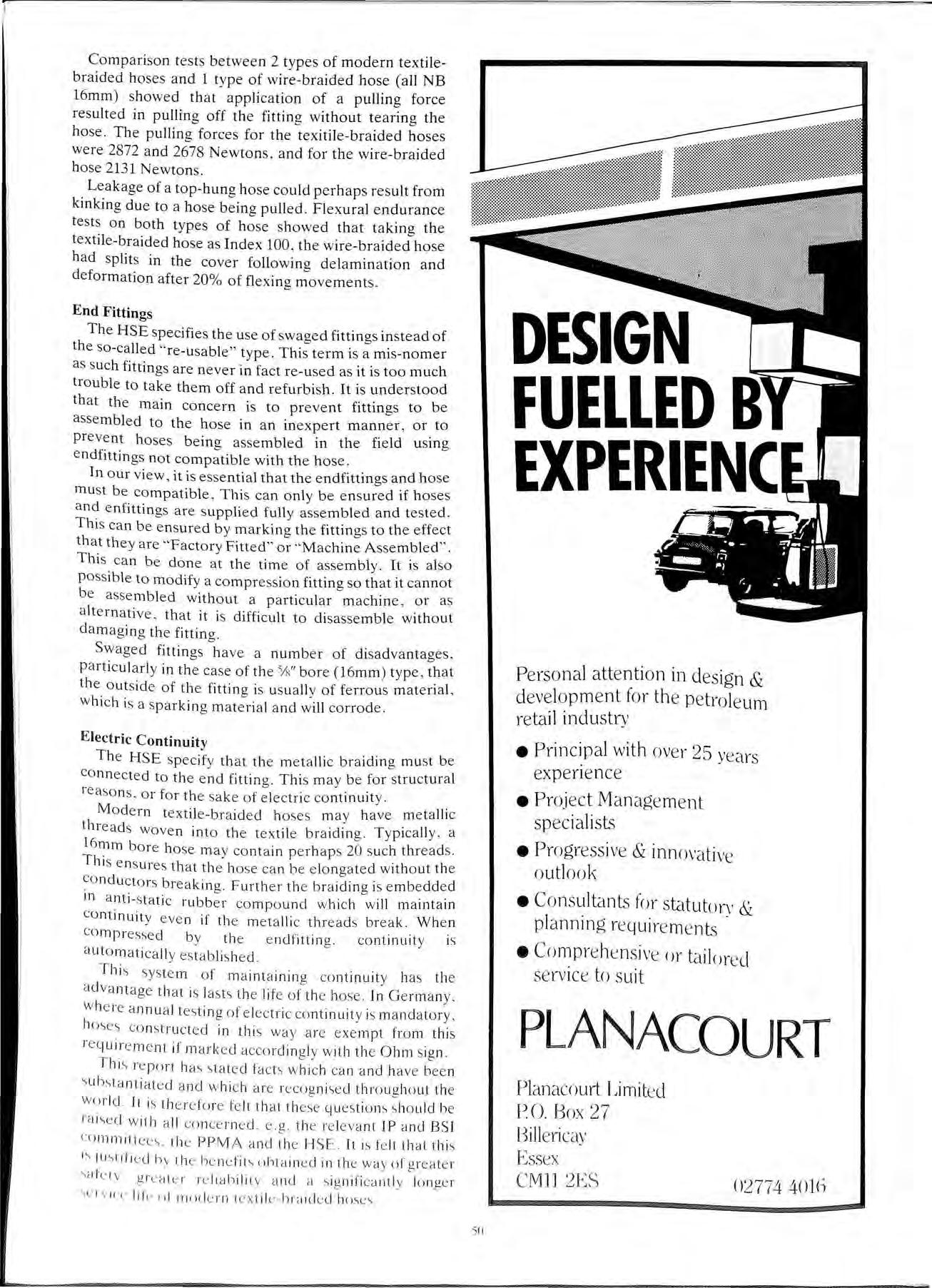 The use of wire-braided hose for petrol dispensers has been well established for many years. The main reason for this was originally the low first cost as the manufacture of this type is highly automated. Further, because this type of hose is also used in high-pressure hydraulics, it had been (albeit wrongly) assumed that such hoses would be either more durable or safer in service. However during the last 5-8 years there has been a major change of direction, and the UK is now the only country in the world where wire-braided hoses still account for a major part of the market. Now the Health & Safety Executive have made regulations which will make the use of such hoses mandatory under certain conditions, and one could expect that other regulatory bodies (e .g. local authorities) may wish to apply this move to a wider field. It is therefore important that the facts of the case are reviewed and set out clearly and impartially and this report has been compiled to provide these.