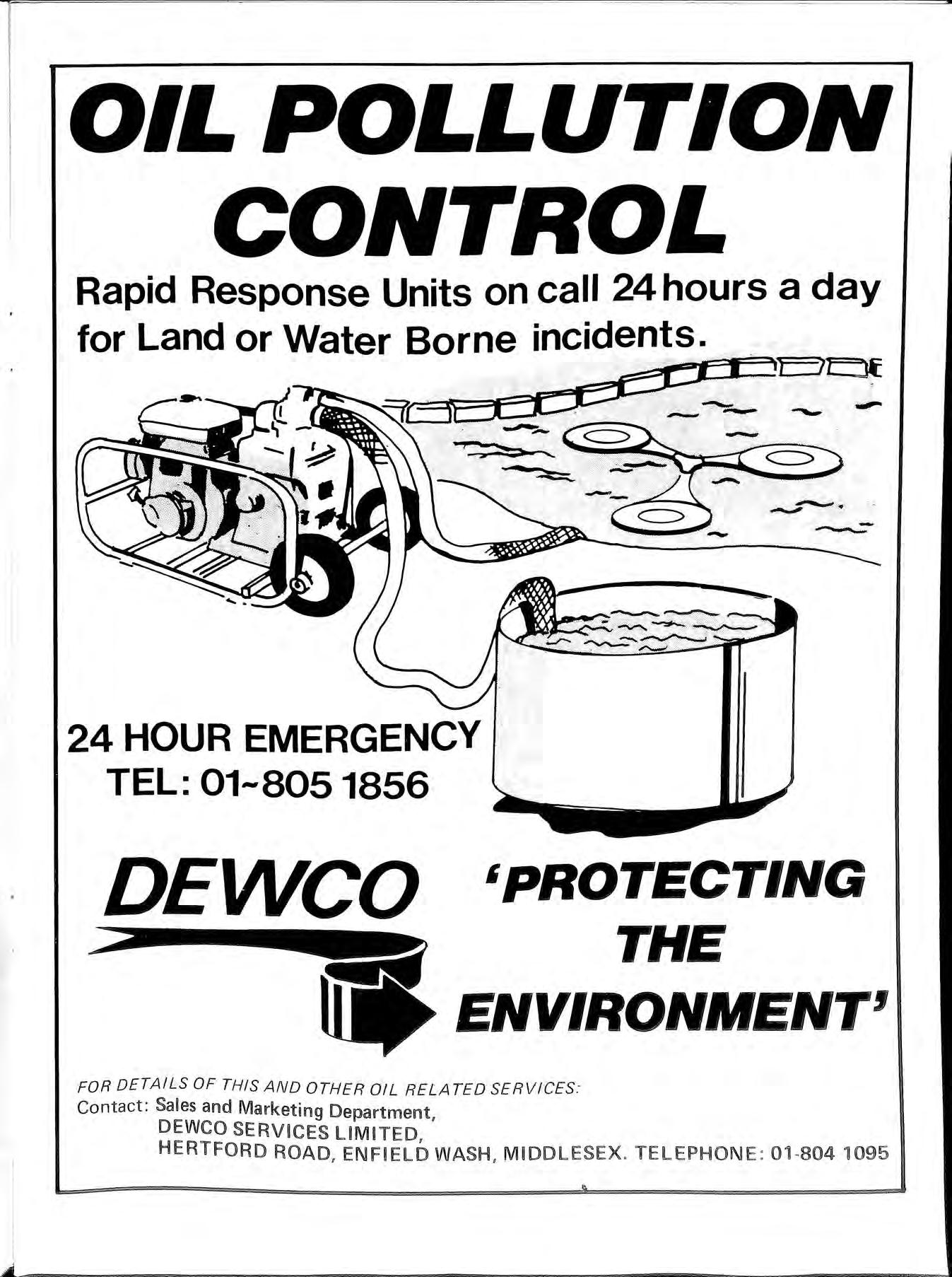 OIL POLLUTIO CONTROL Rapid Response Units on call 24 hours a day for Land or Water Borne incidents..--........... 24 HOUR EMERGENCY TEL: 01-8051856 DEWCO 'PROTECTING THE ENVIRONMENT ' FOR D E TA ILS OF T HI S AND O T H E R OIL R E LA T E D SER VI CE S : Co ntac t : Sales and Marketing Departme n t DEWCO SERV ij CES li M ITED ' H ER TFORD ROAD , ENF ij E lD WASH, T ELEP HON E: 01 804 109 5