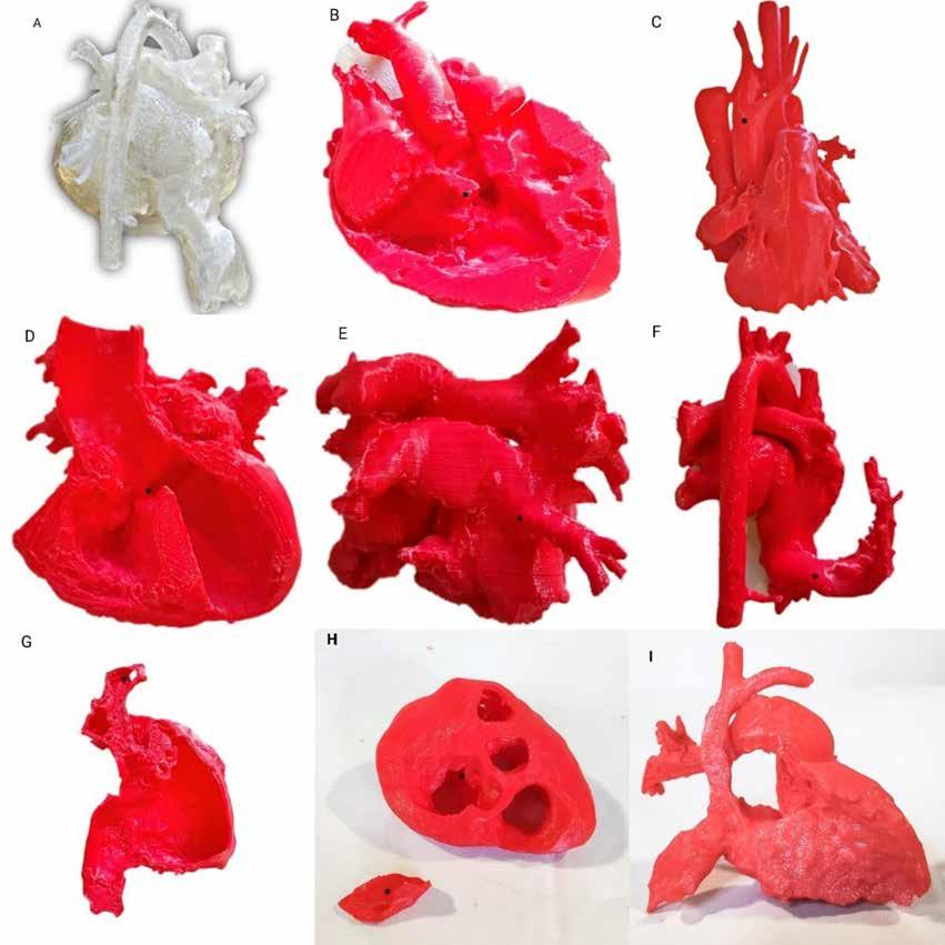 En la imagen A se observa un modelo de corazón normal desde una vista posterior, hueco en su totalidad y de material transparente, el mismo permite realizar navegaciones internas, útiles para prácticas intervencionistas. En los modelos B y D se observan sendos defectos interventriculares (asteriscos) en una Doble salida ventricular derecha (B) y en una atresia pulmonar con CIV (D). También pode-