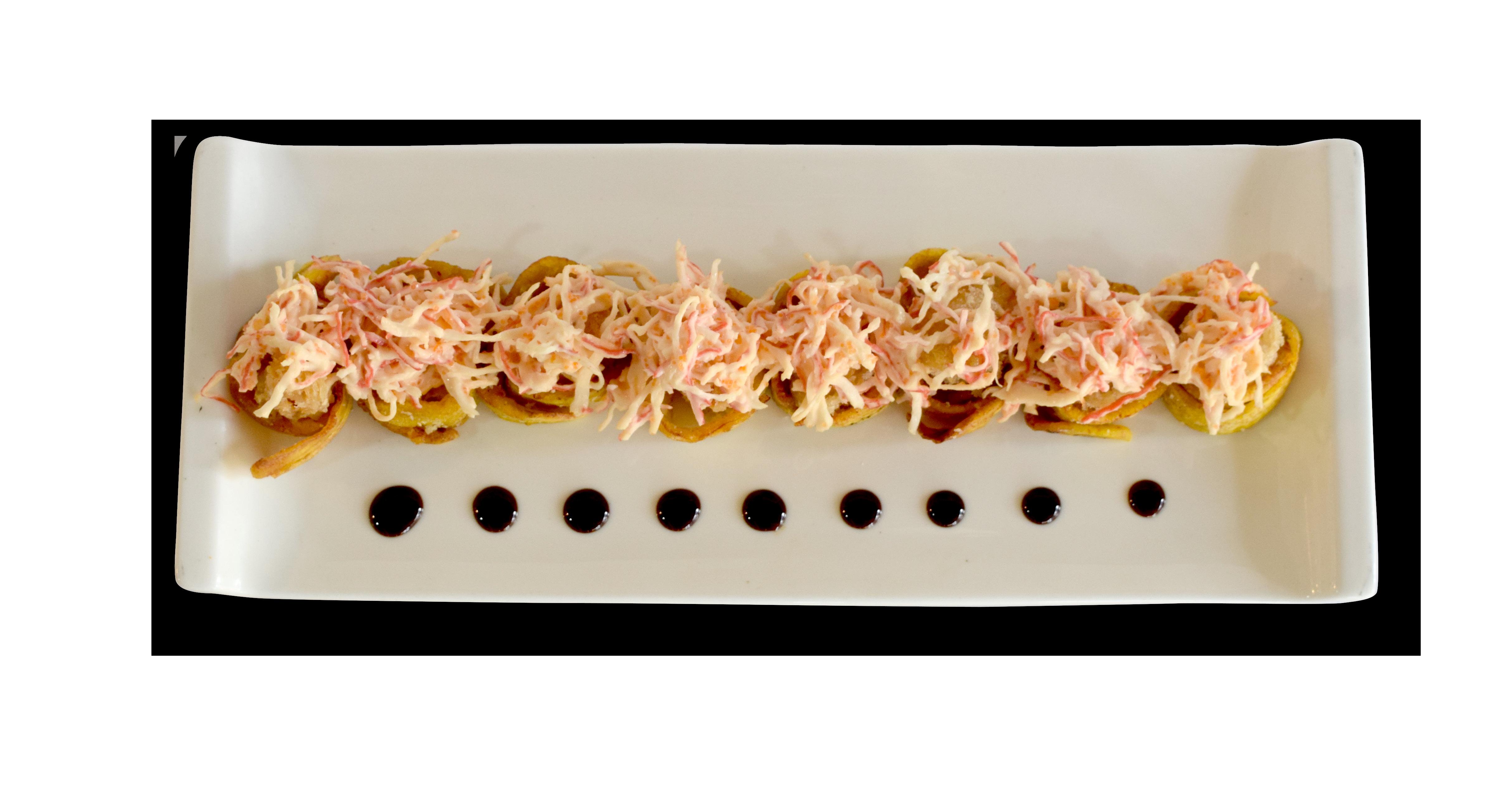 Magnificos bocados de langostinos tempura, envueltos en plátano maduro y queso Philadelphia, cubiertos con kanikama spicy de la casa y salsa teriyaki (4 unidades)