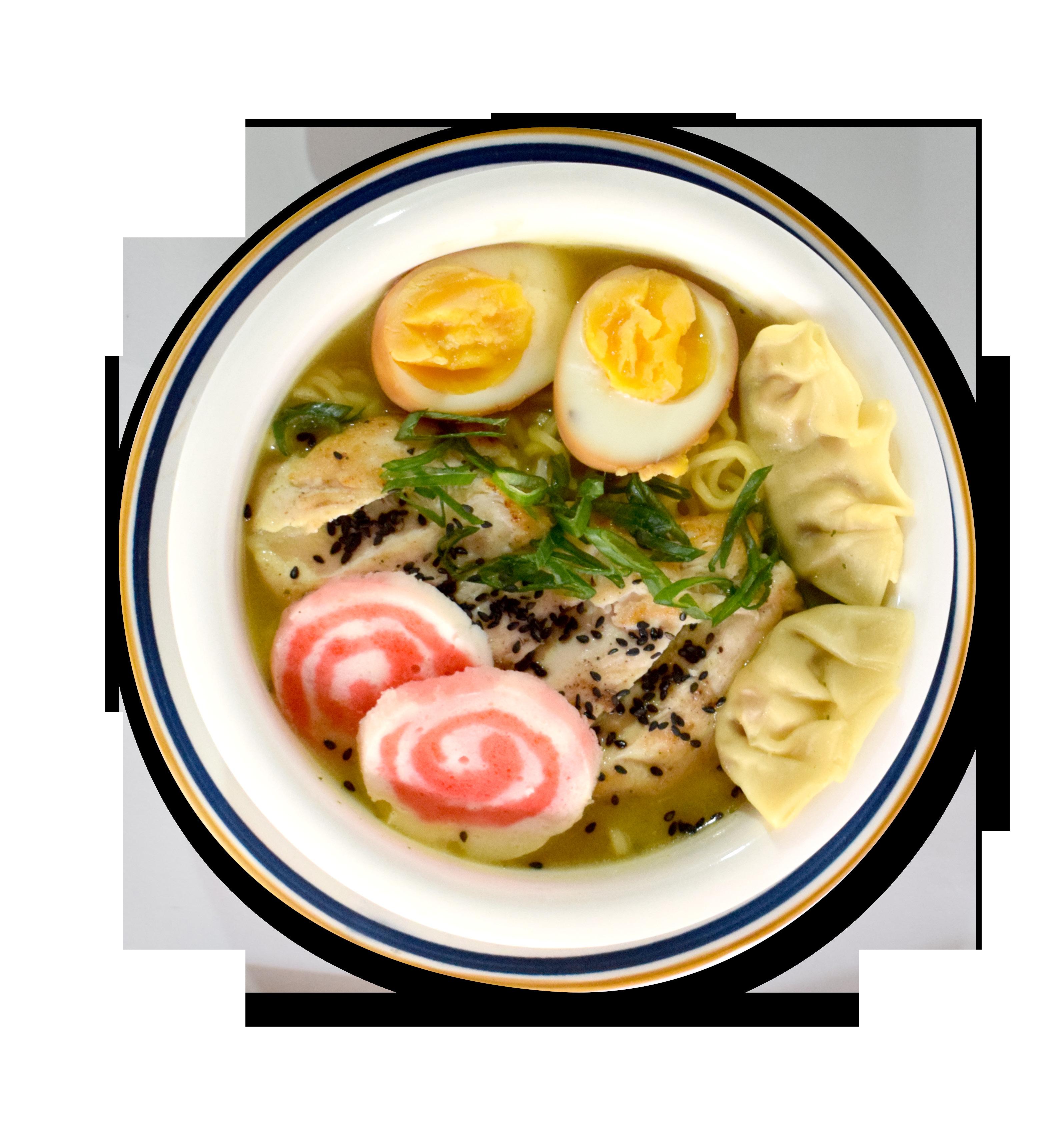 Reconfortante ramen en fondo especiado de ave, con tallarines, maki de Naruto artesanal, gyosas de pollo de la casa al vapor, pechuga de pollo, huevos cocidos y curados en salsa teriyaki y mirin, con topping de verdeo y mix de ajonjolí tostado